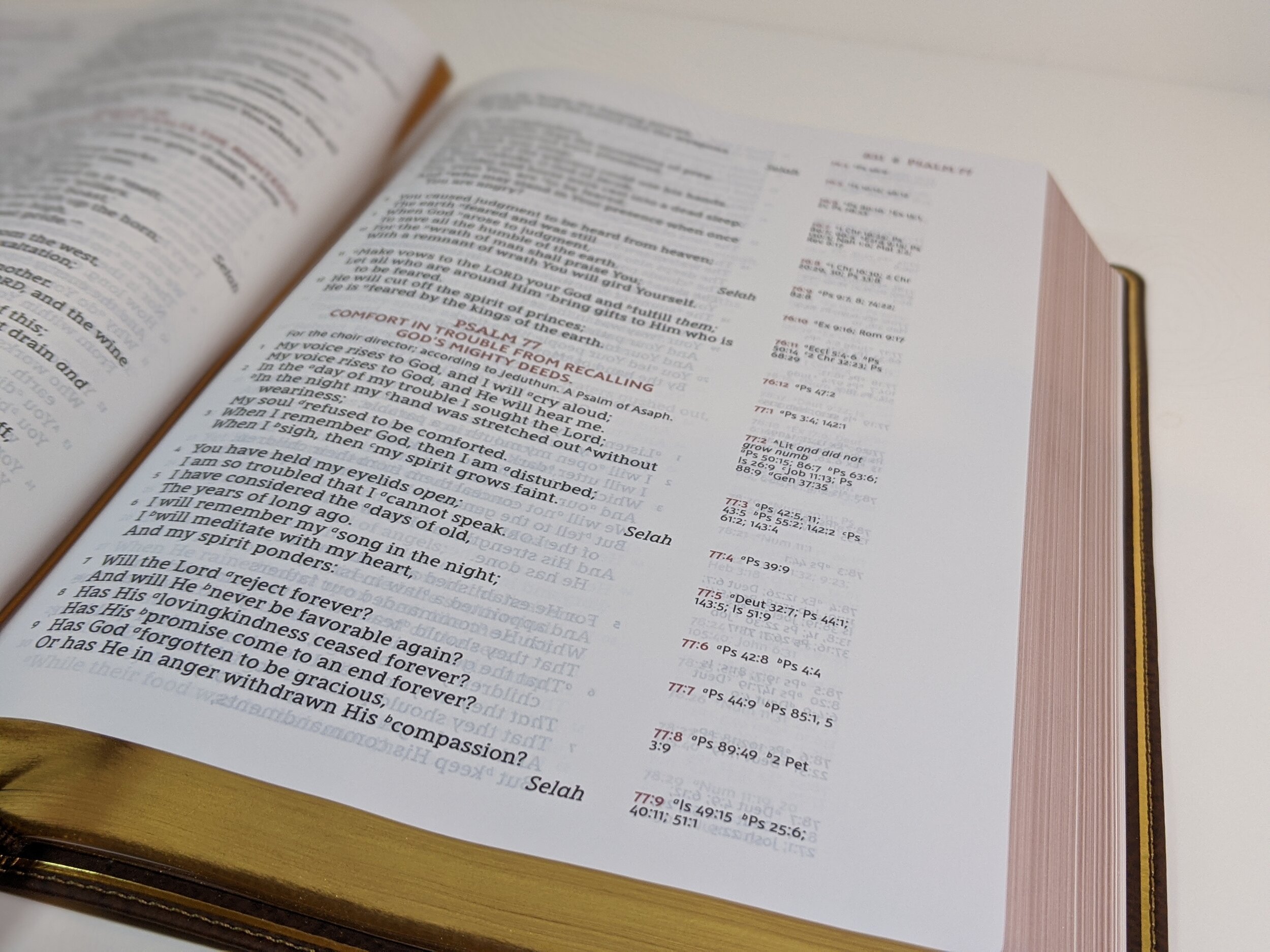 Now let me answer the why. This Bible is almost identical to it’s goatskin counterpart that costs twice as much, and in fact, I do recommend the goatskin if you want an amazing Bible that will last your lifetime and you want a really nice cover and bookmarks as well. The goatskin edition is incredibly nice. However, if you want to get this text block rebound then go for the Leathersoft. The Leathersoft is Smyth-sewn, it has the same art gilt as the goatskin, and the same paper and text block. I can’t believe the value here!