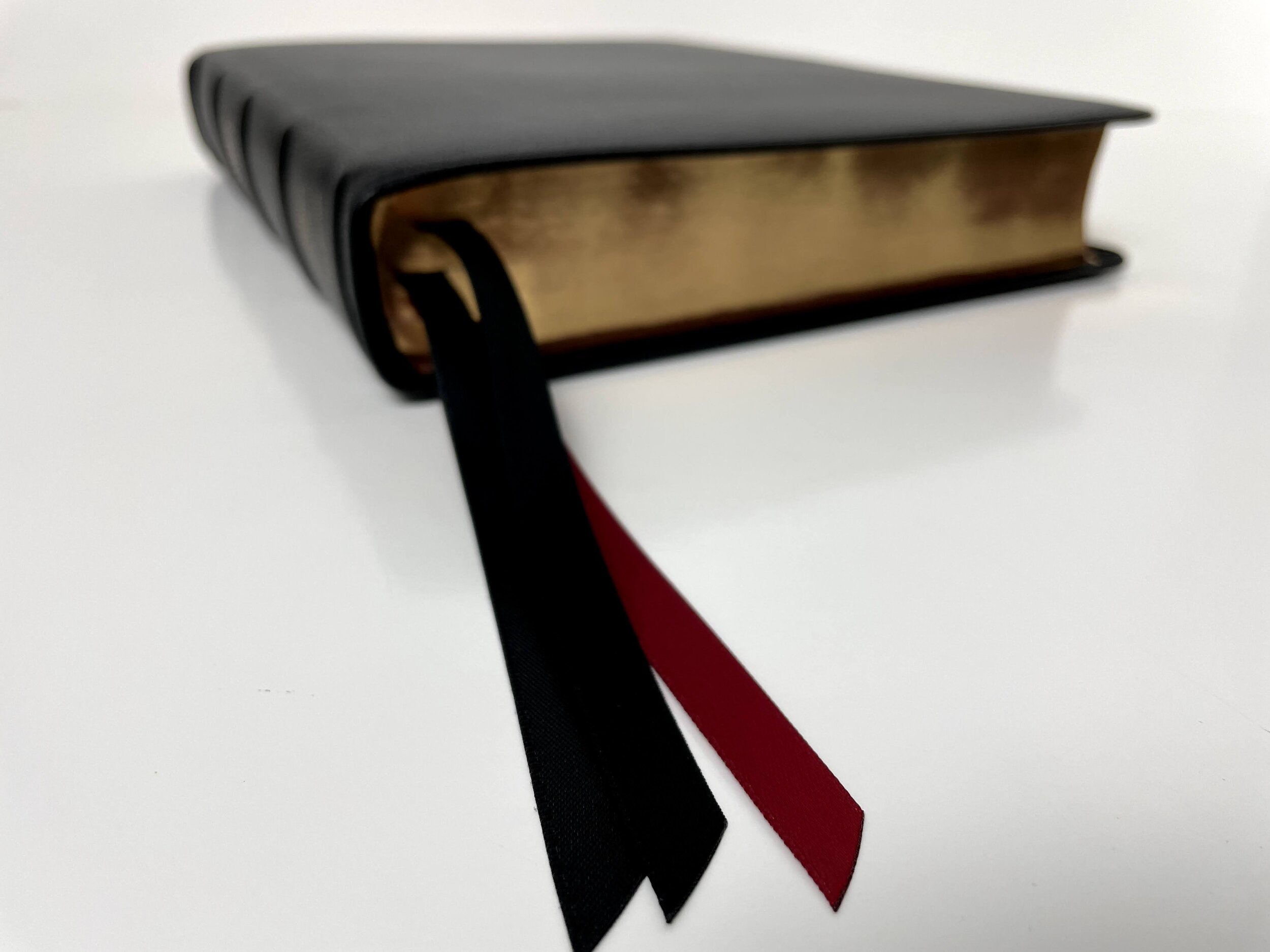 No major publisher is doing a better ribbons than Thomas Nelson in my opinion. They’re wide, long, and perfect. This Bible has three double sided satin ribbons with two being black and one being red. The page edges feature a very shiny red under gold art gilt and there are black head and tail bands.