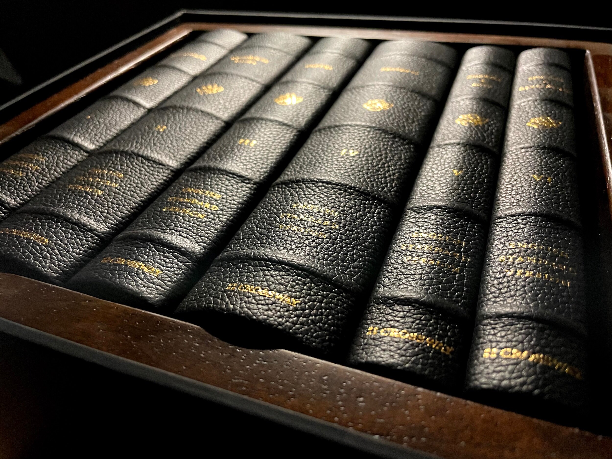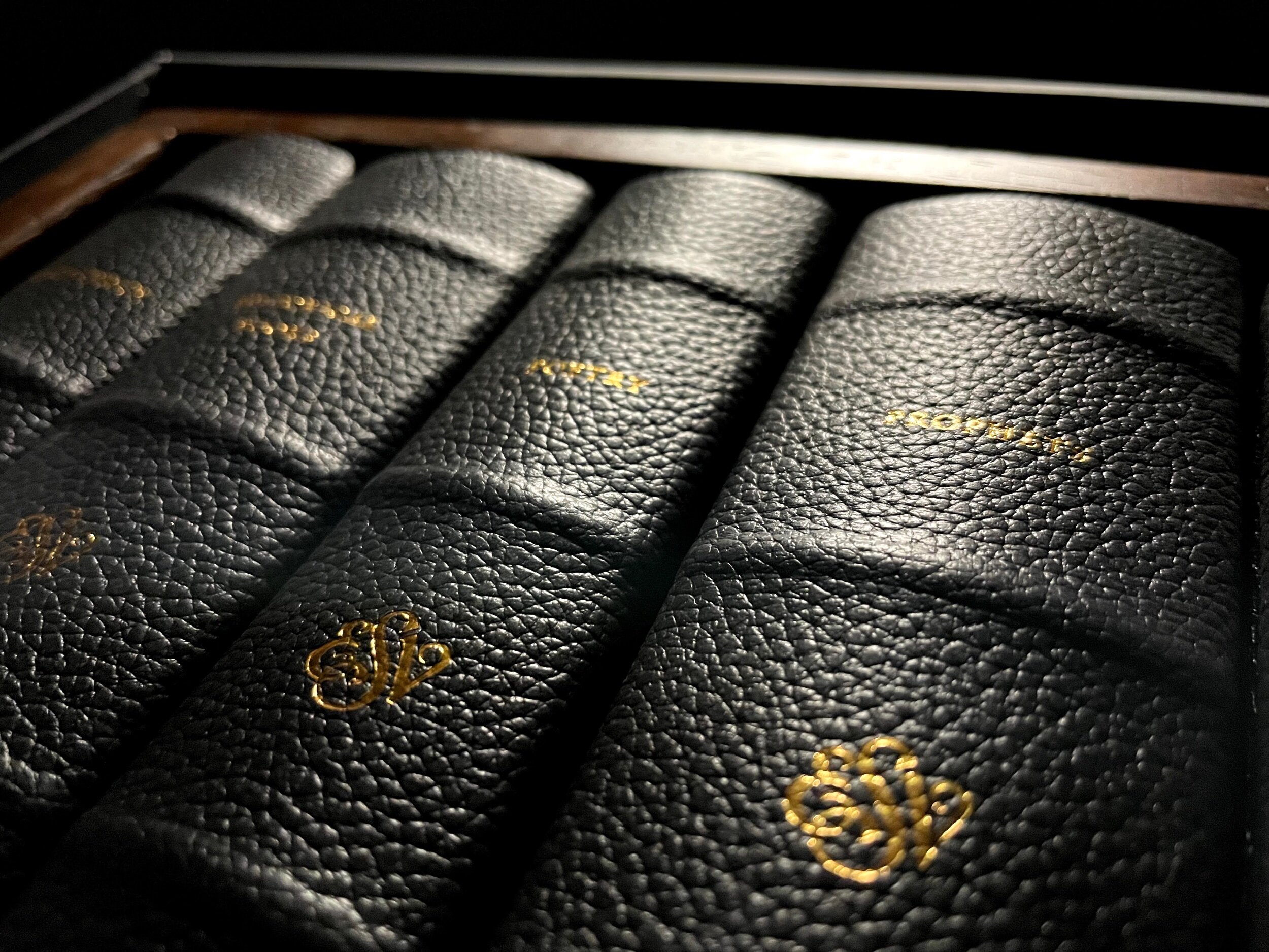 The walnut slipcase itself is beautiful. It’s a deep brown and is smooth to the touch. It will definitely be a statement piece sitting on your shelf. One thing that I appreciate is that it provides just enough wiggle room for the volumes so that you’re not trying to really wedge them in and out of the case. It doesn’t look like it’s missing a book, but it also isn’t a tight squeeze so you can actually frequently use the set.