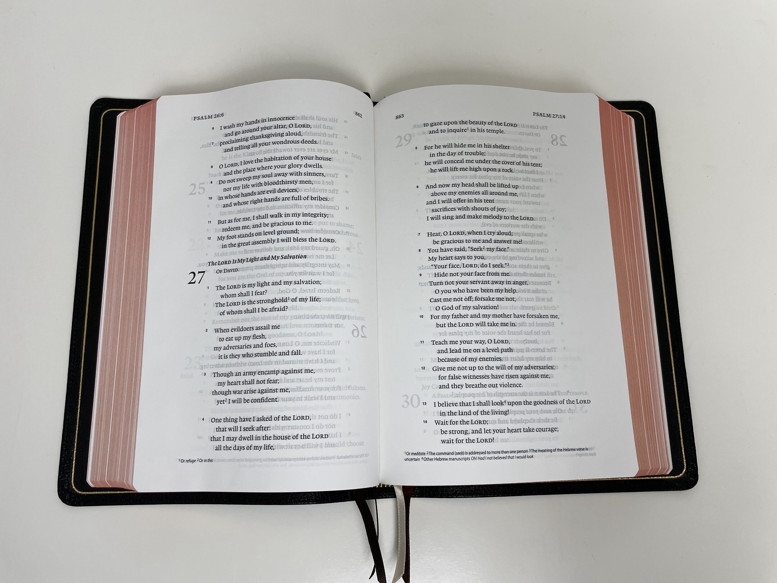 The paper is beautiful with almost no ghosting. Crossway’s website calls it a “high quality Bible paper,” but most likely it is a 28 gsm. The text is line matched. What’s really impressive for a Bible of this size is that there is a really nice margin size on all sides. Especially in the gutter, there is no risk of the text dipping in there.