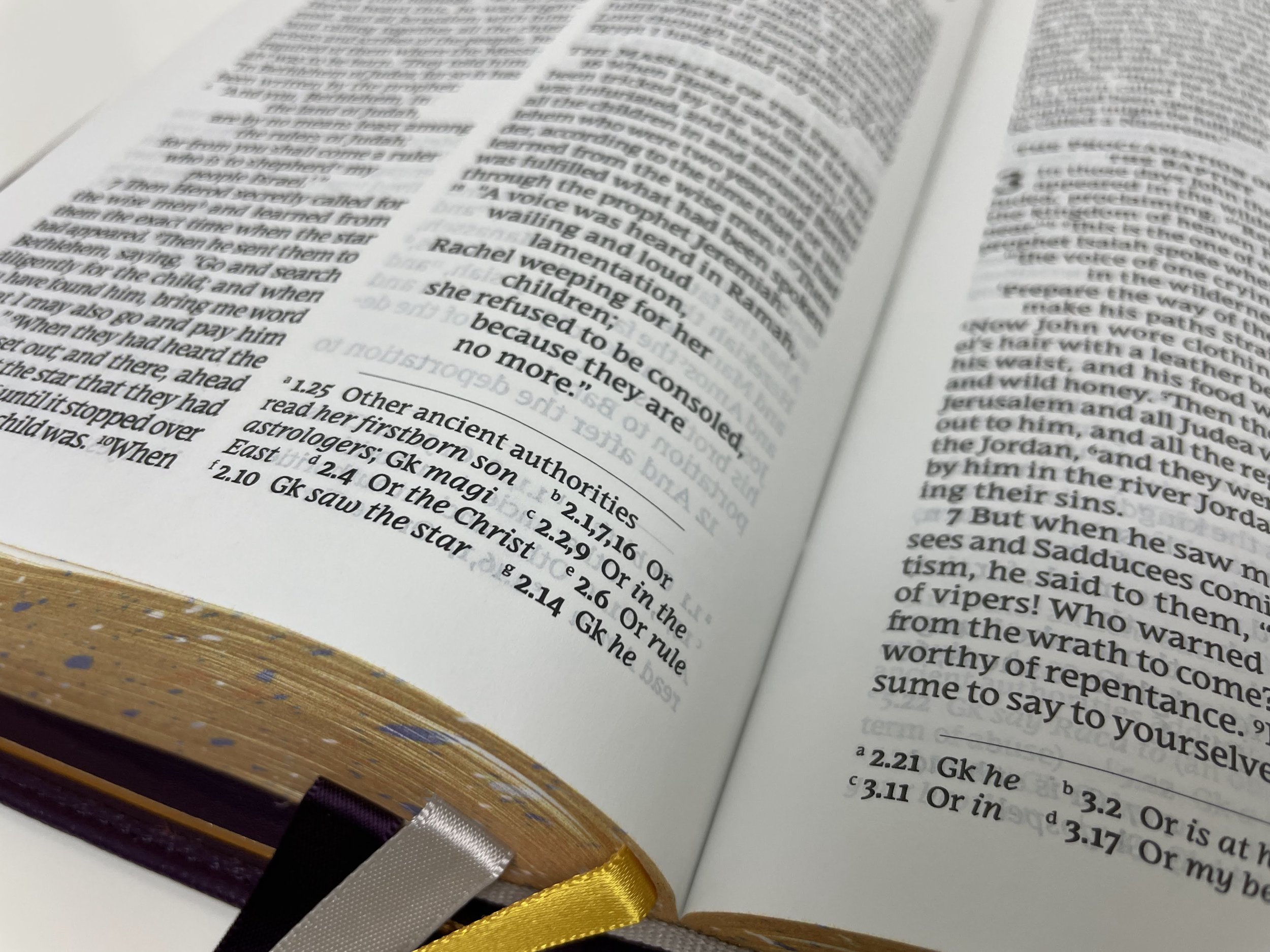 There are five raised spine hubs and printed in gold are the words “HOLY BIBLE”, “NEW REVISED STANDARD VERSION”, and “ZONDERVAN”. This Bible has white head and tail bands, which is another bold choice, but it looks great paired with the three double-sided satin ribbon markers. These ribbons are nice and long featuring purple, white, and gold colors. The bold design of this Bible just works!