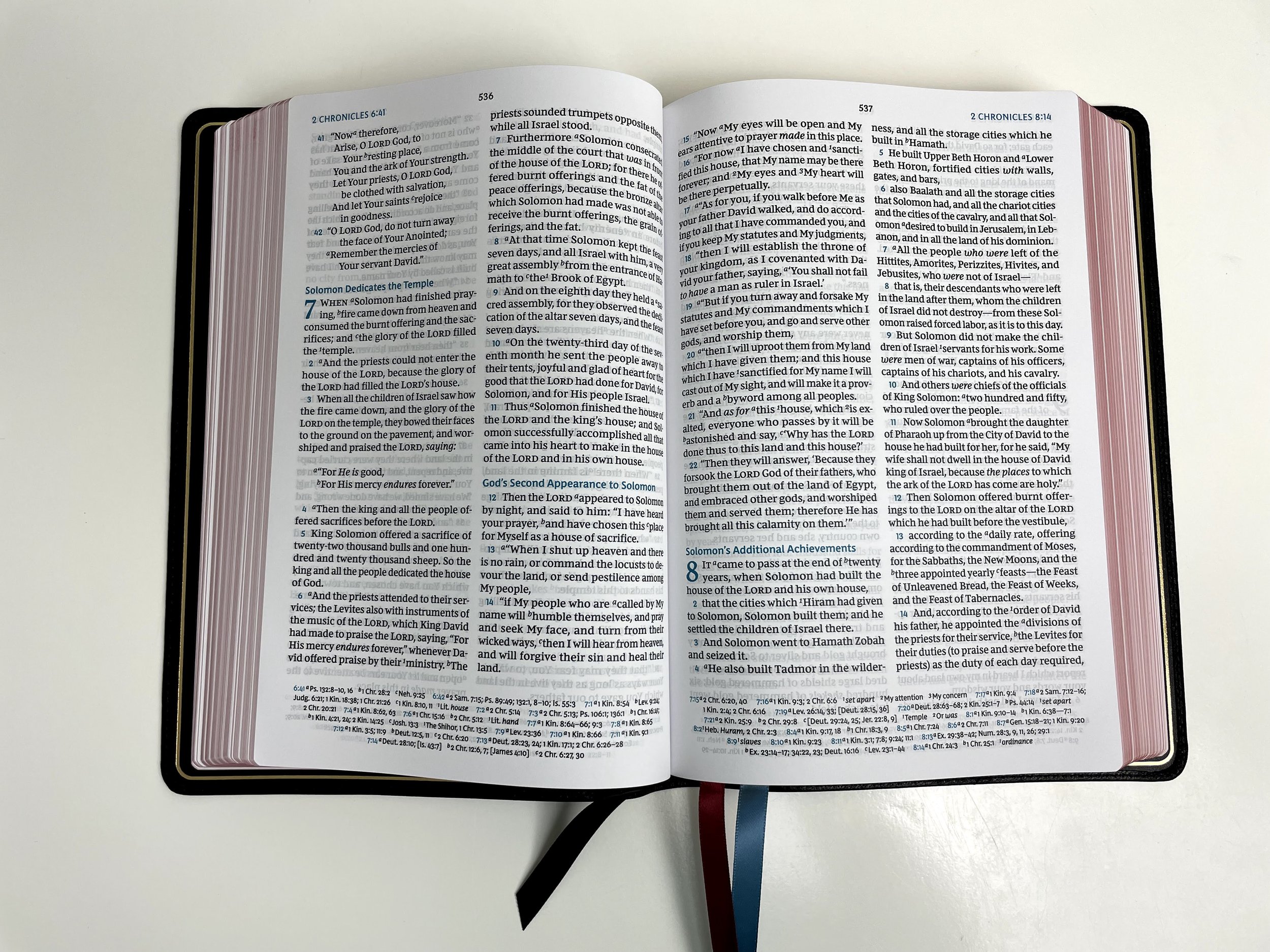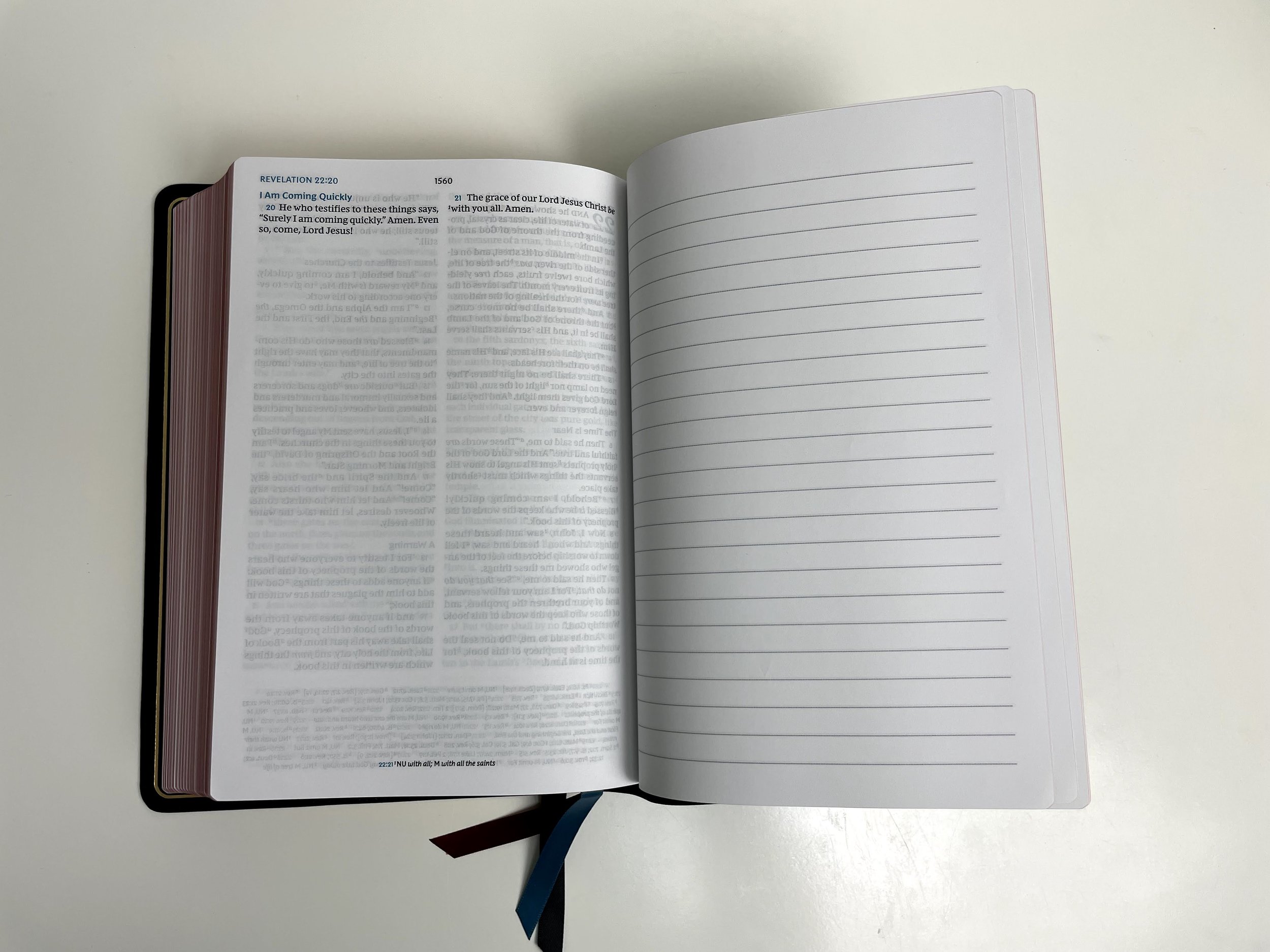 My favorite thing about this Bible has to be the layout. It’s incredible! For starters, the paper is a 36 gsm. It makes the Bible thicker, but it’s great. It’s very opaque and the text is line matched of course to help even further. There is very little show through in this Bible.