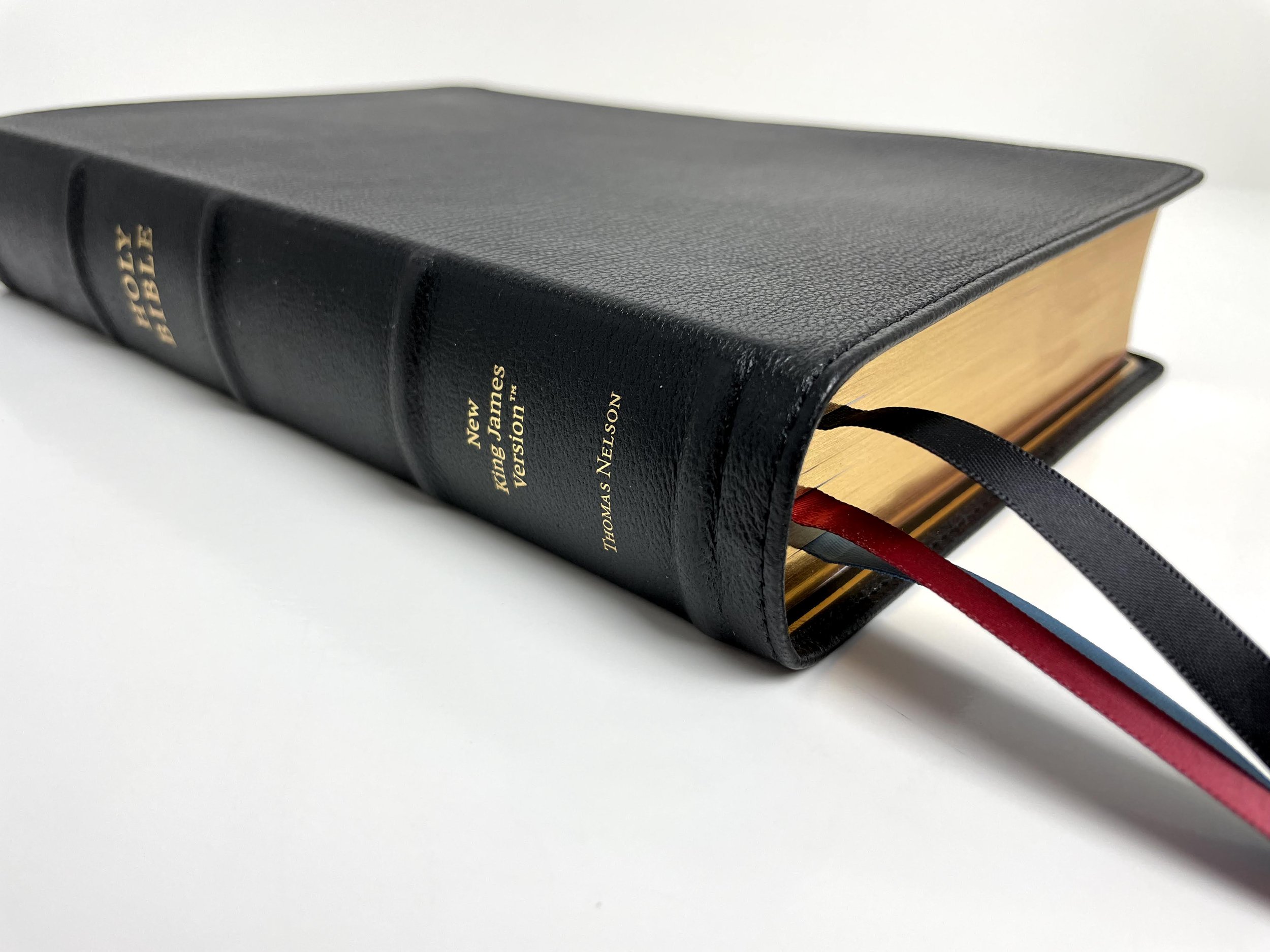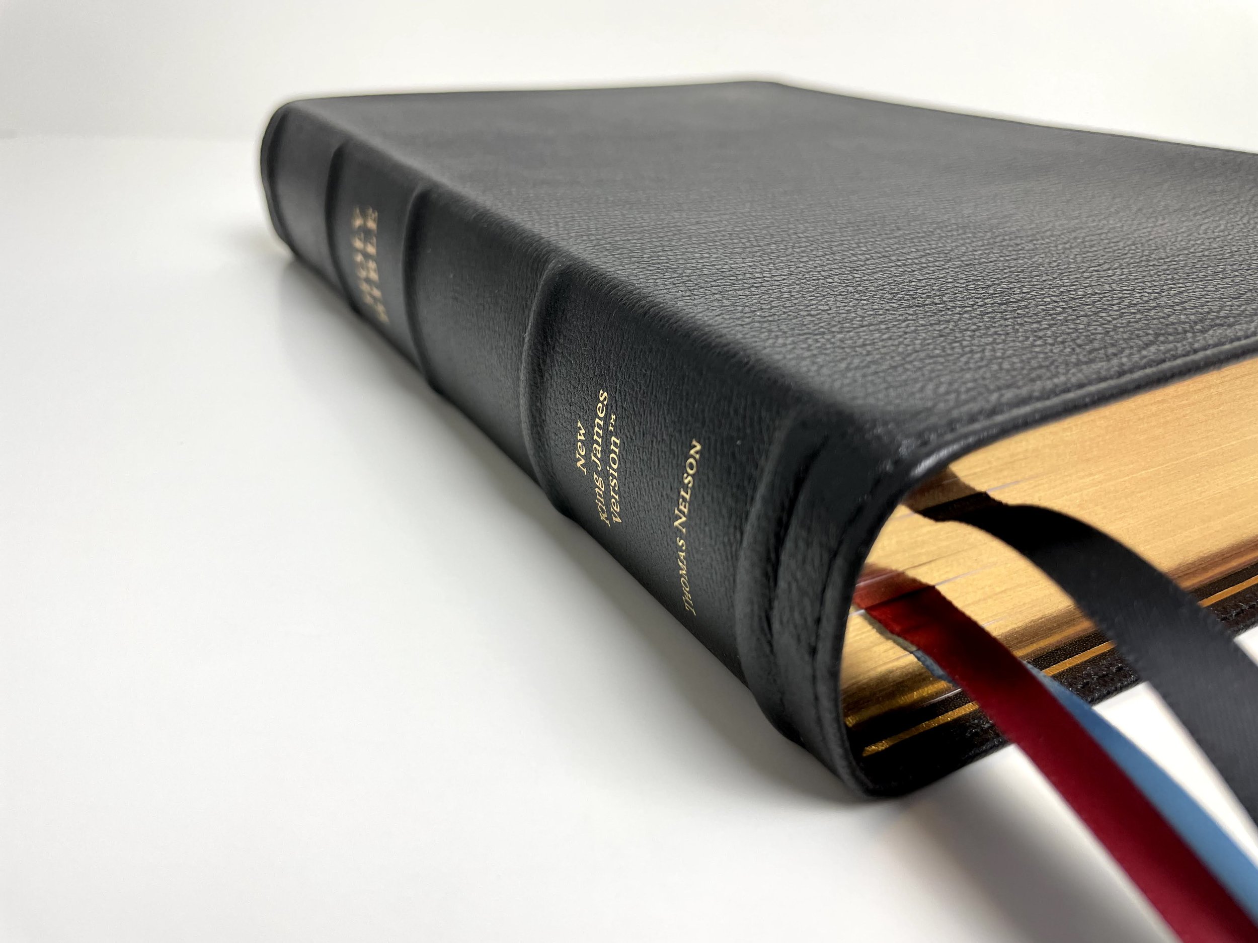 When you open it, you’ll be greeted with the amazing smell of goatskin! This is a nice, soft, flexible black goatskin. It has a great grain pattern. There are five raised spine hubs and the words “HOLY BIBLE”, “New King James Version”, and “Thomas Nelson” are printed in gold foil on the spine.