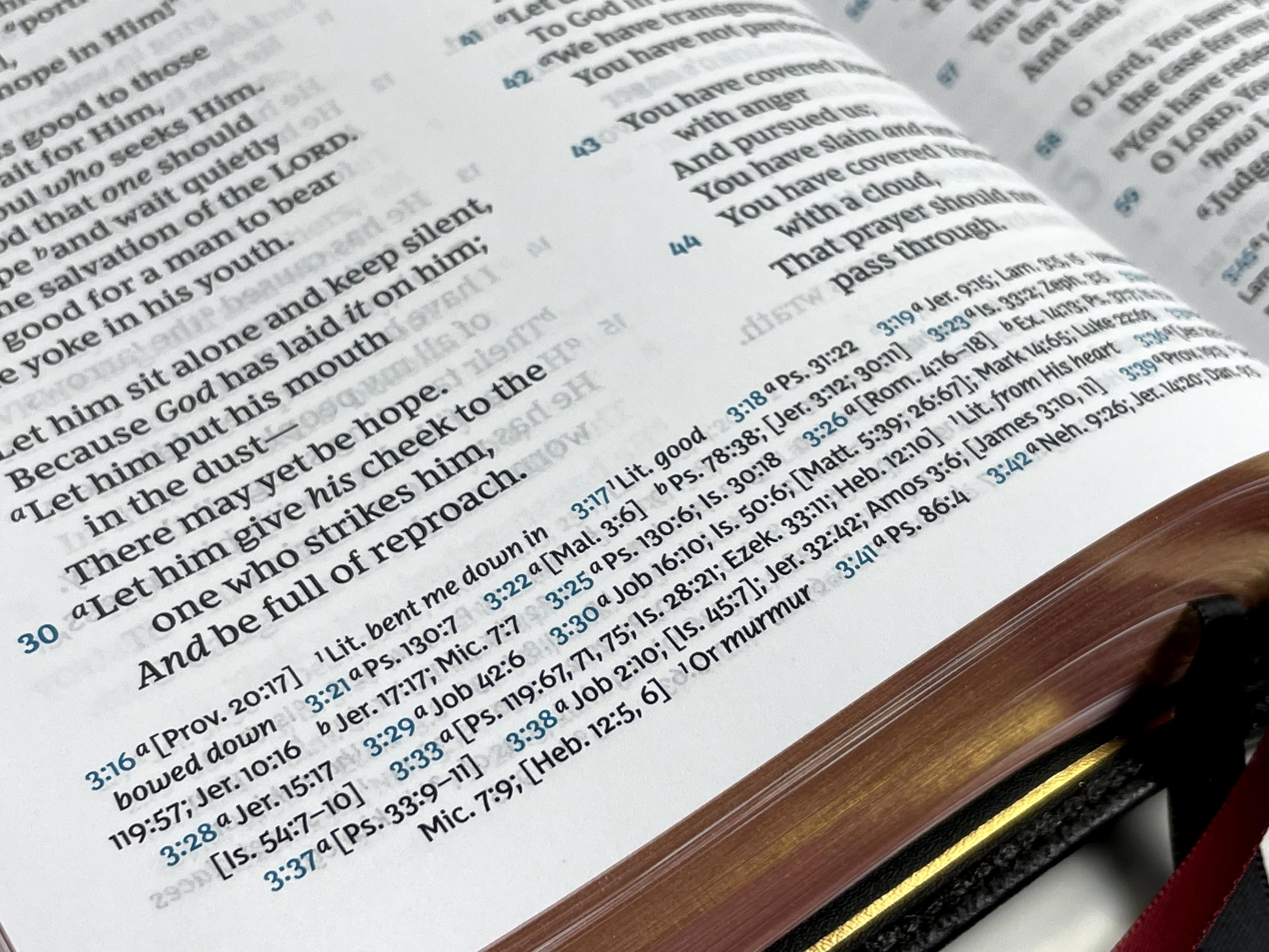 The page layout is a double column verse-by-verse. References are horizontal across the bottom. One thing that makes this Bible great is the accent color. The subheadings, chapter numbers, verse numbers, and reference numbers are all in a regal blue color. Not only is this attractive, but it also makes navigation easier. If you’re preaching, teaching, or just studying, those verse numbers really pop to help you locate what you’re looking for quickly. Also worth mentioning is that words of Christ are in black in this edition.