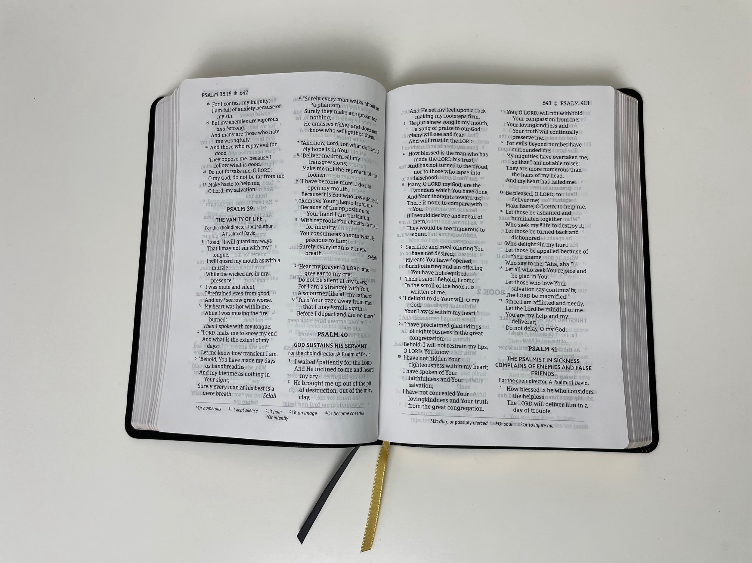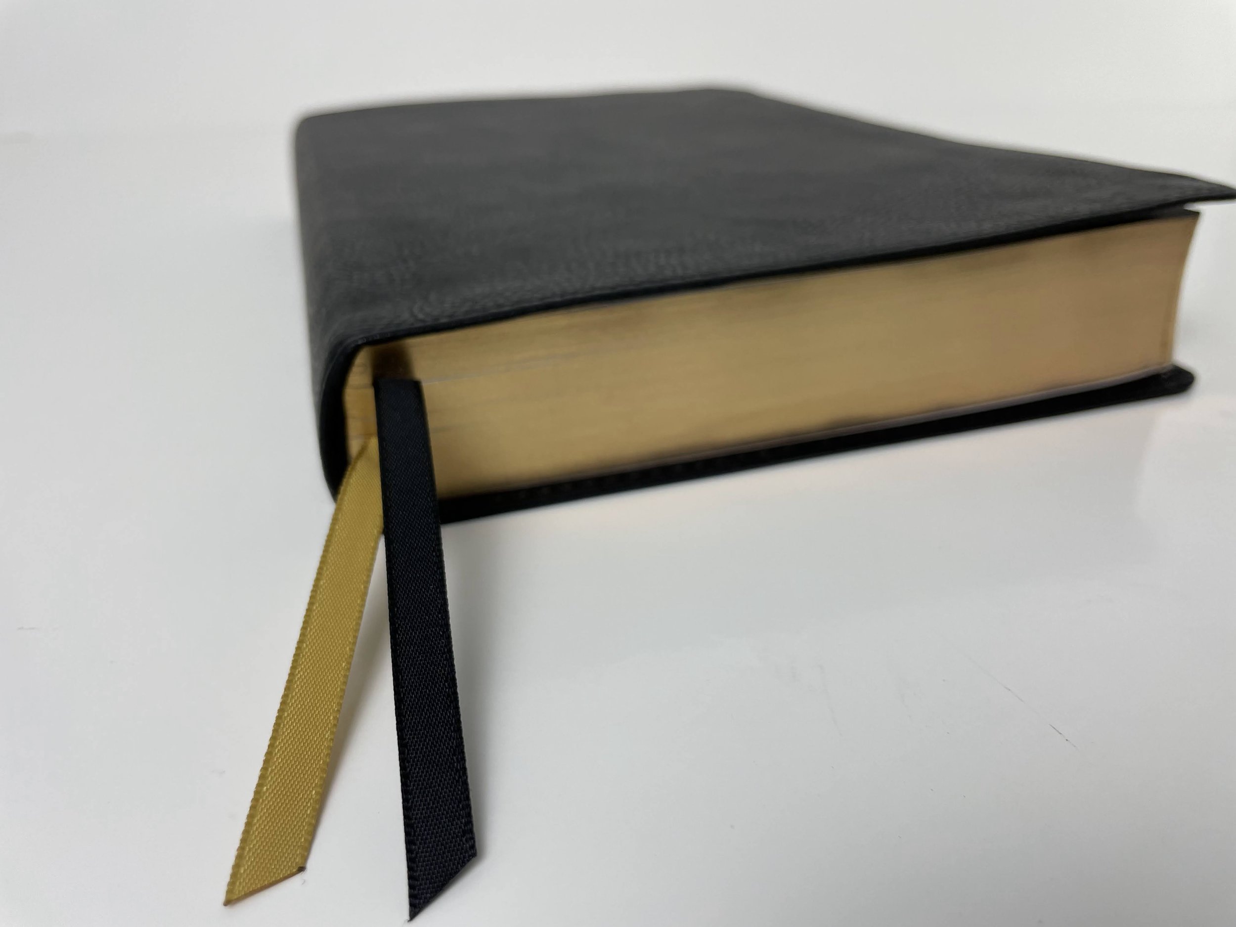 The page edges on this Bible are gold. There are black head and tail bands. There are also two narrow single sided satin ribbons. One is black and the other is gold. I love Zondervan’s higher end ribbons and I wish they had went all out with their ribbons even on a more budget friendly edition.