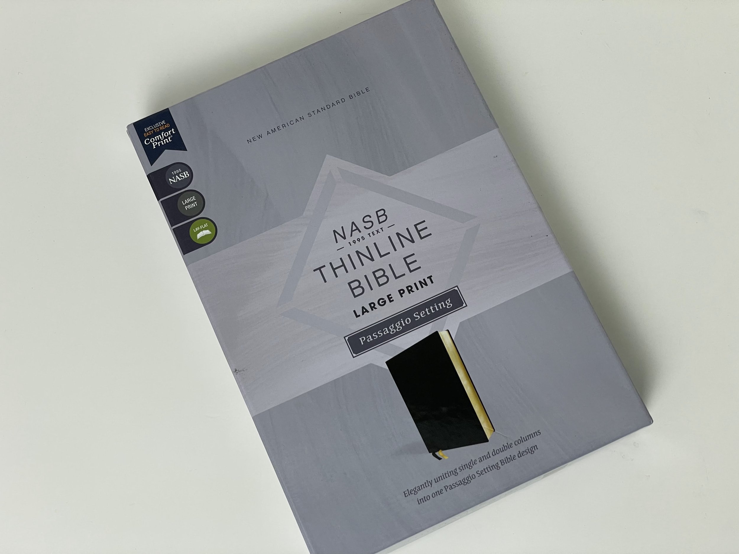 The NASB Large Print Thinline in the Passagio Setting melds a unique layout into a slim package with a large font. If you’ve ever wanted a thin (mostly) single column Bible that’s very readable then this is the Bible you’re looking for. Spoiler alert: it’s awesome.