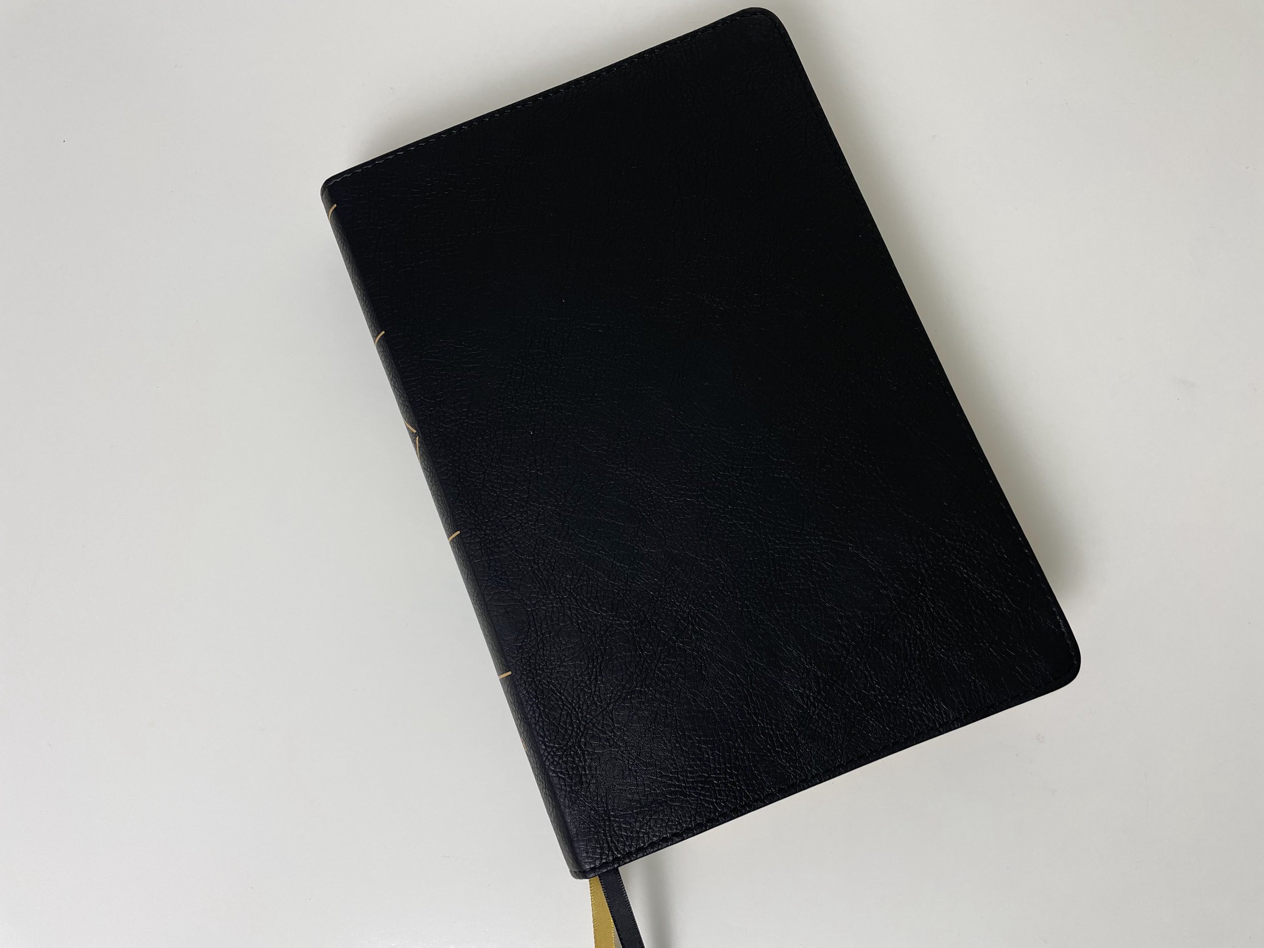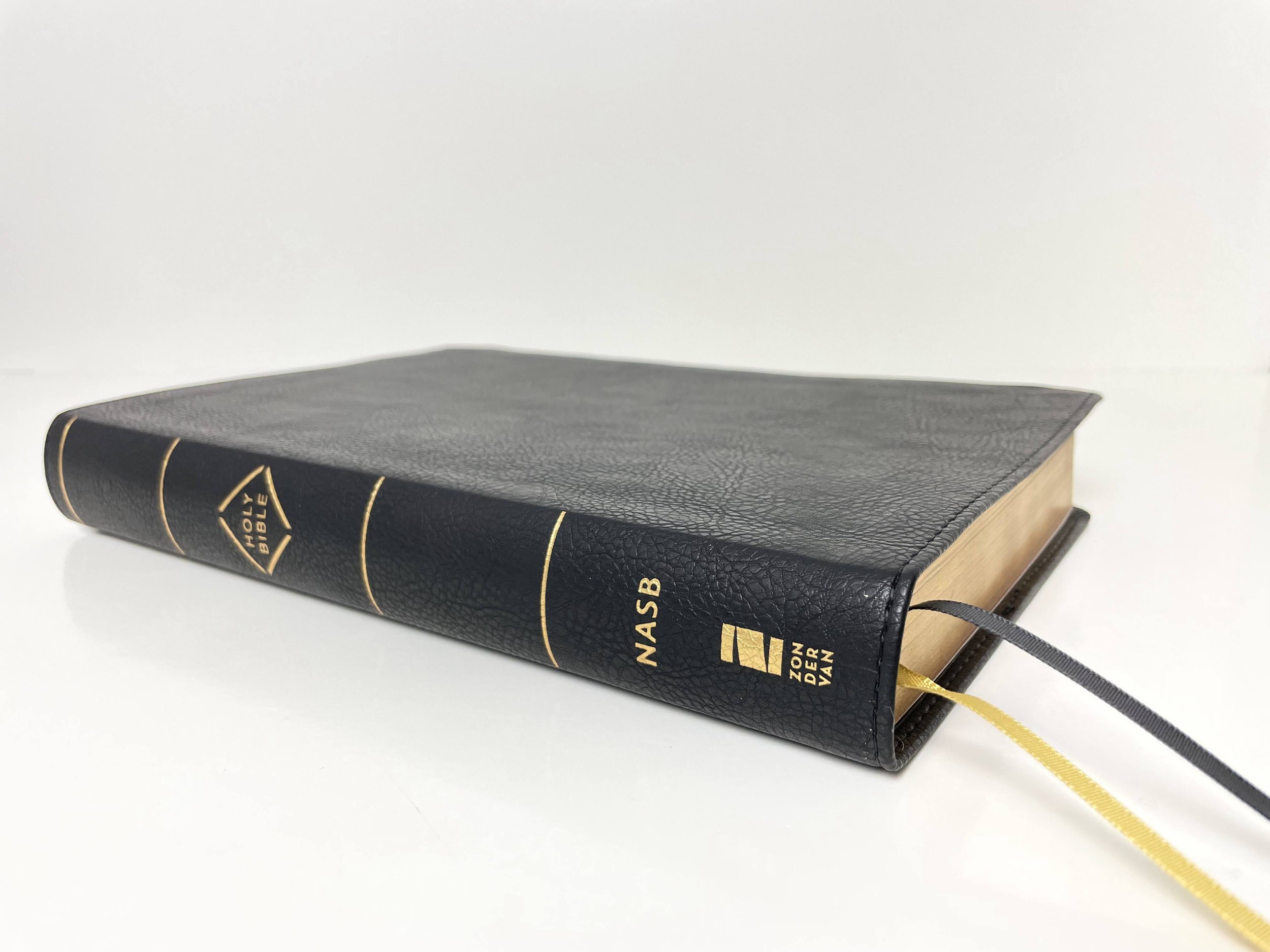 The black Leathersoft on this Bible actually feels really nice. It’s flexible and has a really nice grain pattern on it. I’ve said it before, but fake leather is getting really, really good. The spine has four gold lines printed on it. There is also a diamond outline in gold around the words “HOLY BIBLE.” Also in gold on the spine are “NASB” and the Zondervan logo.