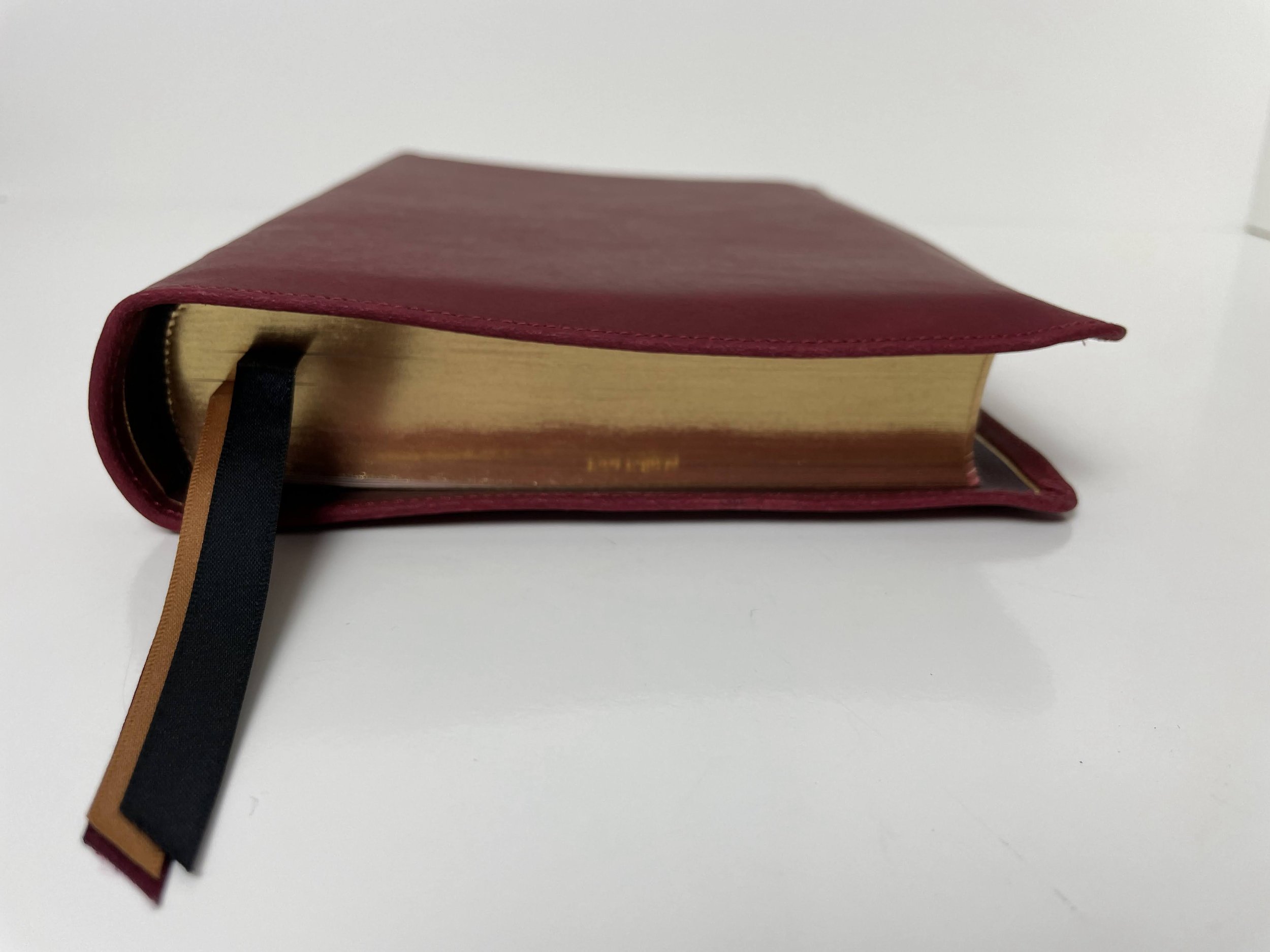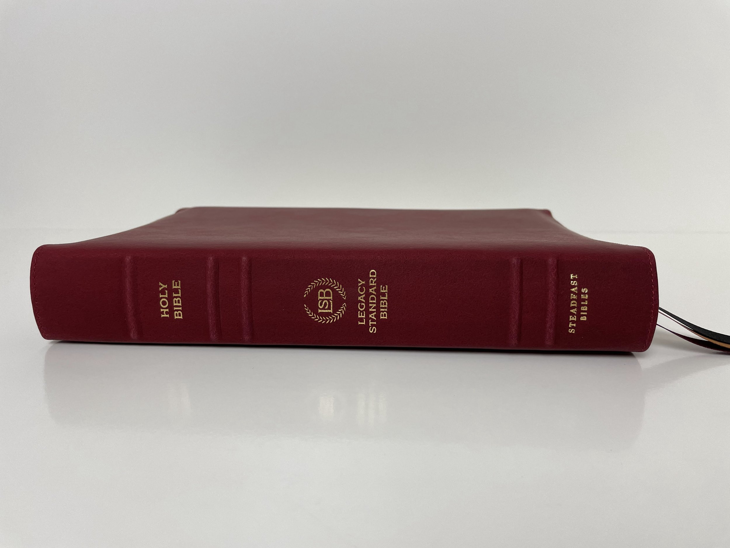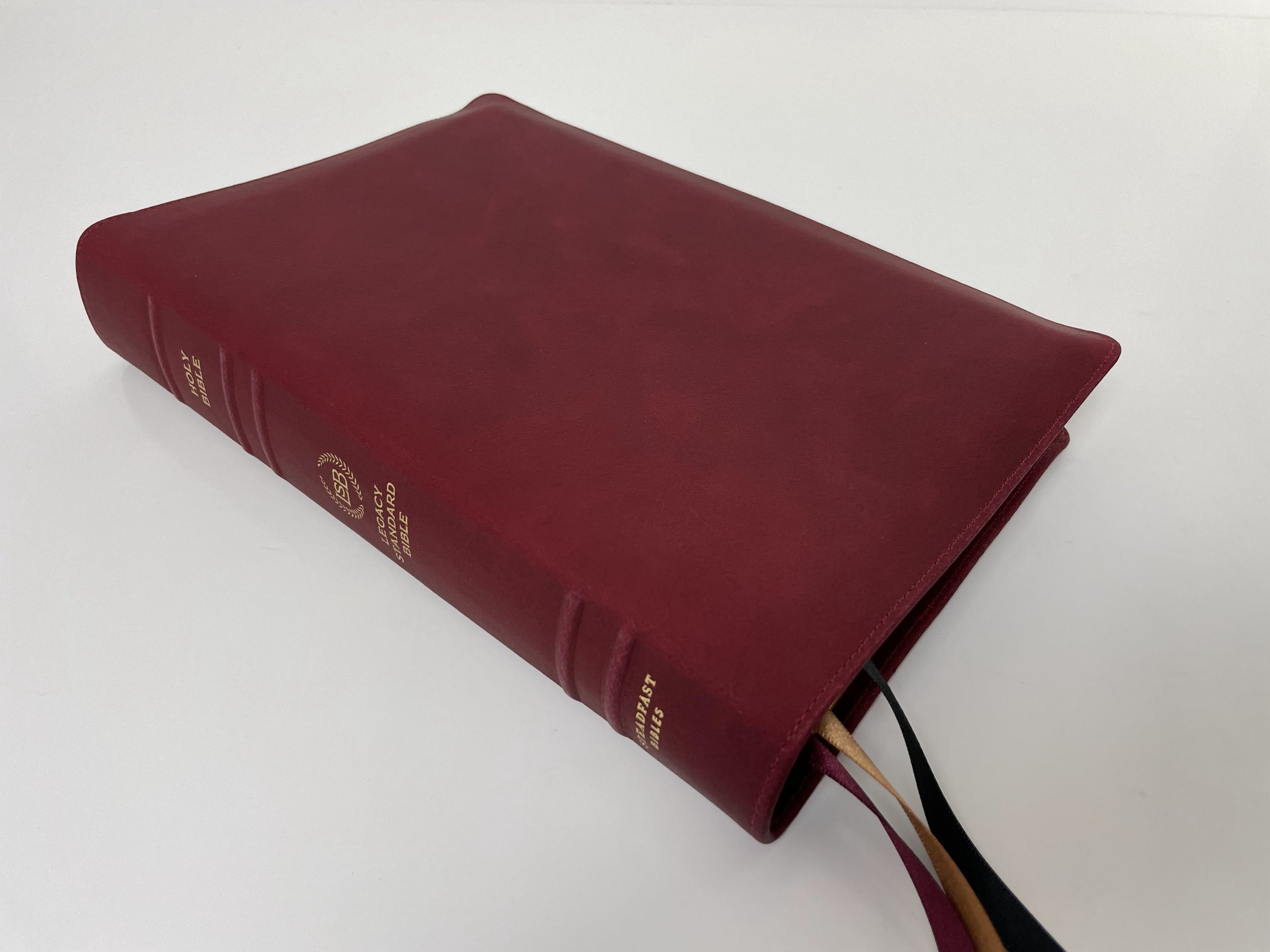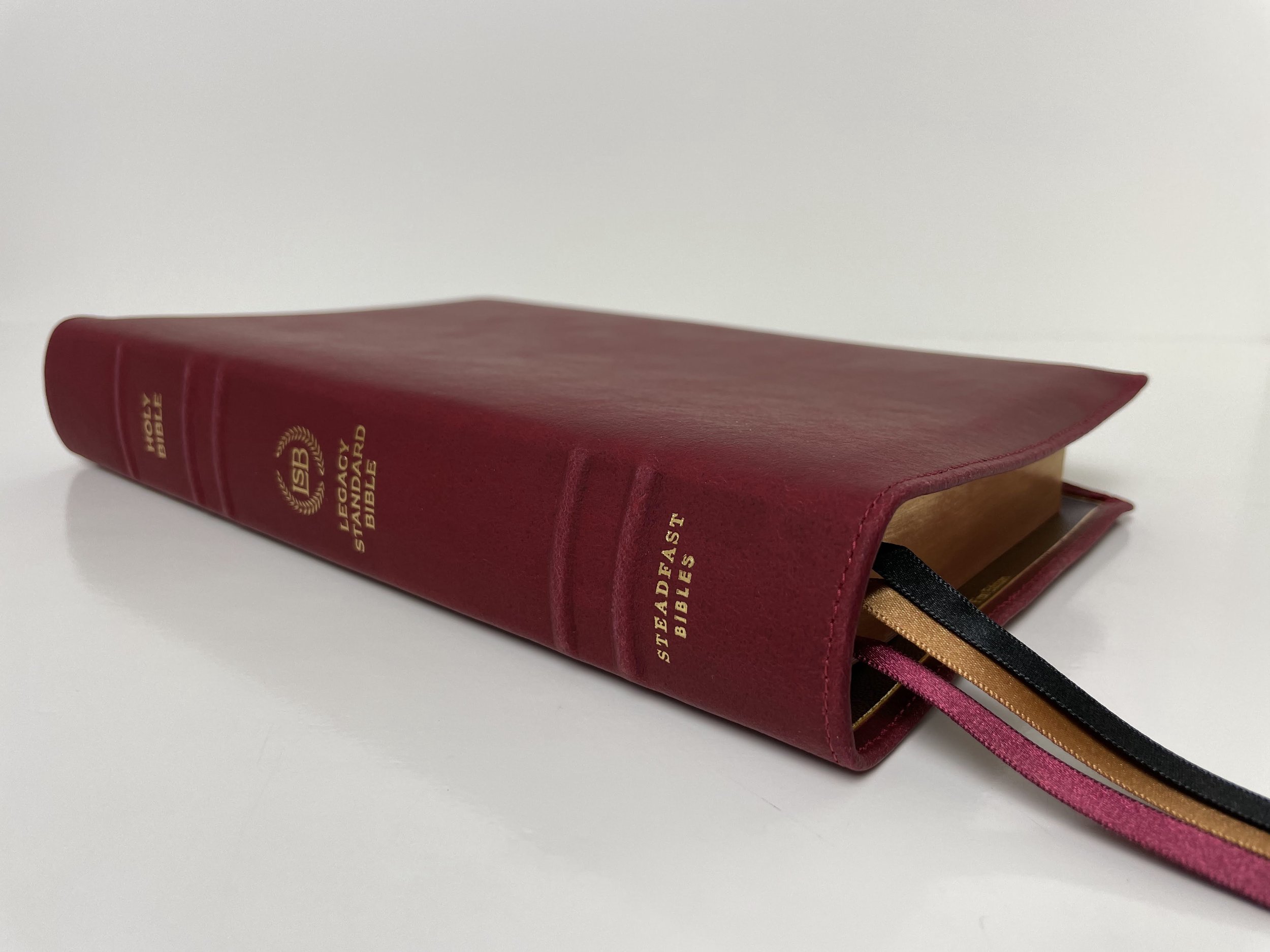 The spine has five raised hubs. Stamped in gold are the words, “HOLY BIBLE”, the LSB logo and “LEGACY STANDARD BIBLE”, and “STEADFAST BIBLES”. This Bible has black head and tail bands. The page edges are a red under gold art gilt. There are three beautiful Berisford ribbons in the colors of black, gold, and maroon. The Bible is of course Smyth-sewn and edge-lined for durability.