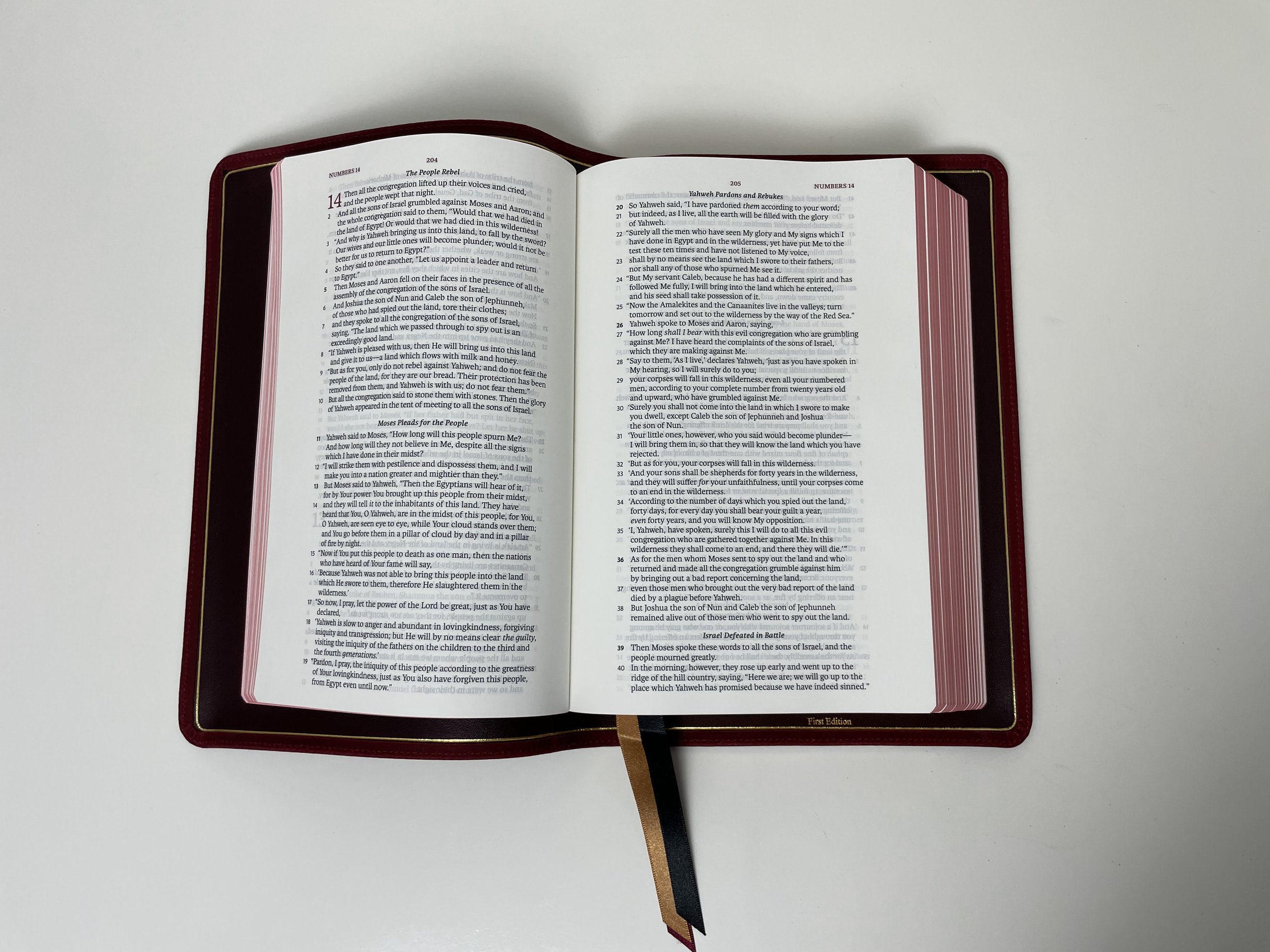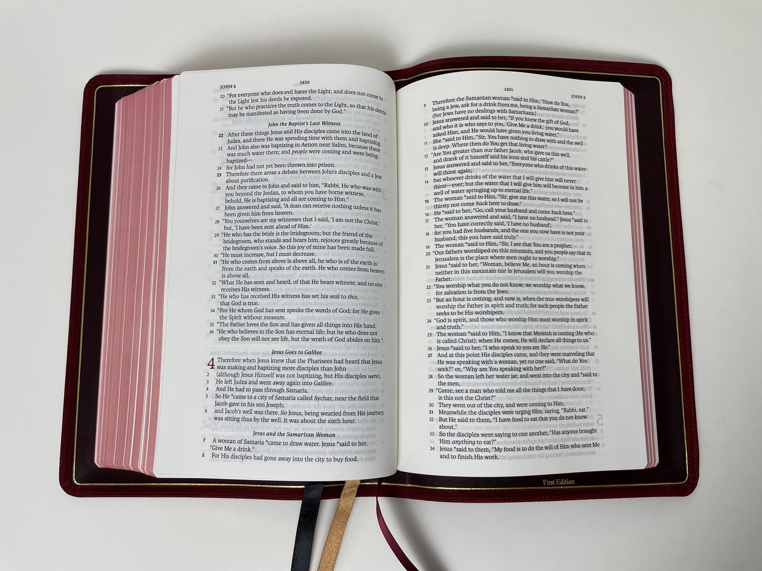 The paper is a 32GSM French-milled paper. Ghosting is there, but it’s minimal. The text being line-matched certainly helps the reading experience as well. The page setting is a single column verse-by-verse. Bold verse numbers indicate a new paragraph. Book names, page numbers are at the top center. Page headers, page numbers, and chapter numbers are all accented in maroon in this edition. There is a one inch outer margin for notes and the inner margin is generous as well. The font size is a 9.5 point, but may read a bit smaller to me.
