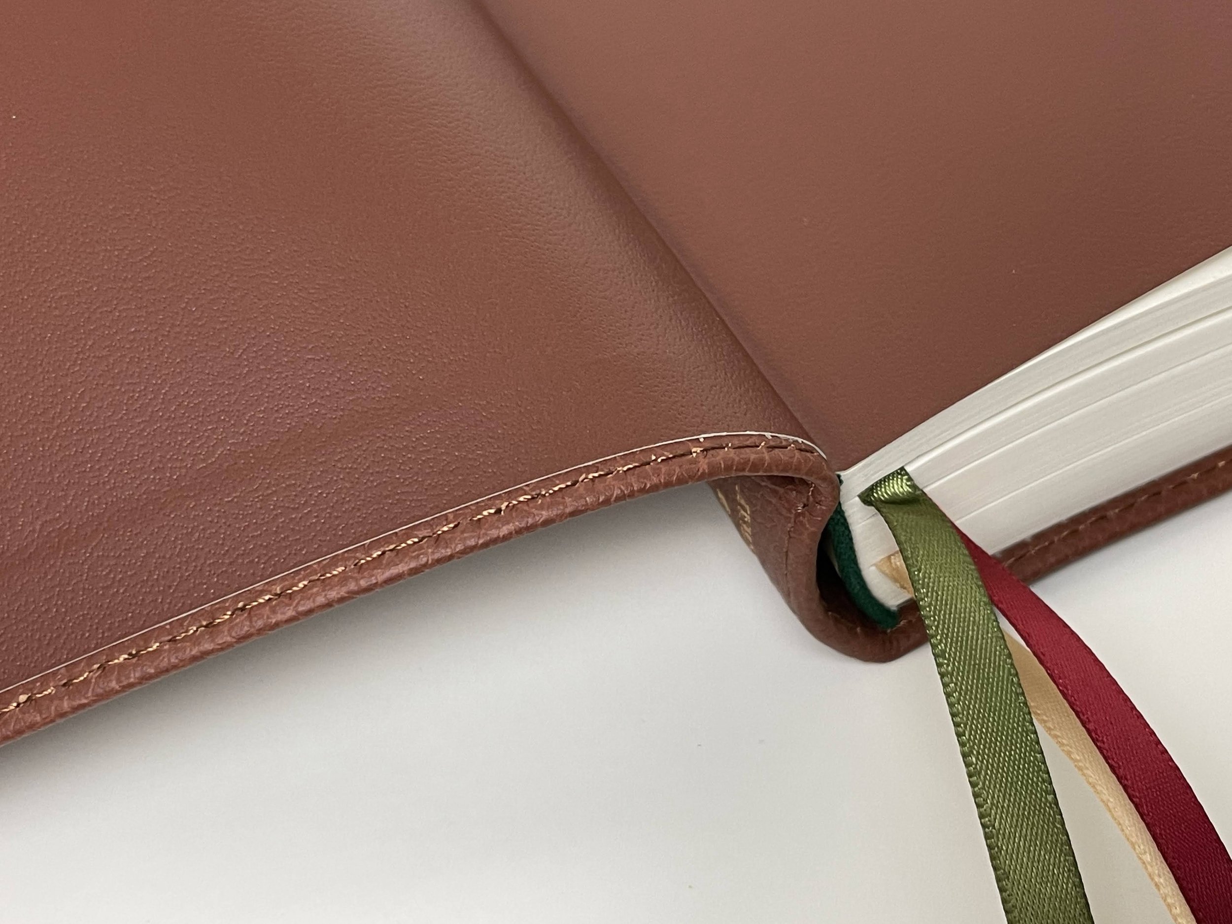 With even more detail, there are green head and tail bands. To my surprise there are three ribbon markers! I can’t believe they decided to include so many, but that’s such a great feature. Each is a different color—olive green, red, and a cream color. They really add an extra level of elegance to this book.