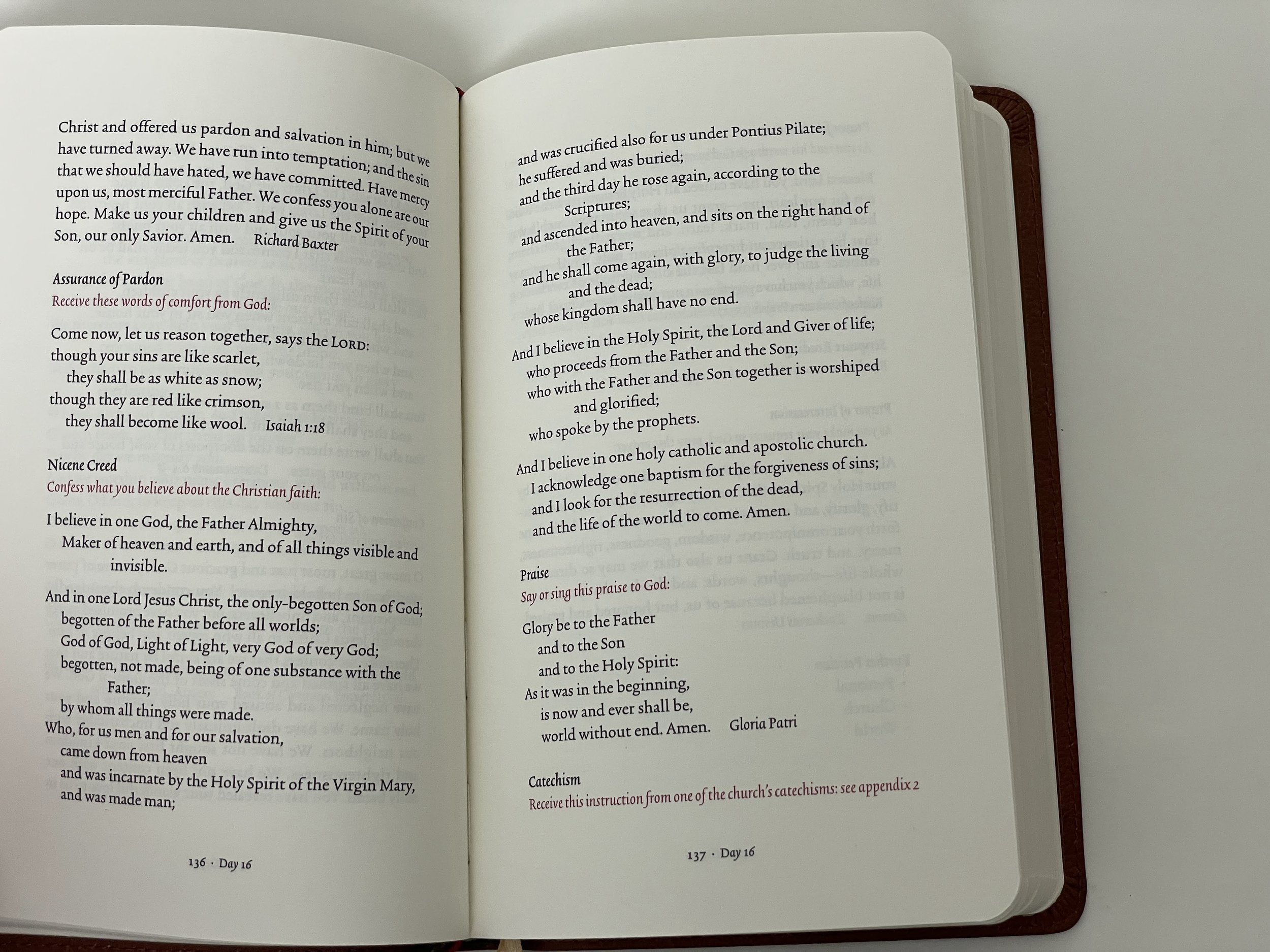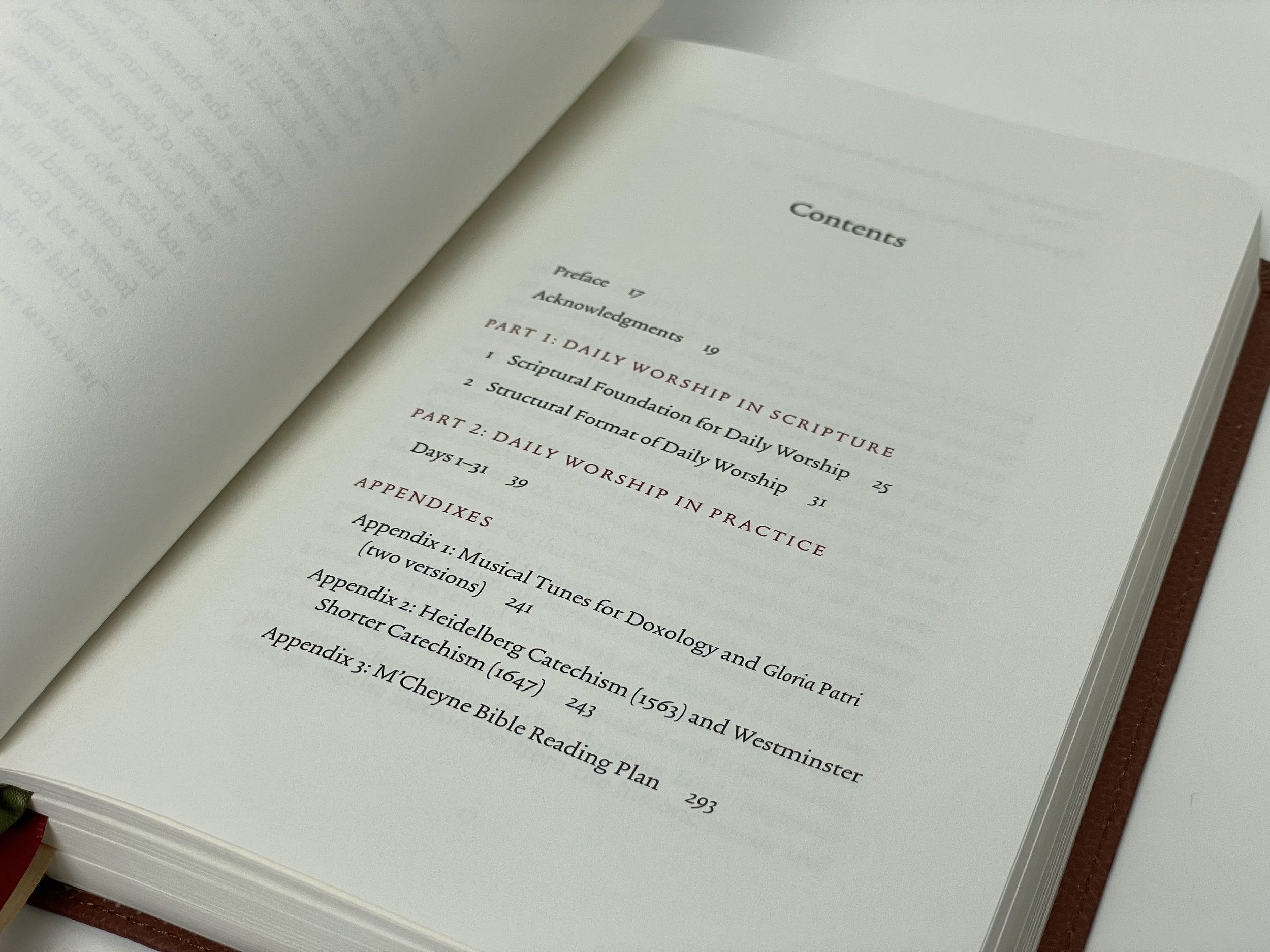 Content wise, this book has 31 days of liturgical devotions. This certainly isn’t a replacement for your daily time in Scripture, but it’s meant to supplement it and take you deeper. Each day will include prayers, pieces of Scripture, songs to sing, creeds, and catechisms. These liturgies are designed to lead you through the gospel and to the throne of grace. The back includes five Appendixes including catechisms, a Bible reading plan, and other features.