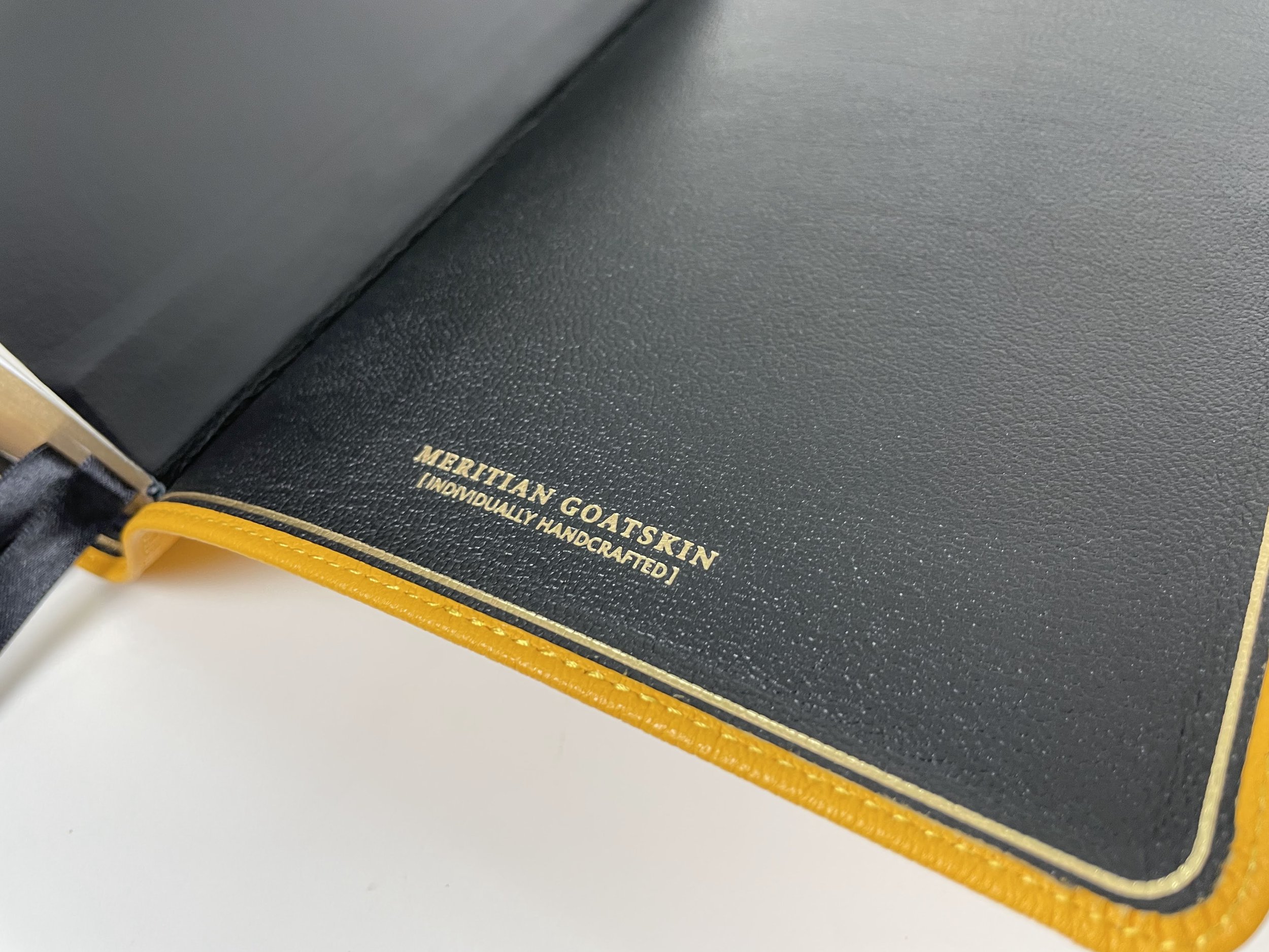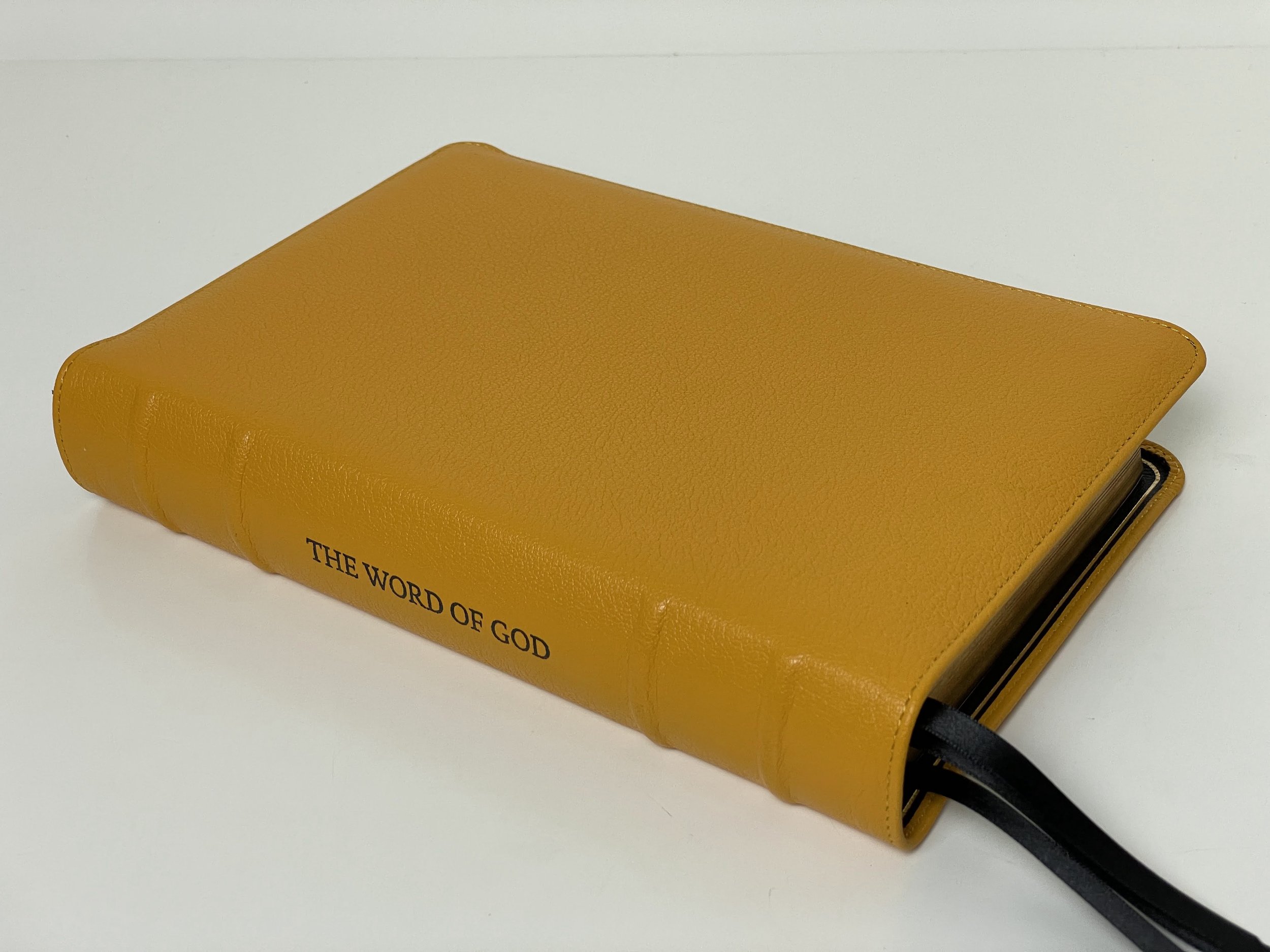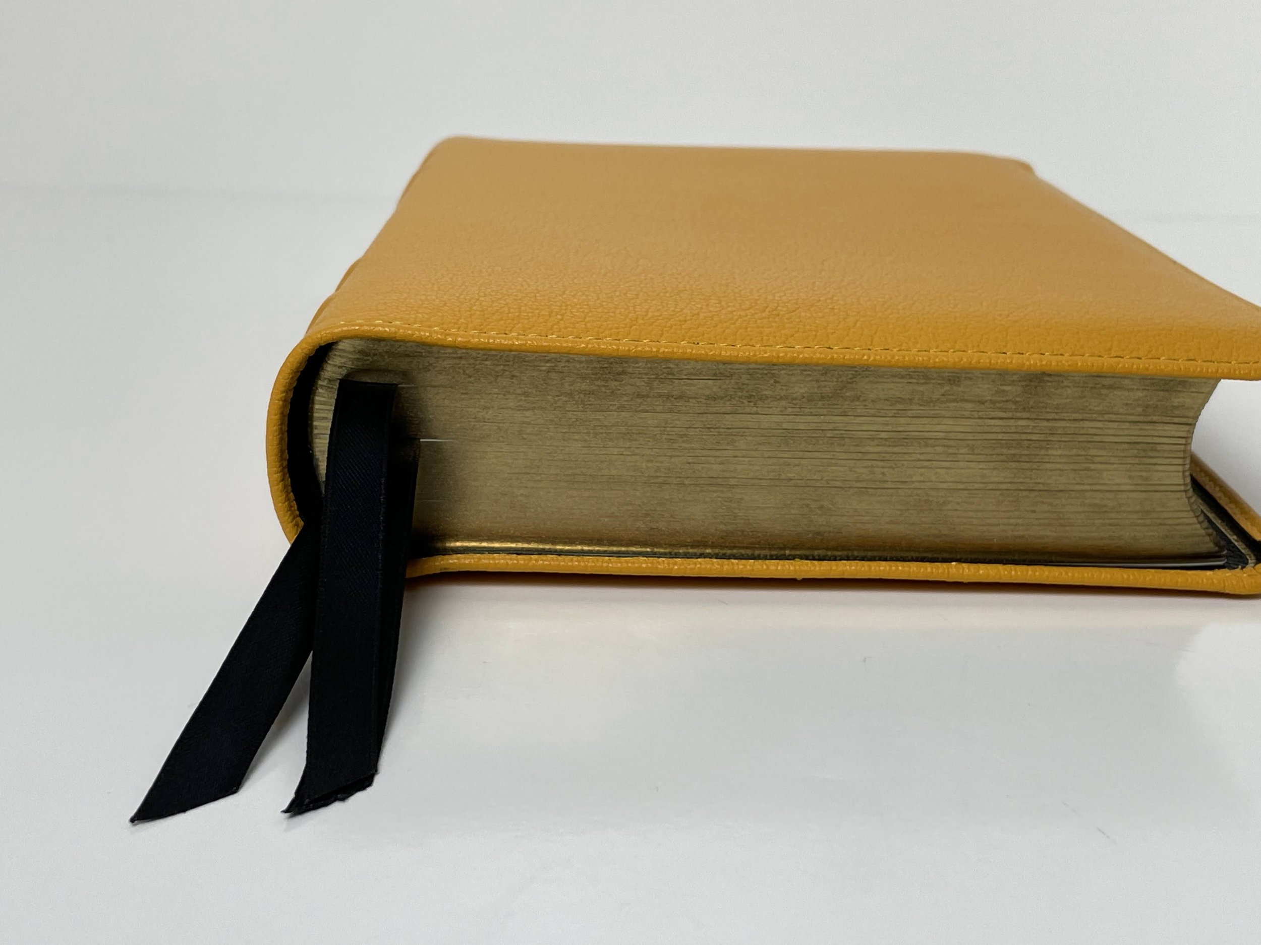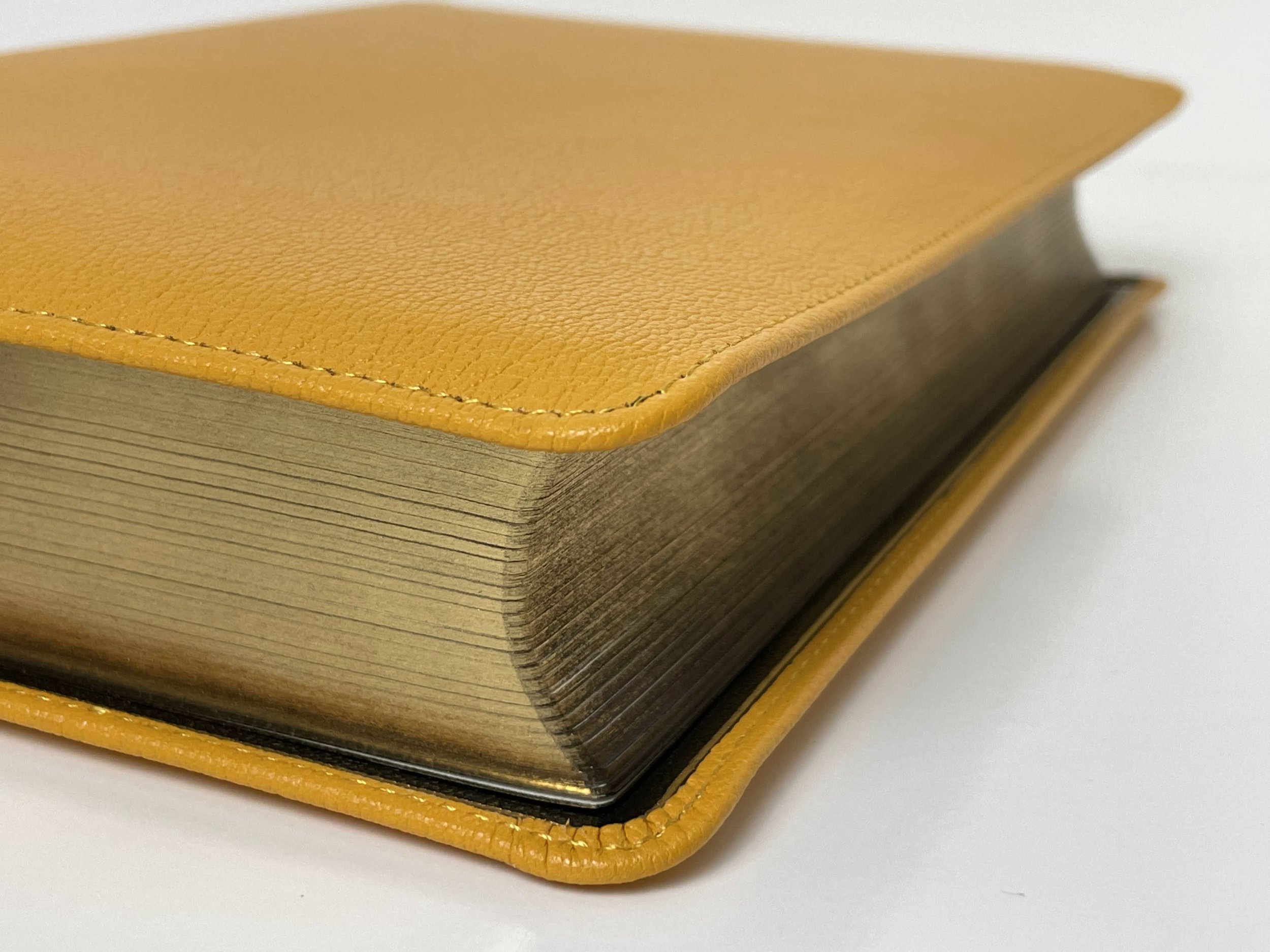 The yellow goatskin on this Bible is beautiful and eye catching. It’s the yellow I really like that look rich like a sunflower. The leather grain pops thanks to the yellow. It’s soft and supple. It feels great.