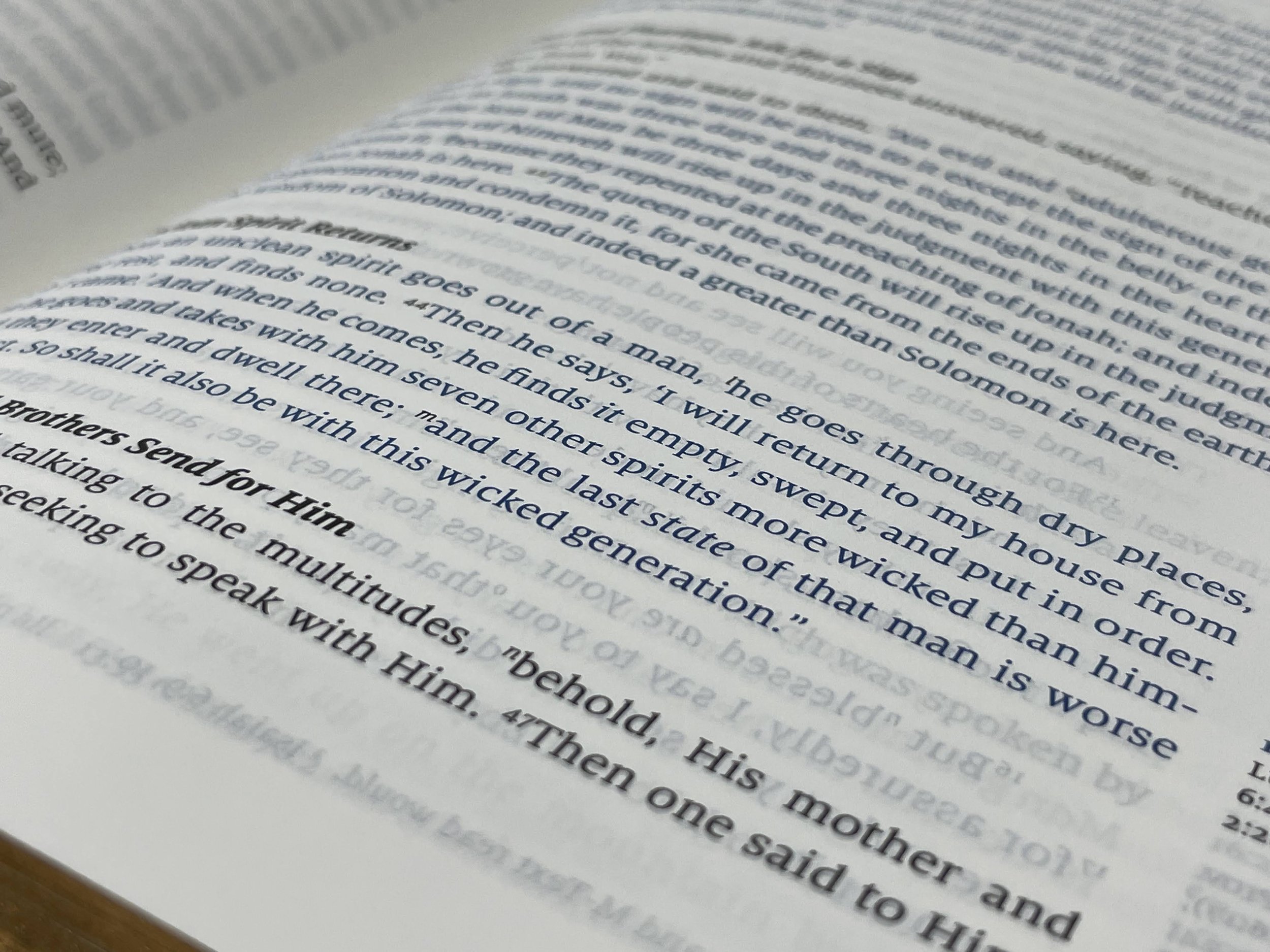The Bible boasts a 32 gsm Ivory Bible paper. Ghosting is very minimal. It is set in a single column with references in the outer margin of each page. The font is a 9 point Milo type. Accent colors are in a nice blue color. Also interesting is that the words of Christ are in blue. This is almost a royal blue color and I love this choice. I don’t know why they decided to do this, but I like it so much better than the words of Christ being in red! I think it actually adds a certain beauty to the page.