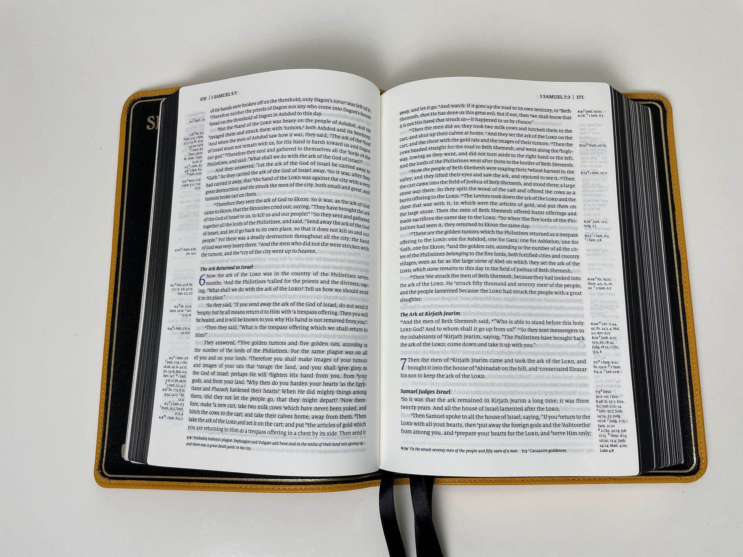 I’m going to start this review with a controversial statement. The Humble Lamb Shepherd in Lunar Yellow should be the only option. This Bible will turn heads. It’s that good, deep yellow and not the light, ugly yellow. It has black accents and art gilt! It has it all in my opinion.