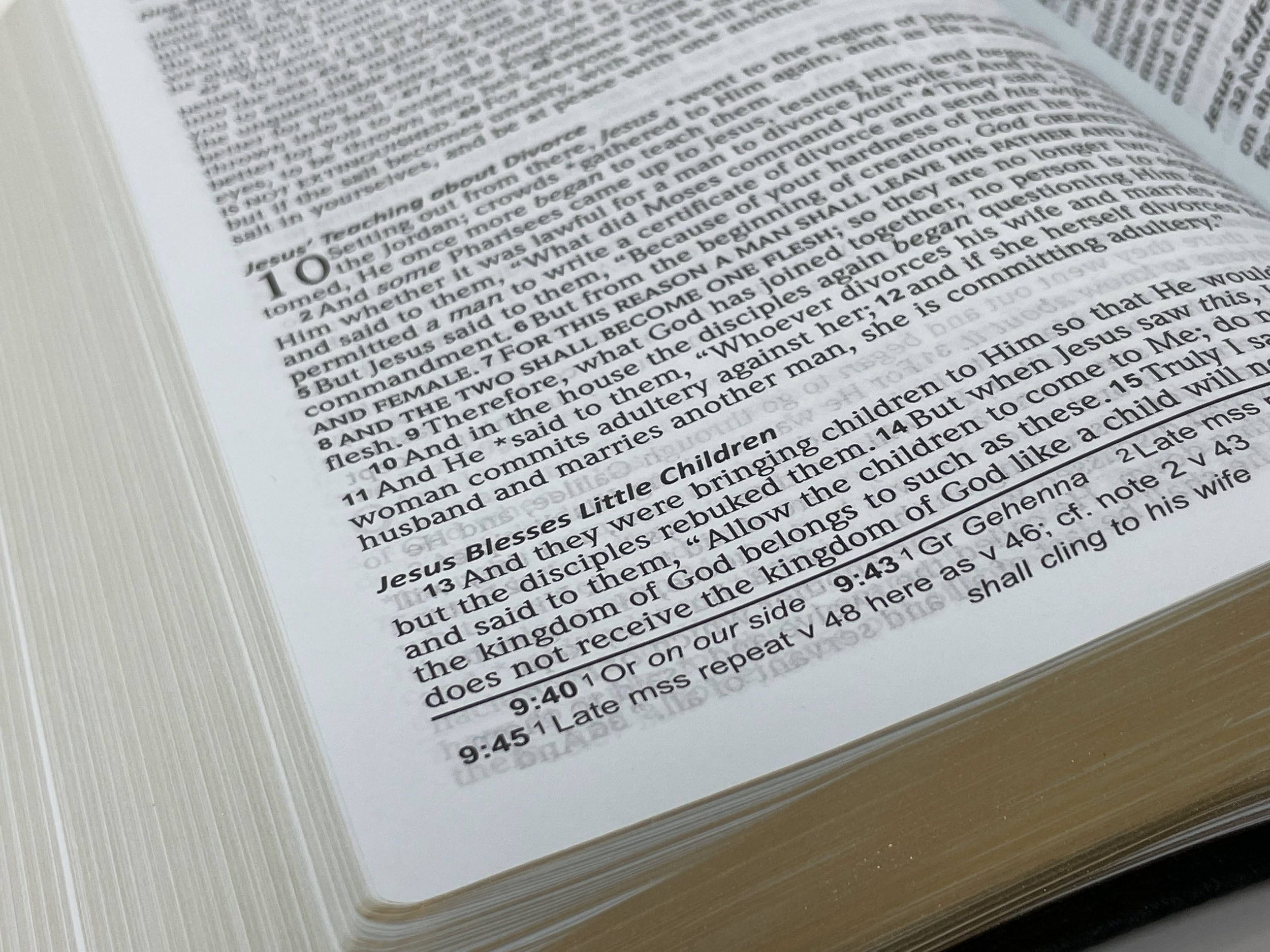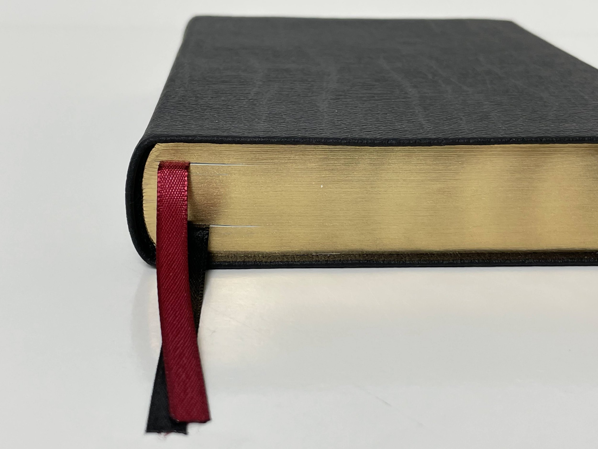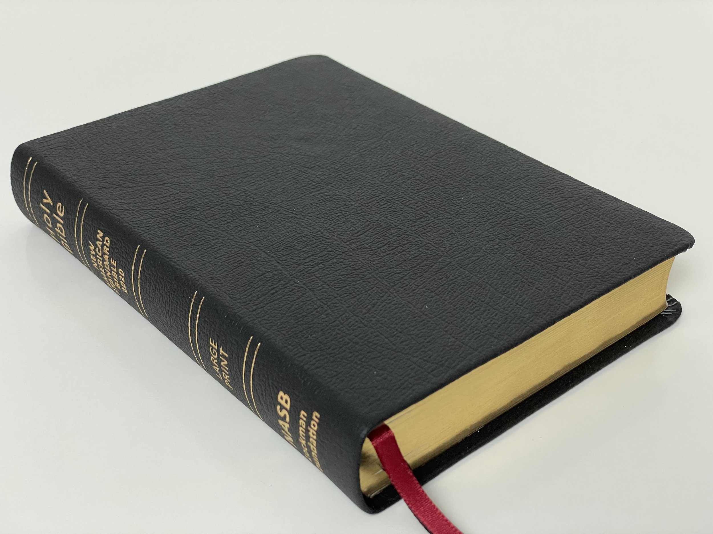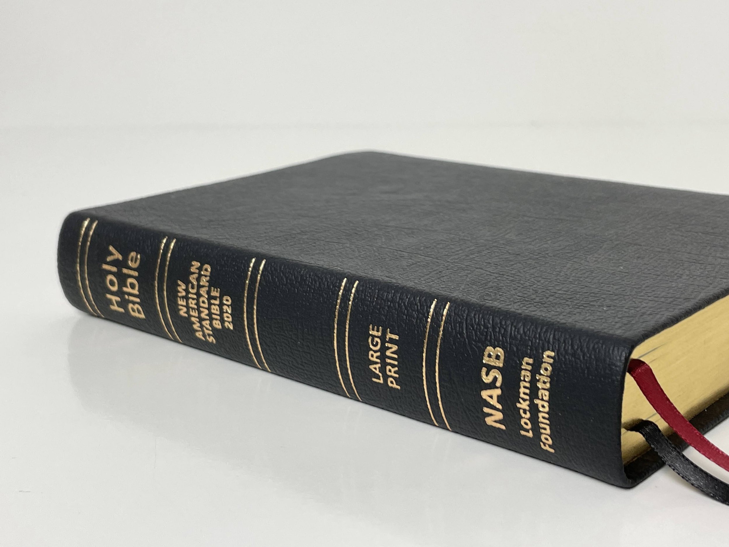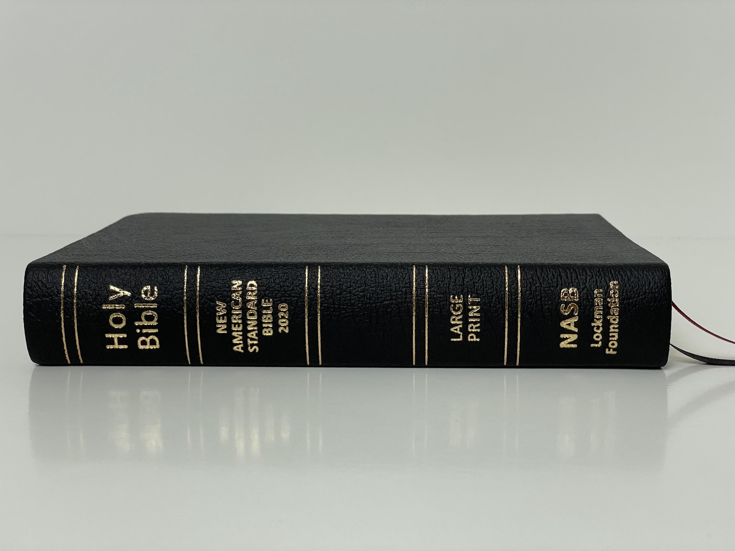 I’m reviewing the black genuine leather edition. It comes with a slipcover. The genuine leather is stiff, but has a great grain. It also has a great feeling texture on the hand. Printed in gold on the spine are the words, “Holy Bible”, “NEW AMERICAN STANDARD BIBLE 2020”, “LARGE PRINT”, “NASB”, and “Lockman Foundation”. There are also five sets of double gold bars printed on the spine. I’m unsure why they felt the need to include “LARGE PRINT” and feel like it could have been left out to make the spine less busy.