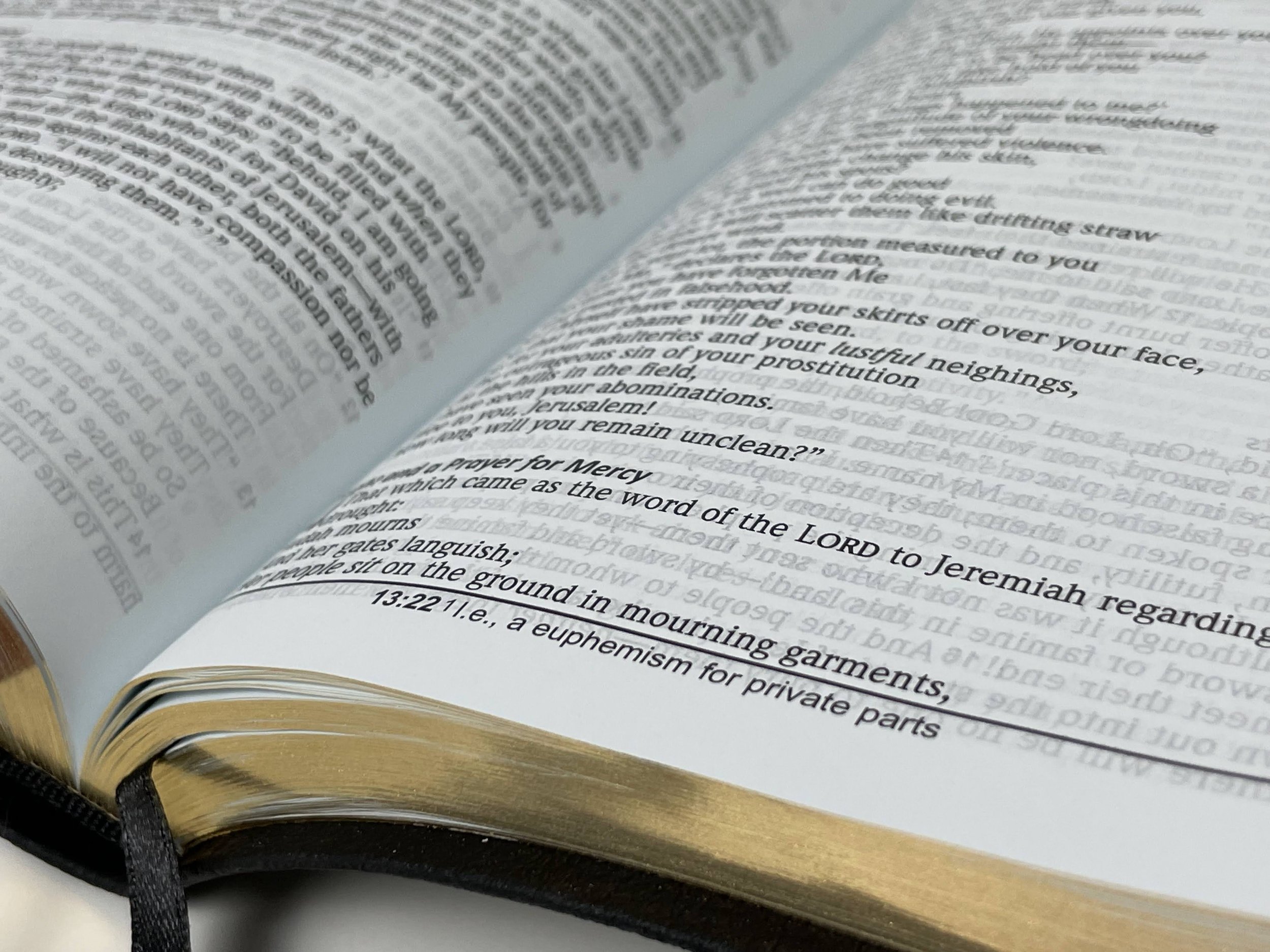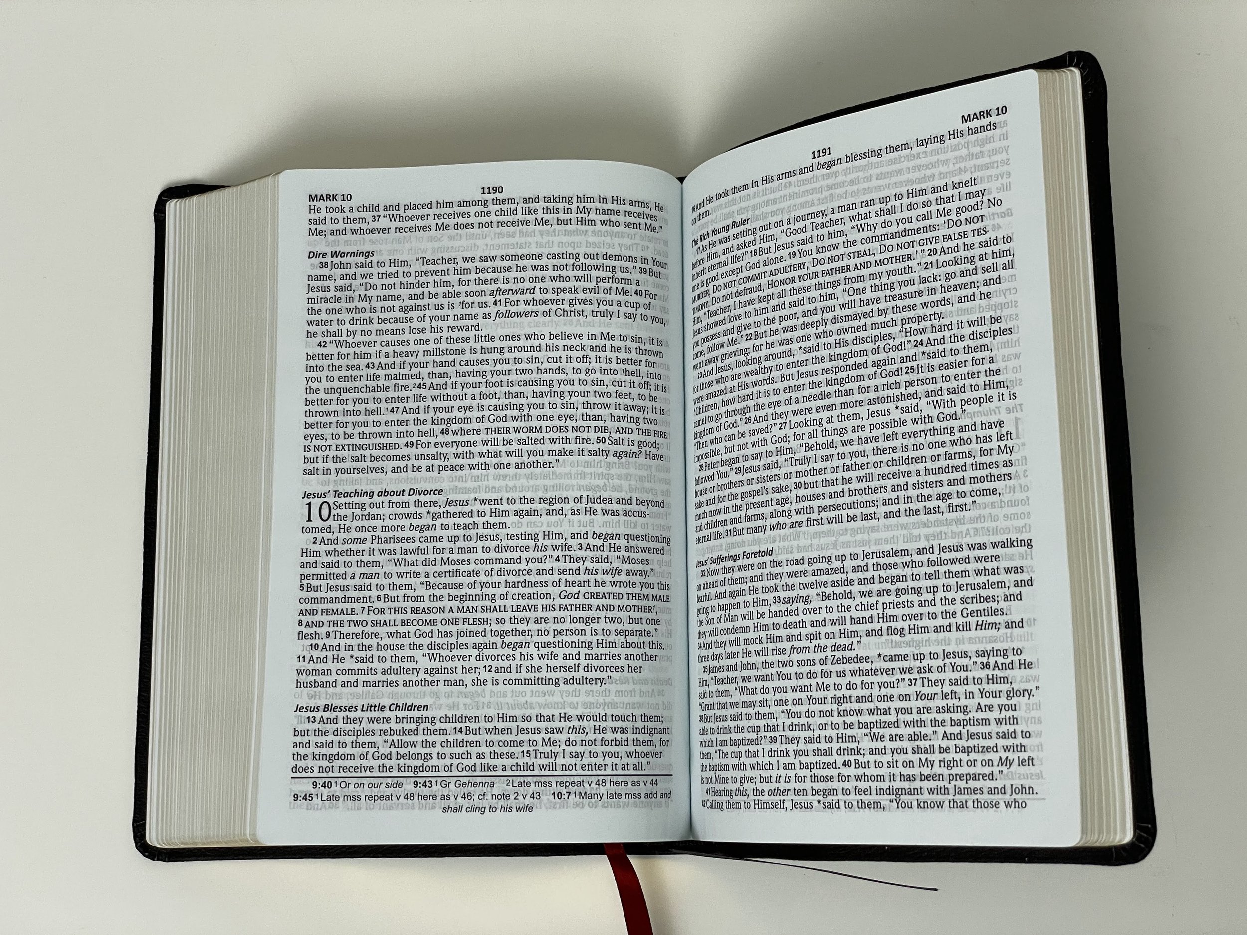 The page edges are a gold gilt and this Bible has two single sided satin ribbons. One is red and the other is black. They are narrow, but I would have loved to have seen them wider.There’s a black, paste down vinyl liner on the inside. This Bible is stiff. It doesn’t come close to laying flat toward the beginning. That doesn’t bother me as much because this feels like a Bible you hold in your hands and take with you places.