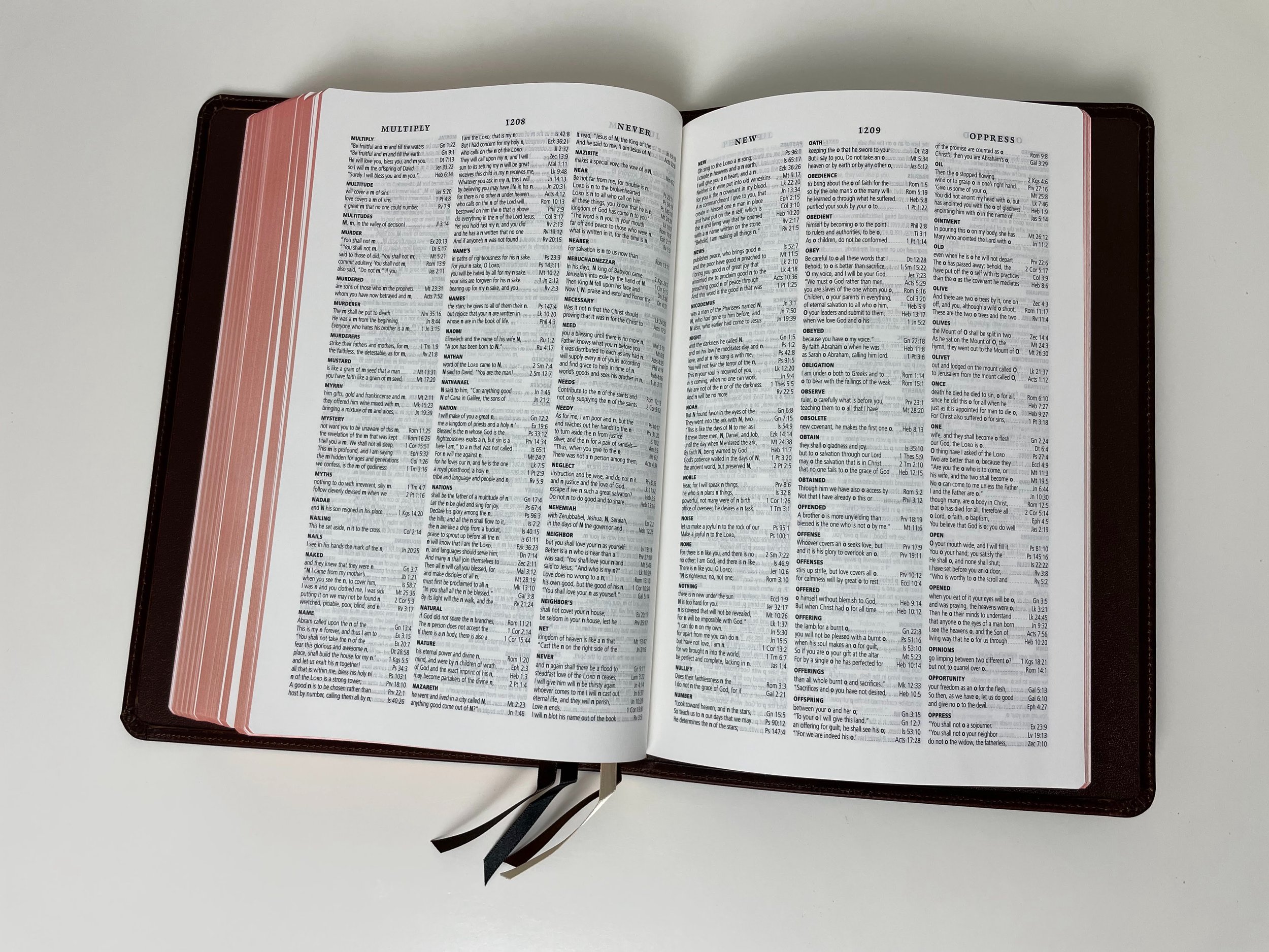 The red under gold art gilt of the page edges compliments the dark brown of the Horween nicely. The only real room for improvement is with the bookmarks. Many have complained and rightly so. There are four double sided satin ribbon bookmarks, but they are narrow and short. They just don’t look like they fit the other luxurious components of this Bible. Crossway really needs to take some steps to improve their ribbons!