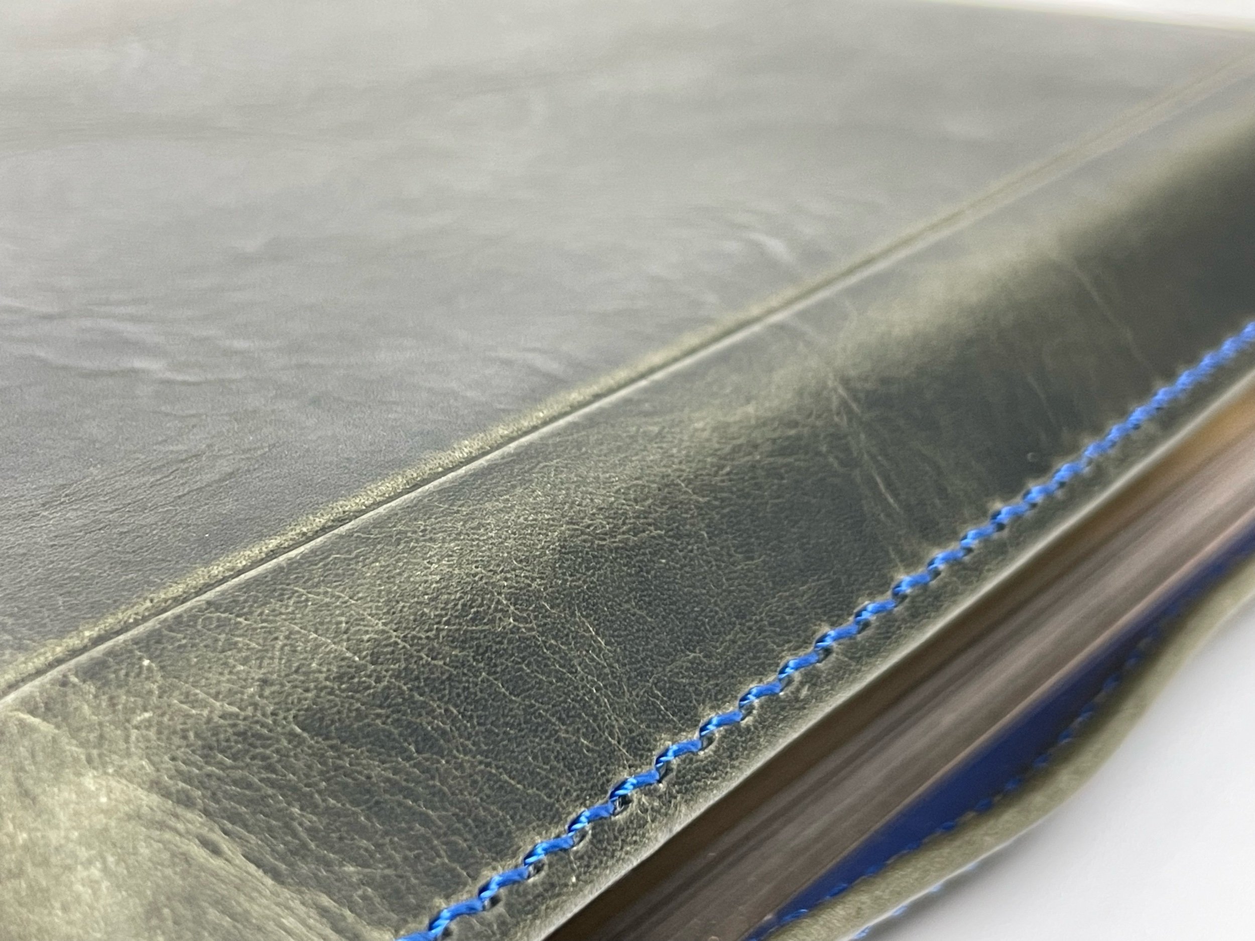The cover has a tooled perimeter line, which adds a lot of character. PTL’s tooling is straight, consistent, and beautiful. I also think it creates some definition on a full yapp Bible that is hard to explain, but just looks right! The perimeter of the cover is stitched in a royal blue. This adds a pop of color to the neutral tones of the steel grey. It looks fantastic.