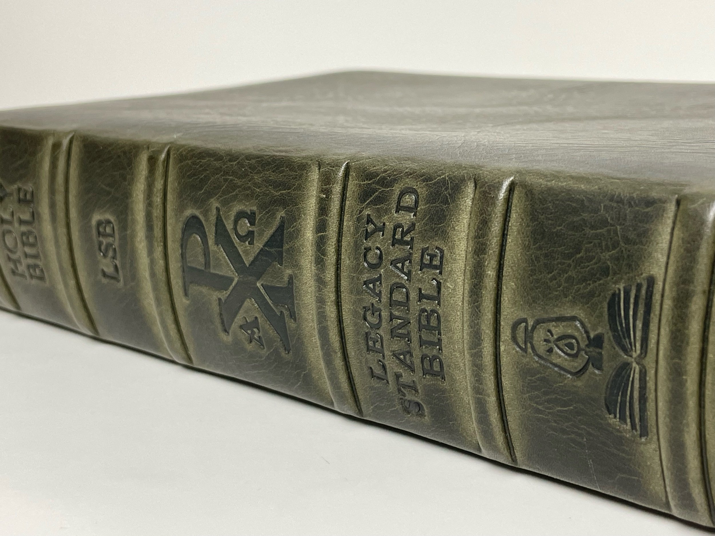 The spine says, “HOLY BIBLE”, “LSB”, has a Chi Rho symbol, “LEGACY STANDARD BIBLE”, and the PTL logo. This is a lot of stamping, but it looks great on this leather. PTL’s Chi Rho stamp is super unique and very striking as well. I think it really sets the spine off and I’m glad I chose it.
