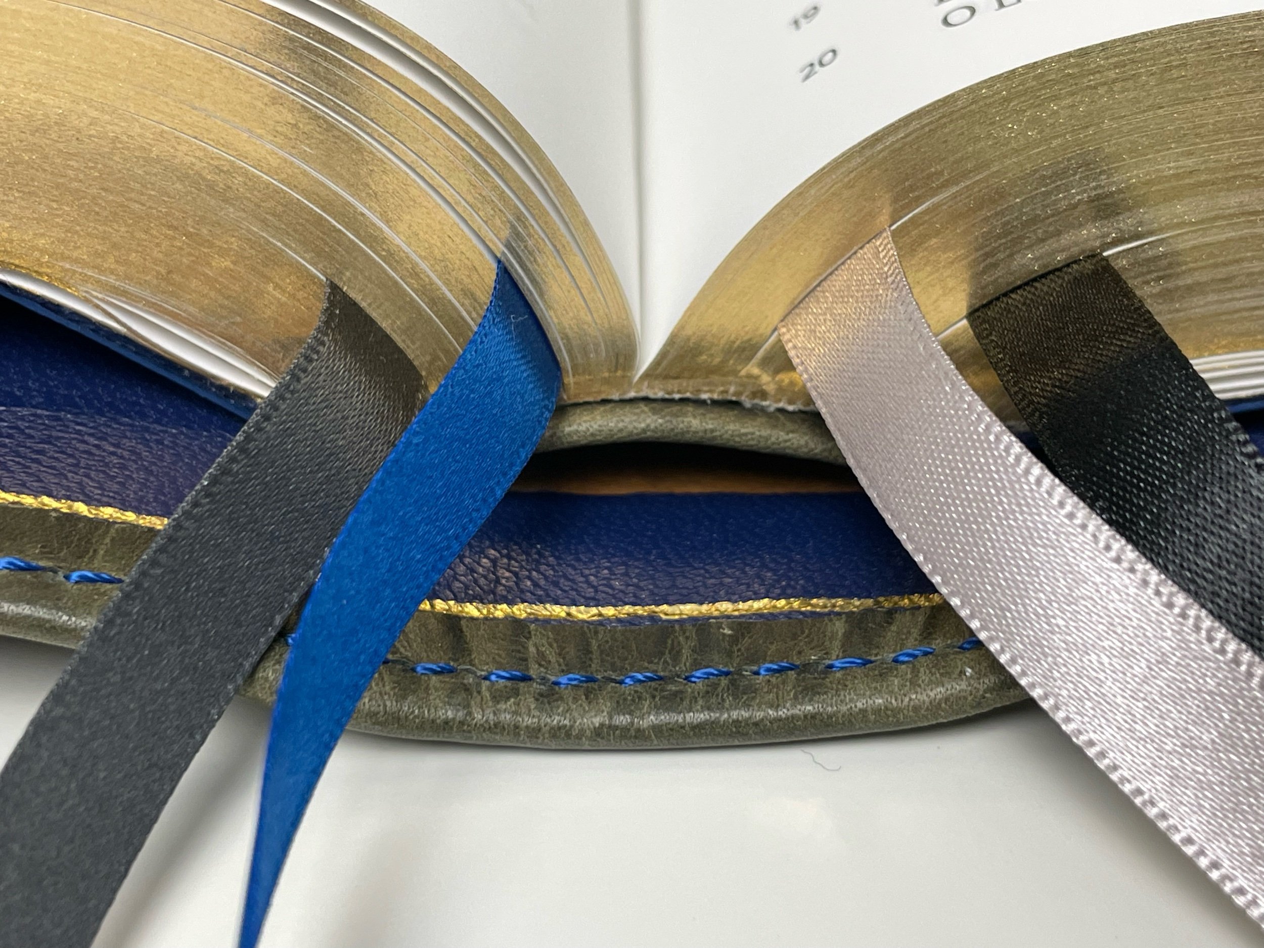 For this Bible, I chose four different colored ribbons. Trying to tie in my color choices, I went with a grey, royal blue, white, and black. They are nice and long, which is just the way I like them! There are also grey leather head and tail bands. This is a small detail that I didn’t even think to mention, but didn’t have to. Jeffery has been doing this so long that he just knows what will look great.