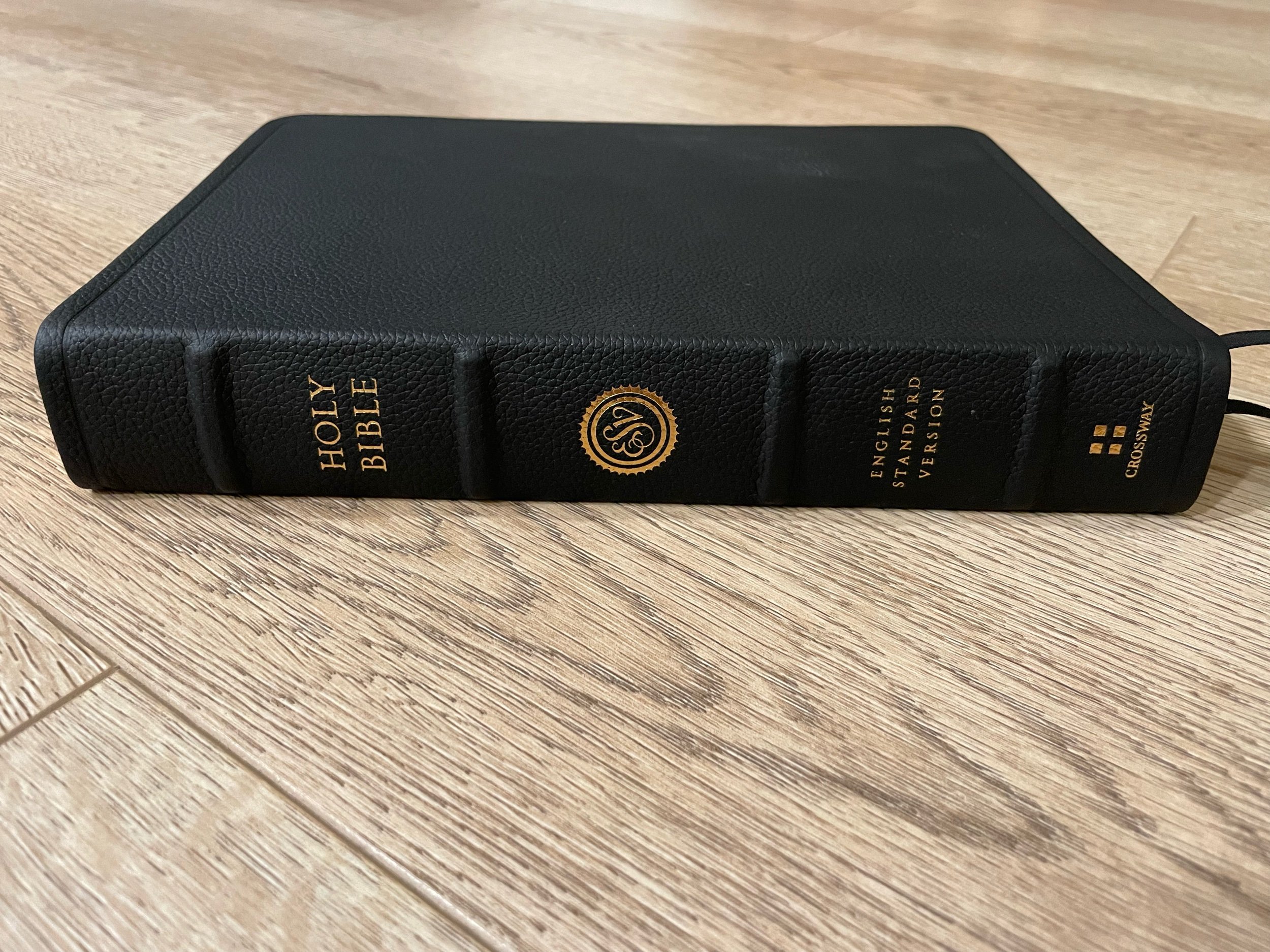 The spine has four raised ribs and printed in gold are the words “HOLY BIBLE”, the ESV logo, “ENGLISH STANDARD VERSION”, and the Crossway logo. There are two black single-sided satin ribbons that aren’t anything special. There are black and yellow head and tail bands that are unique and add a lot of character. This Bible also has gold gilt on the page edges.