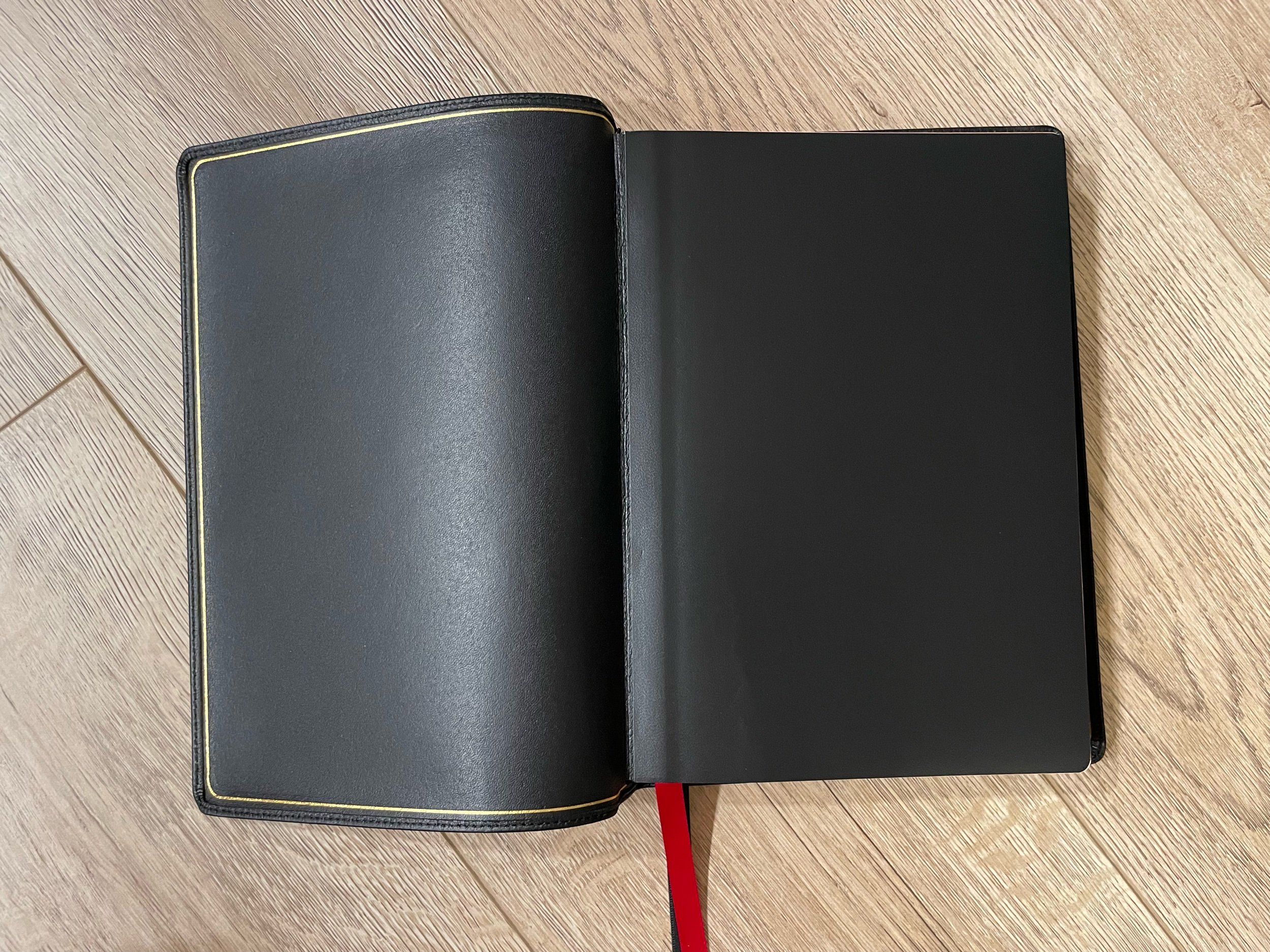 Inside is a gold perimeter gilt line and a black calfskin liner. There are also black vinyl end sheets. There are presentation and family records pages on cardstock.
