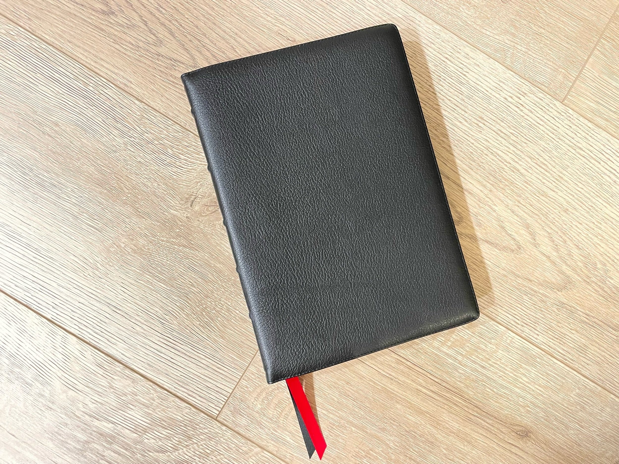 Once you open the box, however, I think you’ll be impressed. I’m reviewing the black Large Print Ultrathin Reference in goatskin. Upon opening the box, I’m hit by the amazing smell of leather. This Bible smells great as funny as that is to say. The goatskin itself is nice and flexible and has a great looking grain! There’s also a nice bit of semi yapp on the cover!