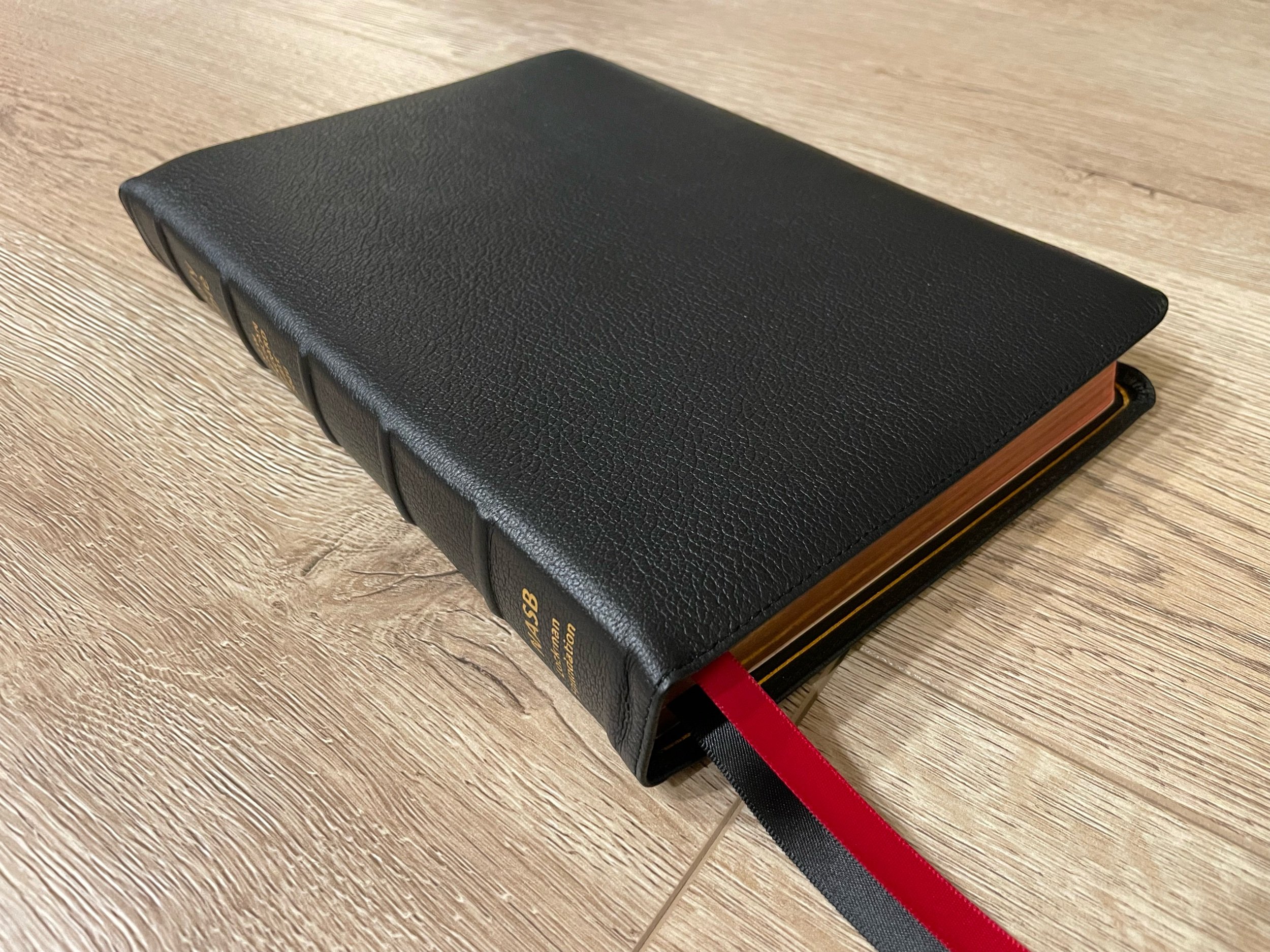 The spine has five raised hubs. In gold are the words, “Holy Bible”, “NEW AMERICAN STANDARD BIBLE 2020”, “NASB”, and “Lockman Foundation”. There are black head and tail bands as well as two double-sided satin bookmarks that are nice and wide. One is black and the other red. I’d prefer they be a little longer, but they are really nice. I actually like the bookmarks used on the black Bible better than the ones used on the brown. They look a little more premium even though it’s hard to describe. The page edges are a beautiful red under gold art gilt.