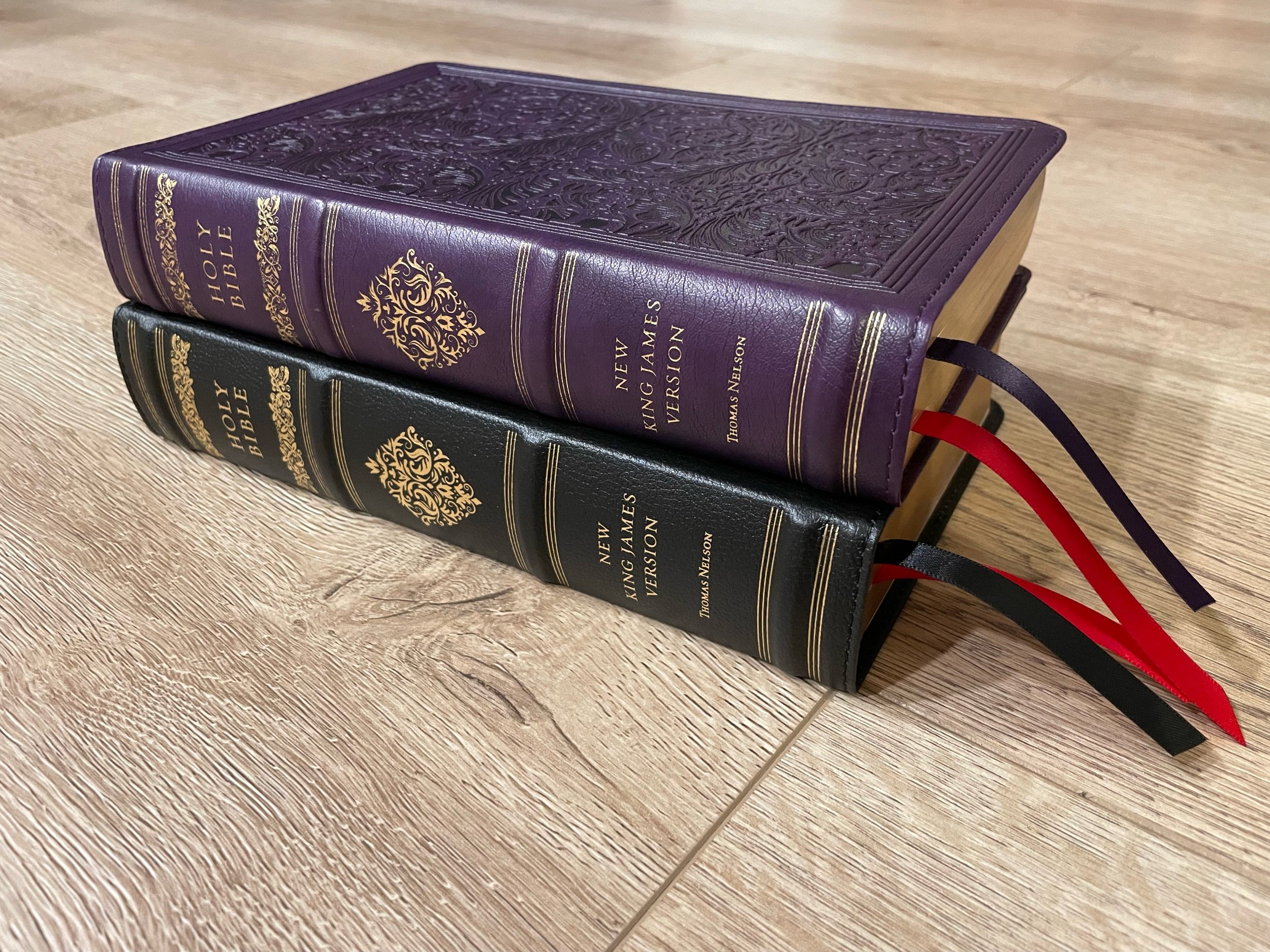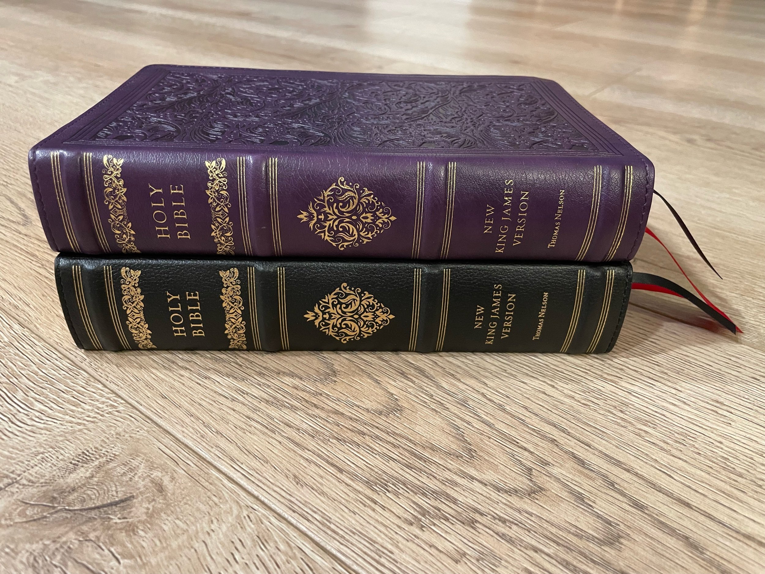 The spine of each Bible looks the same. There are four raised hubs on each one. I love when they do raised hubs on fake leather! They have almost identical designs. There is a lot of ornate designs in gold. I really like the way they look. In gold also on each are the words, “HOLY BIBLE”, “NEW KING JAMES VERSION”, and “THOMAS NELSON”.