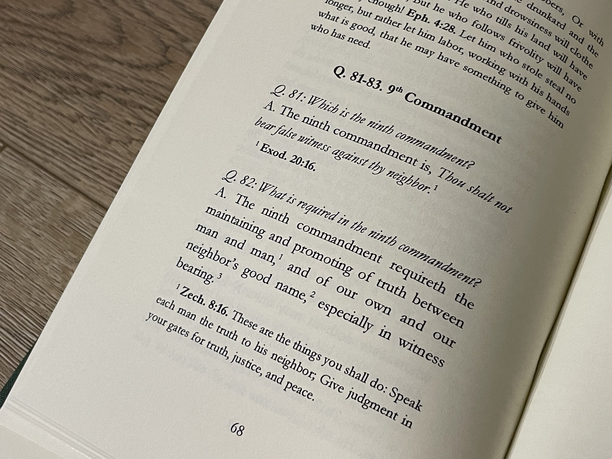The catechism itself is of course what you’re coming for. It’s printed on thick, cream colored paper and the print is large and dark. The paragraph line spacing makes this edition so readable. I am so glad this is the copy I waited for. The other thing I love is that proof texts are written out underneath the questions instead of just giving Scripture references. This is so useful because it means you don’t have to go looking for a Bible while utilizing this resource. There is also a Scripture Index at the end, which is very useful.