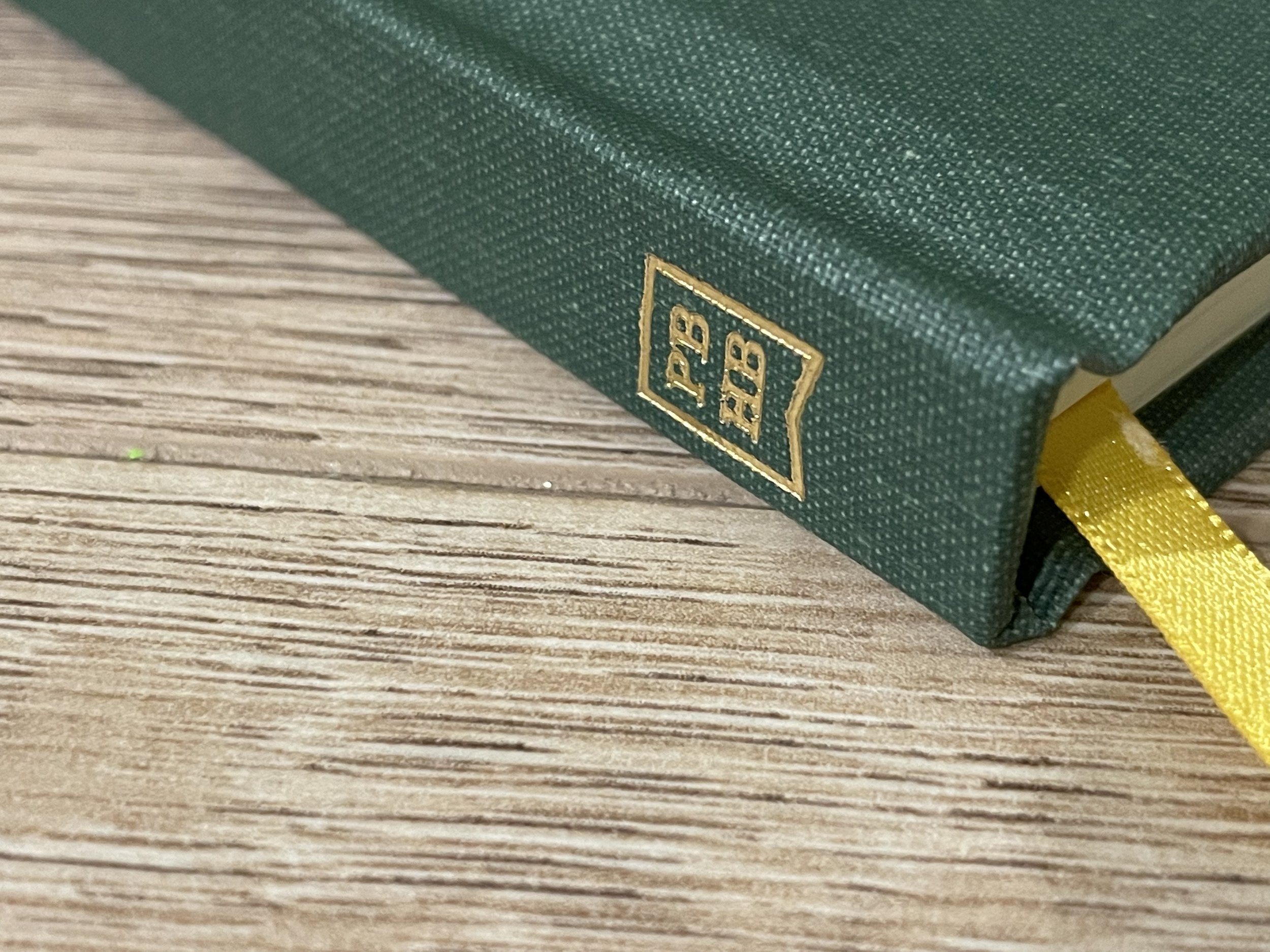 I received this copy and upon opening it just smelled like an old book. I loved that! It was so good. After getting over the smell, I was able to admire this book’s beauty and construction. This book is a green cloth over board and the cloth has that heathered look. Stamped in gold on the front is The BAPTIST CATECHISM With Proof Texts NKJV. The spine also has in gold THE BAPTIST CATECHISM and the PBHB logo.
