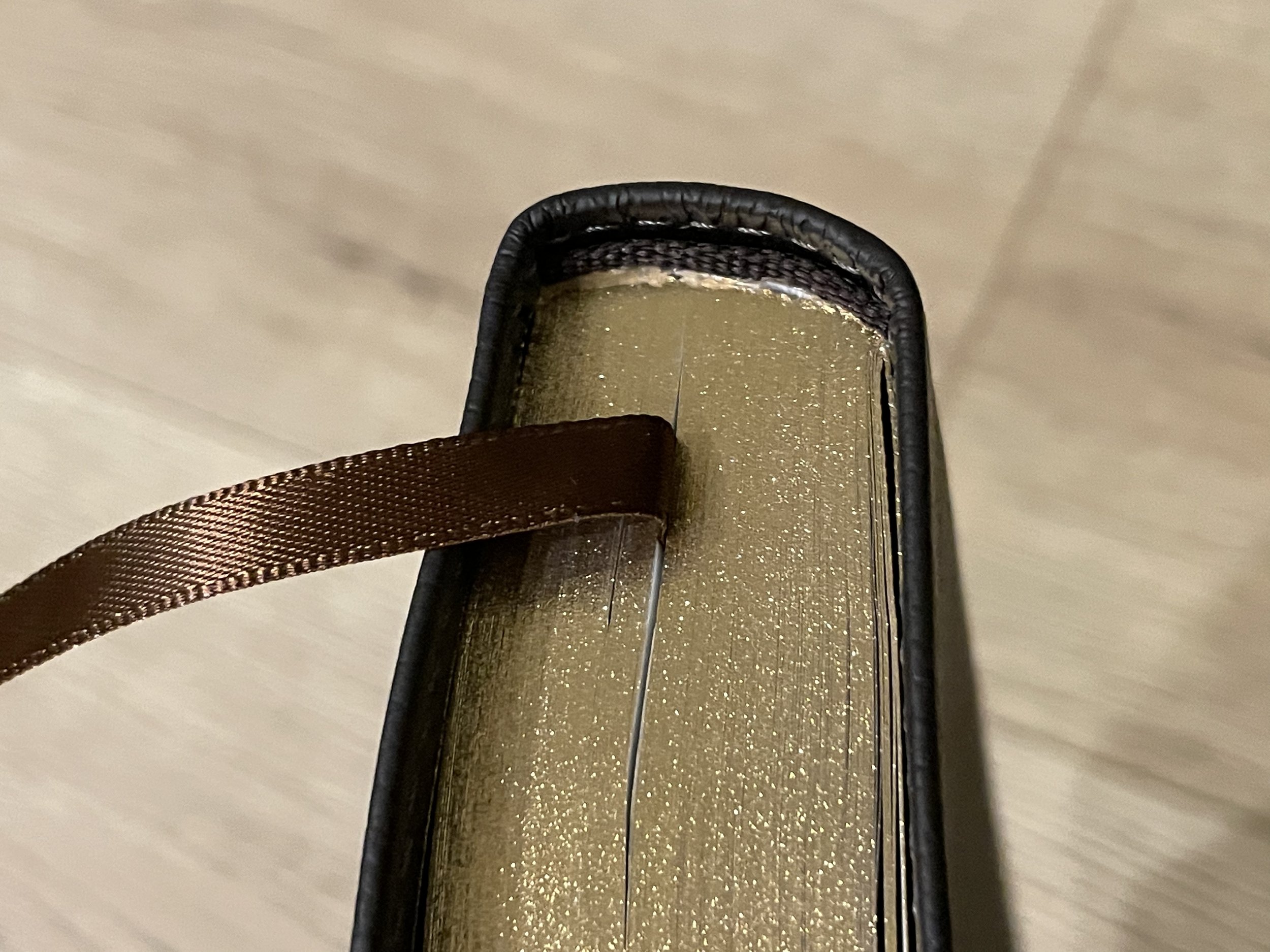 On the spine in gold are the words, “HOLY BIBLE”, “ESV”, ‘ENGLISH STANDARD VERSION”, and the Crossway logo. Page edges are a gold gilt, there are brown head and tail bands, and one brown ribbon bookmark. I would have loved if they had included two bookmarks in this Bible.