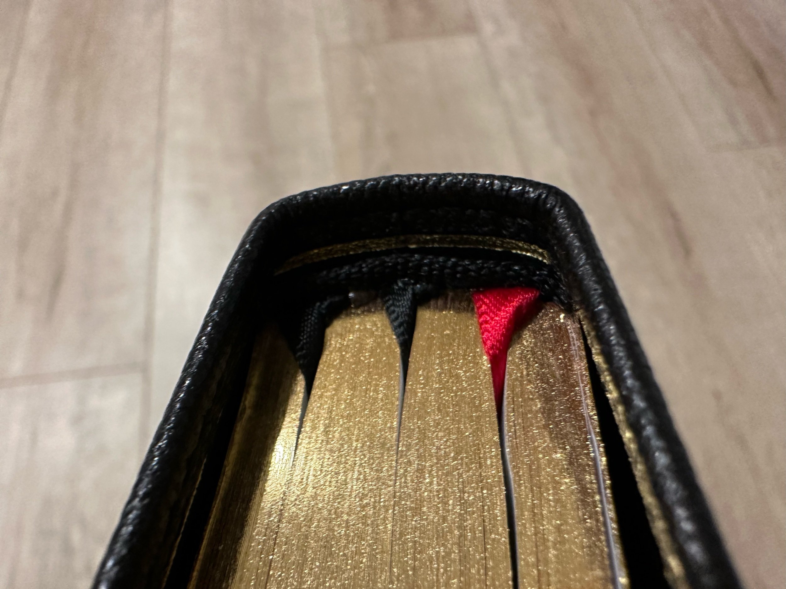 There are red under gold page edges, but what really blows me away are the bookmarks. That a Bible this size has three bookmarks is awesome. I also think going with two black and a red is an interesting design choice. It’s very different, but I like different. There are black head and tail bands. Of course, the Bible is edge lined and Smyth-sewn for durability.