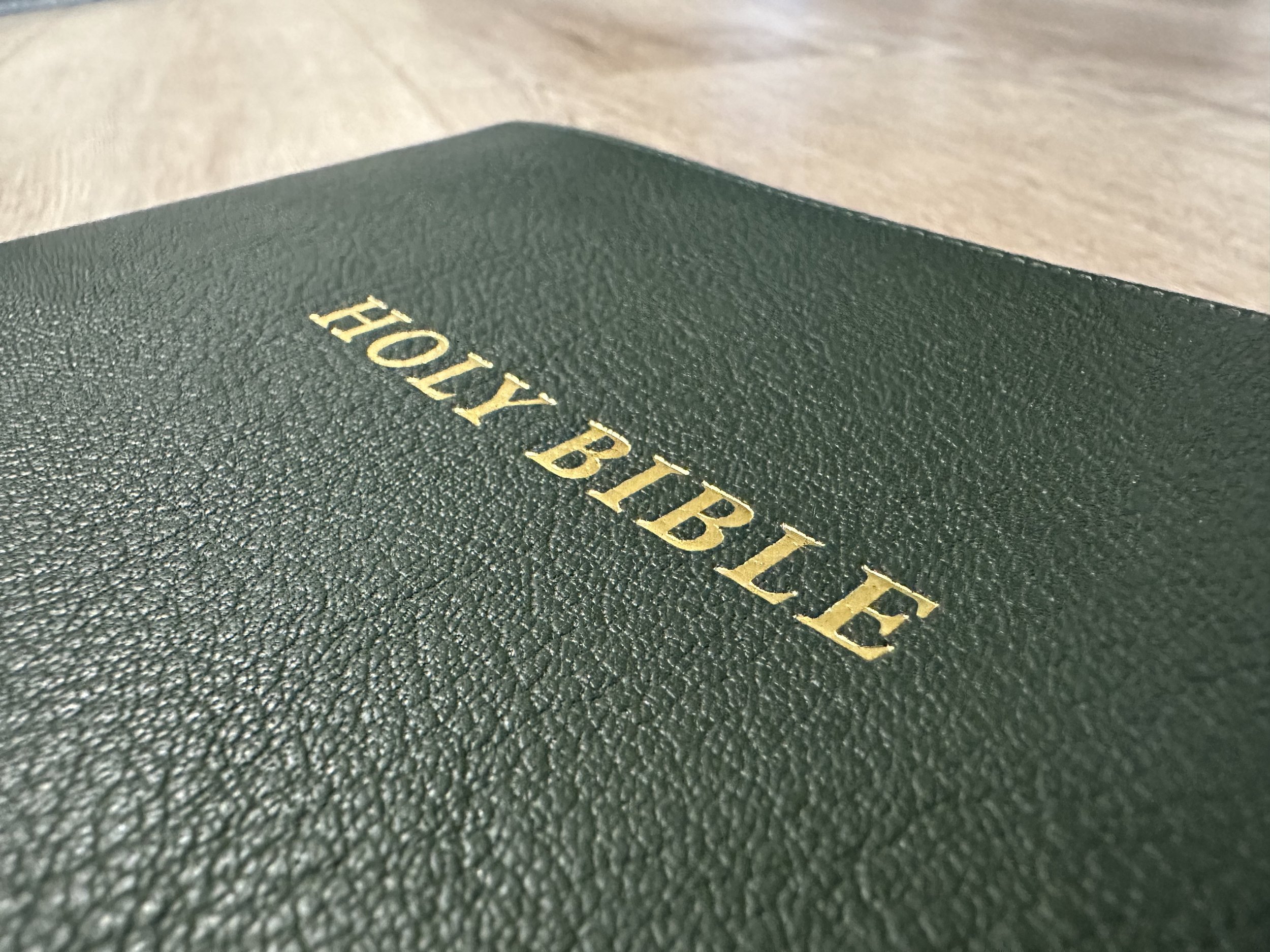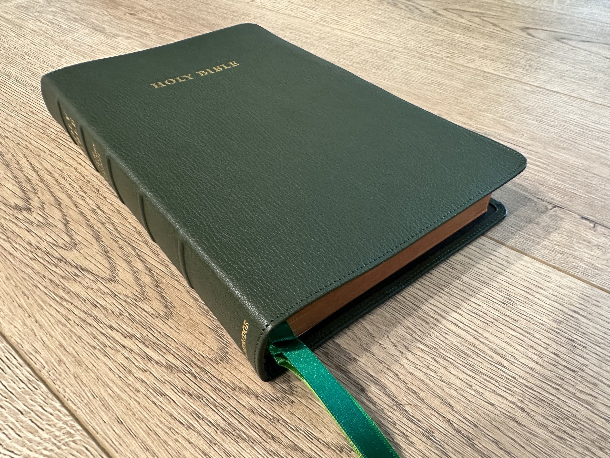 The Topaz is such a beautiful Bible. I’ve seen the ESV in calfskin and goatskin and both are incredible, but I think this green NKJV takes it up a notch! The Bible itself is so flexible and the green goatskin is soft and supple. “Holy Bible” is stamped in gold on the front cover. At first I didn’t like that, but it’s really grown on me. I now like it a lot.