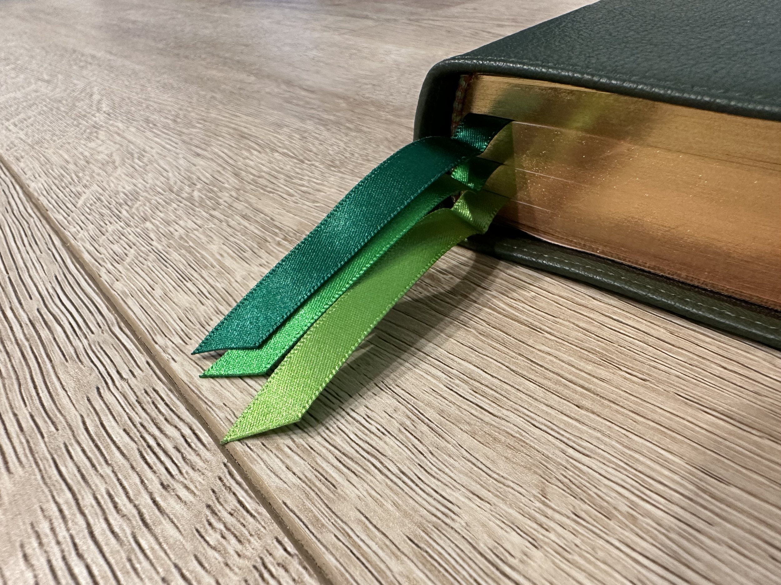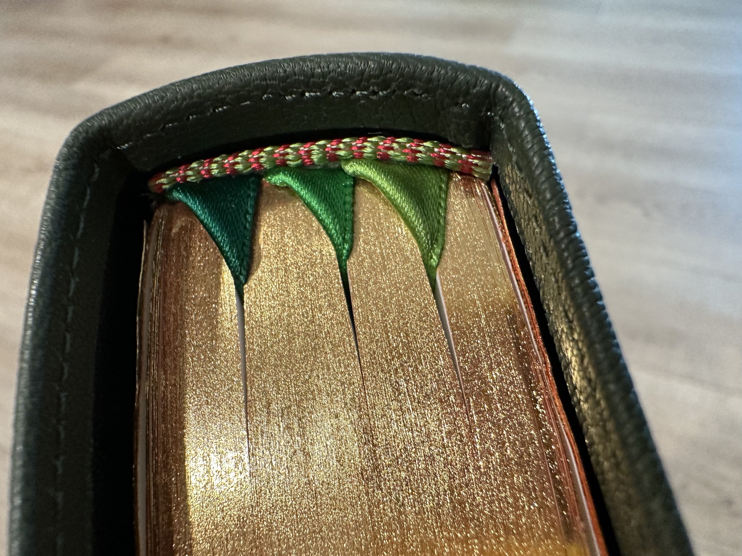 I really love the bookmarks in this Bible. Cambridge put in one more than the ESV has and the green goatskin is so cool because they made each double-sided satin bookmark a different shade of green. It looks incredible! I should also mention how cool the head and tail bands are. They have an alternating red and green pattern, which lets me know that there is a Christmas fan on Cambridge’s design team!