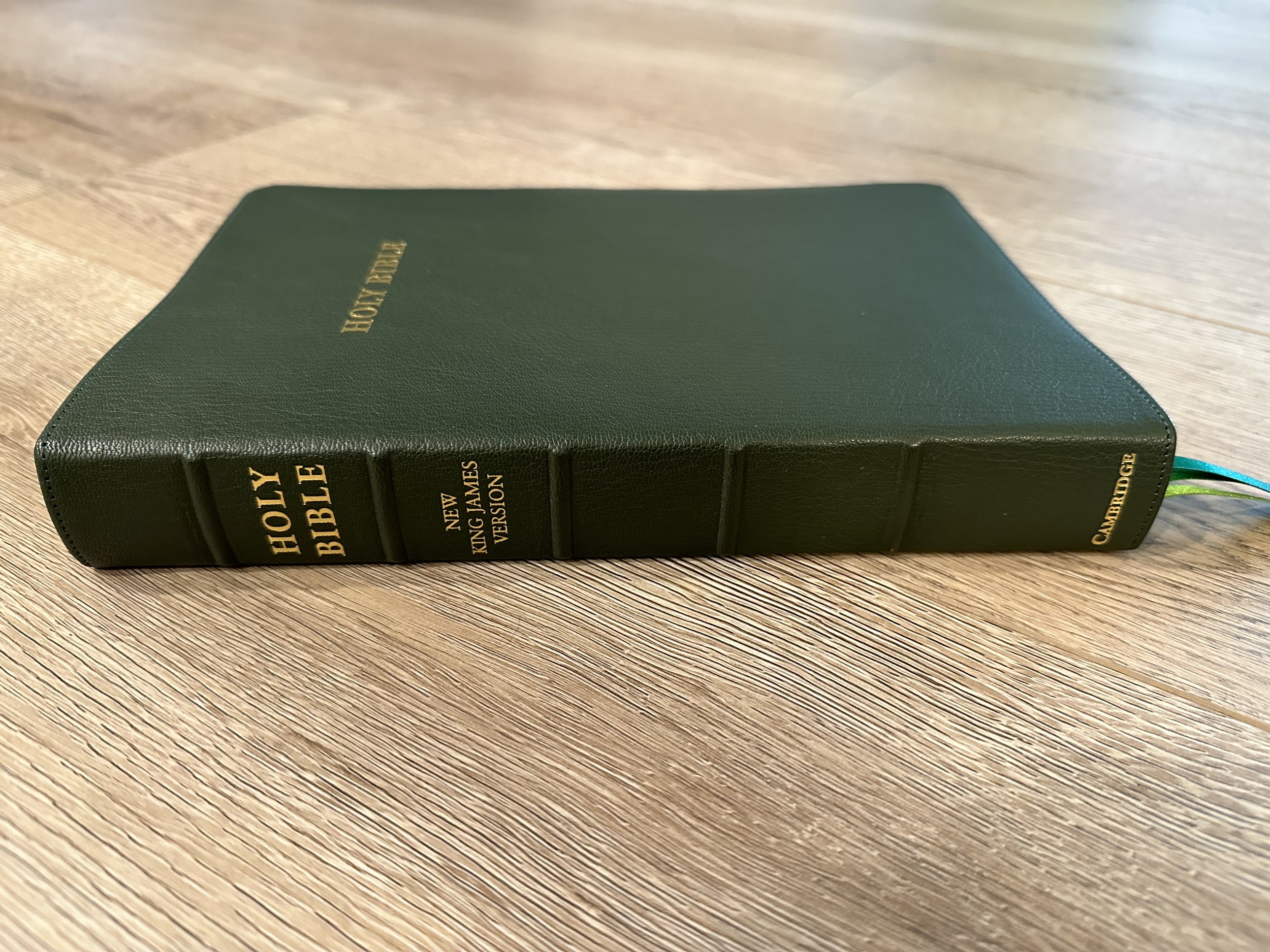 I’ve been hoping to review this Bible from Cambridge Bibles for quite some time. It combines a lot of things I really like: large font, verse by verse setting, and green! Yes, I really like green Bibles even though I don’t have many of them. I have thought this green goatskin NKJV Topaz from Cambridge was attractive for quite some time and I was finally able to get my hands on one! I’m quite excited about it.