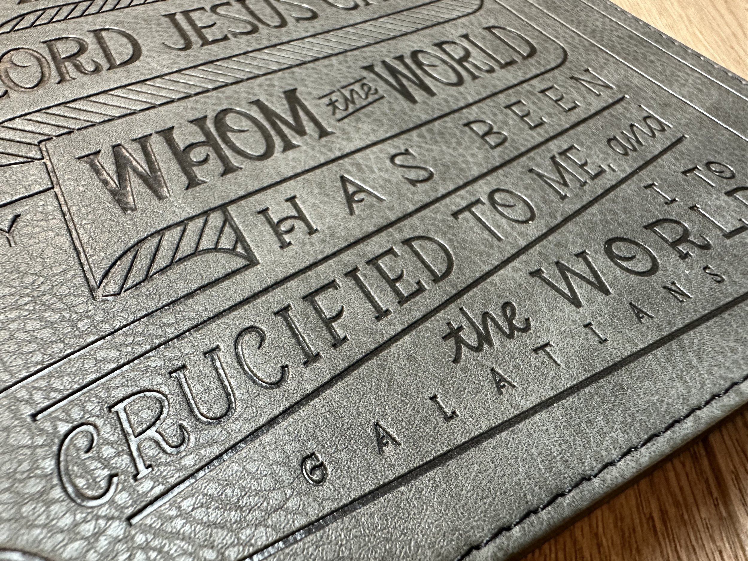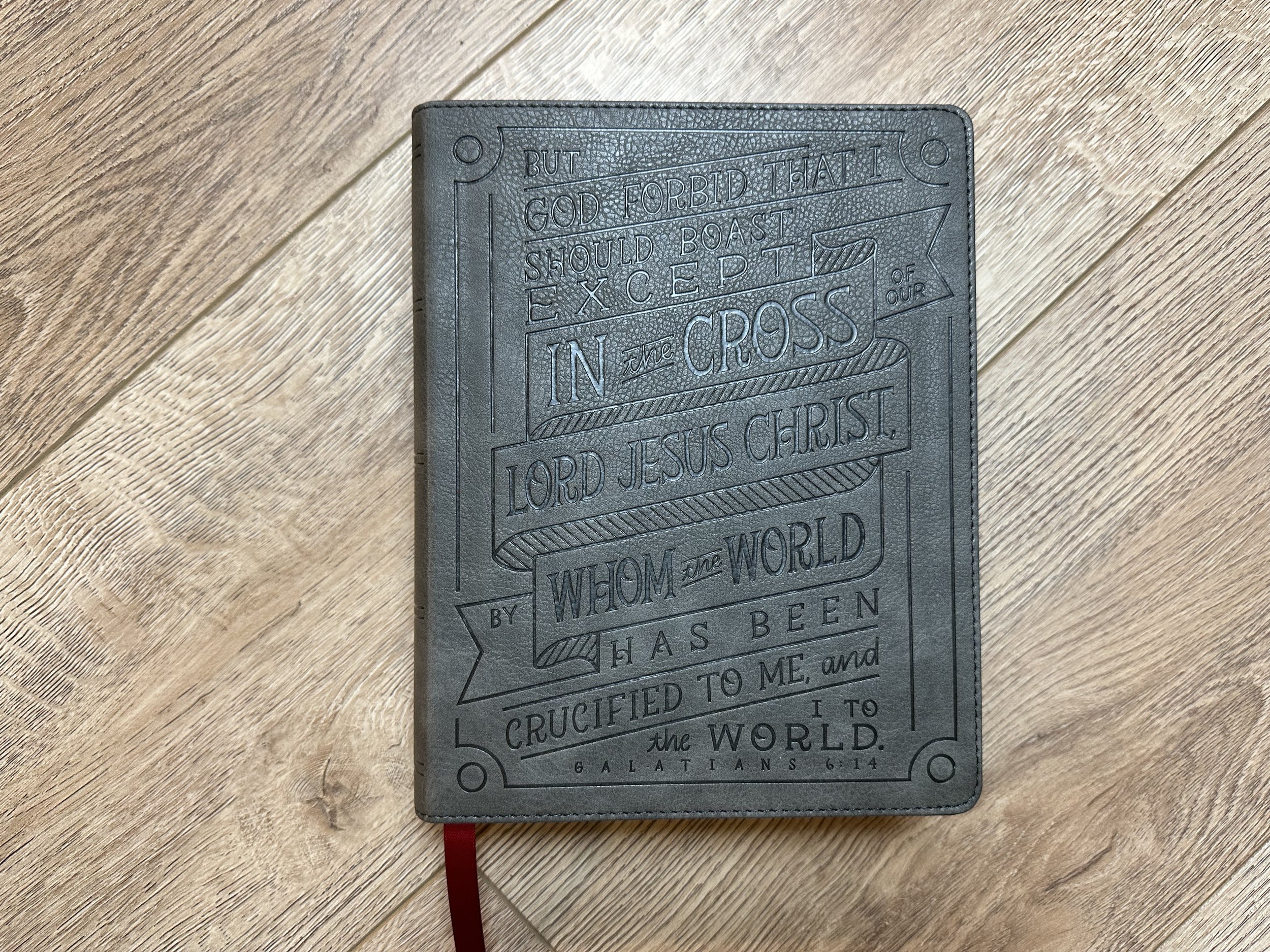 The cover features Galatians 6:14, “But God forbid that I should boast except in the cross of our Lord Jesus Christ, by whom the world has been crucified to me, and I to the world. The Leathersoft feels great and is nice and flexible.