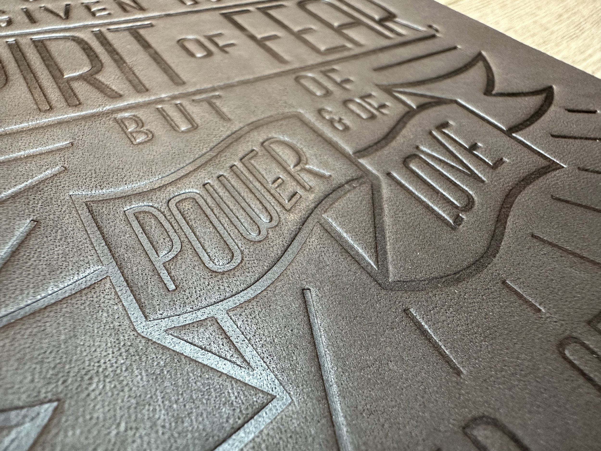 Like I said, the cover is the show stopper on these Bibles. The rough cut leather is a dark brown and it’s really smooth, but I imagine with some use and abuse, it will really patina nicely. The cover and spine are both blind stamped meaning that the stamp is pressed into the leather with no foil so the verse is pressed into the cover. It looks really, really good.