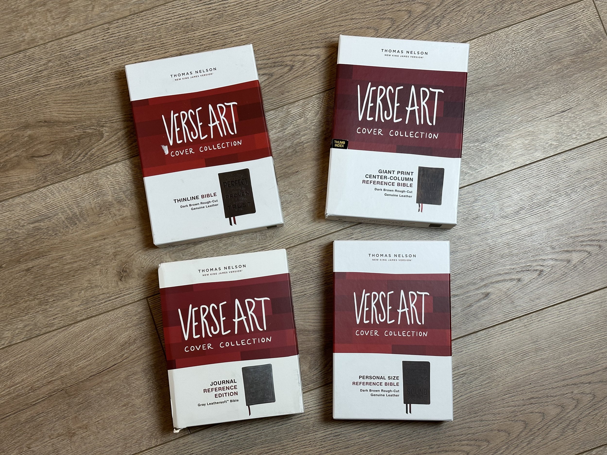 This may be my first multi-Bible review, but I think it’s a necessary one! This review will include four Bibles and the real story with these Bibles are the covers! These each feature a different Bible verse on the cover and they look amazing. Three of the Bible’s feature what’s called dark brown rough-cut genuine leather. They’re rugged and will break in so nicely! The lastt one features a gray Leathersoft cover, but the gray looks so nice that I couldn’t leave it out. These Bibles are the New King James translation, but there are editions that are also available in the King James Version.