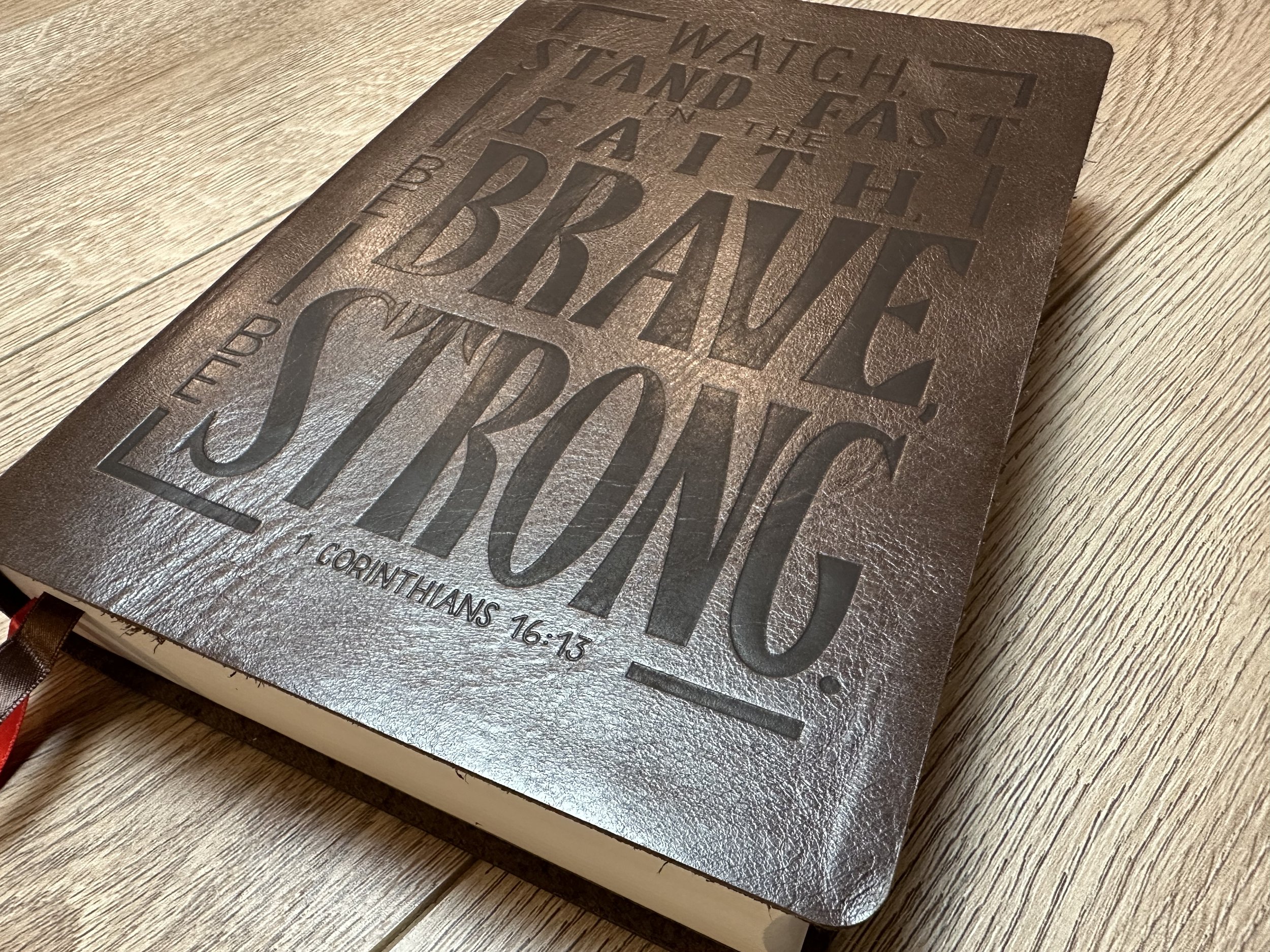 This Bible has the biggest footprint of the three we’re looking at. The cover features 1 Corinthians 16:13, “Watch, stand fast in the faith, be brave, be strong.” My copy of this bible already looks more worn in, which is such a great look. The leather feels slicker and you can see some creasing. I love the worn look. Mine also features the thumb index, which I like too.