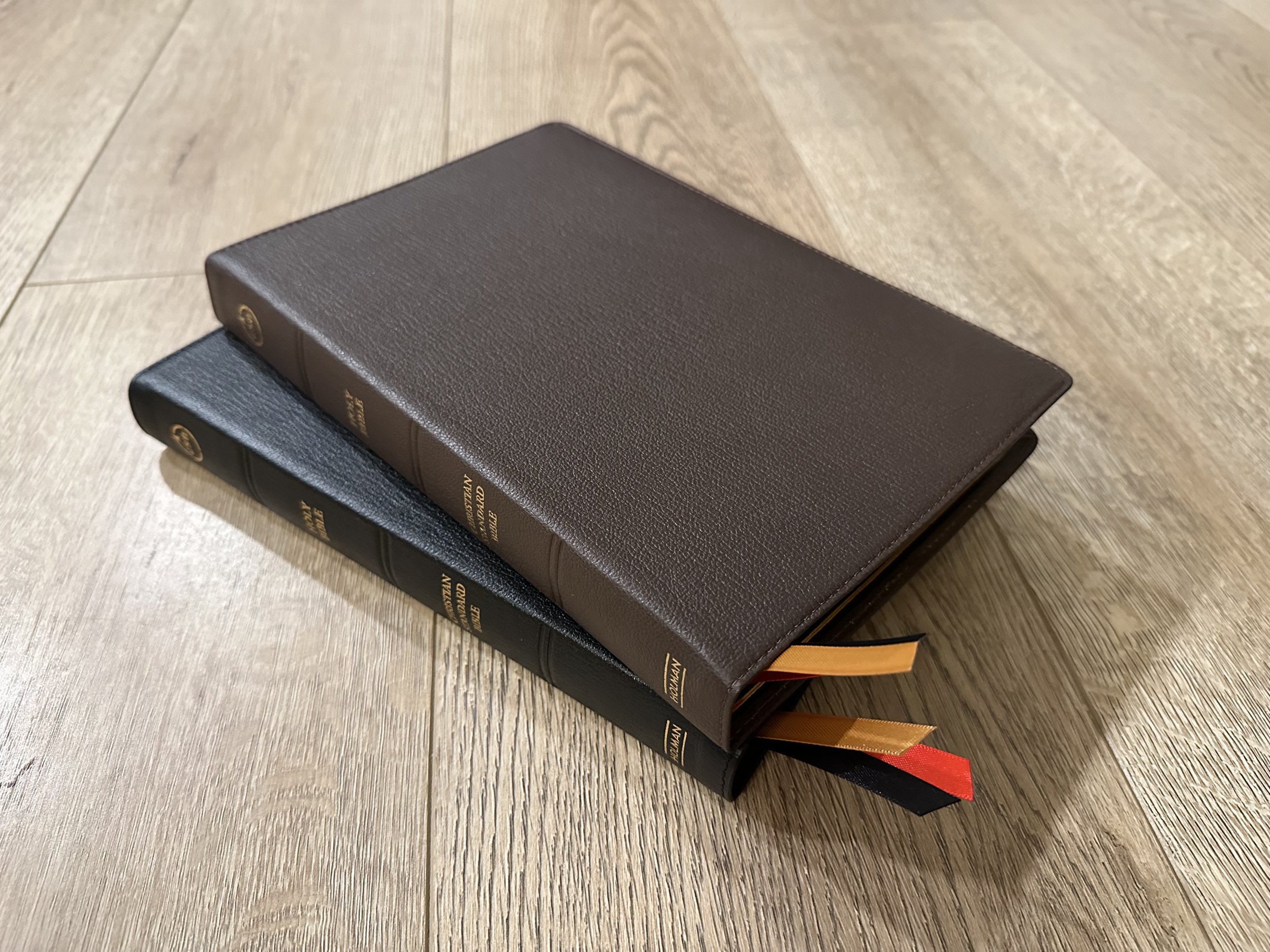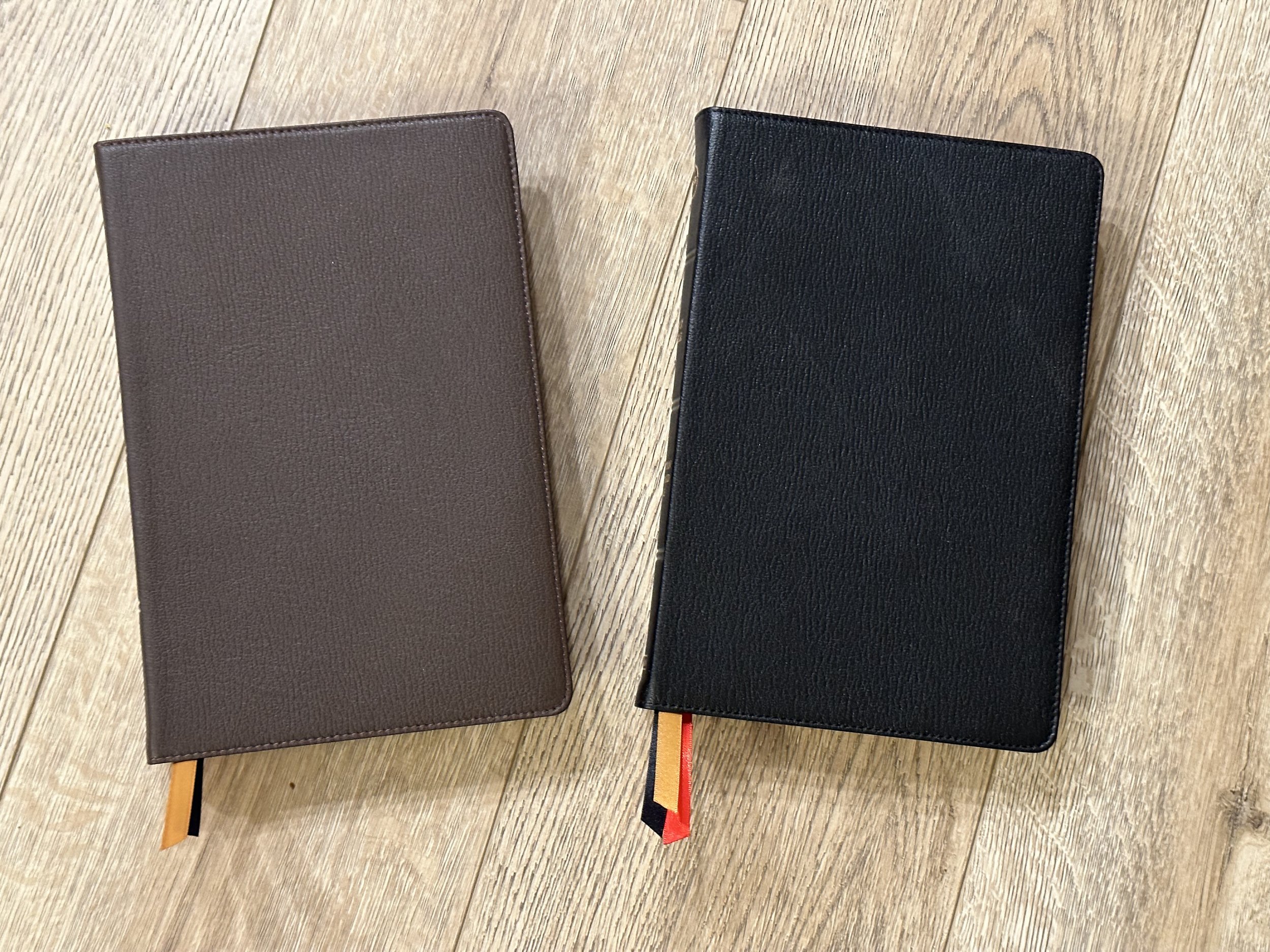 I’m reviewing both the black and brown goatskin options in this Bible. To be honest, they are very much the same aside from goatskin color and liner color. My black goatskin edition has some very cool scars on the front cover. The goatskin feels quite soft and I personally really like it. The size puts me in the mind of the Omega.