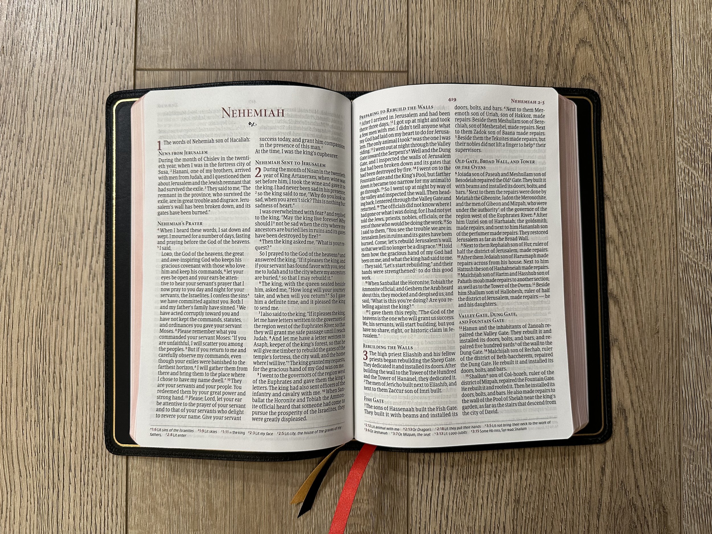 I love the layout of this Bible. It puts me in the mind of Crossway’s Omega, but with a bigger font size and no references (both of these pluses in my opinion). It’s a double column layout with an 11 point type size. Textual notes are at the bottom. Holman uses red accent colors in this Bible, which I am a fan of. Page headings, page numbers, chapter numbers, and verse numbers are all accented in red. Otherwise, all text—including words of Christ—are in black.