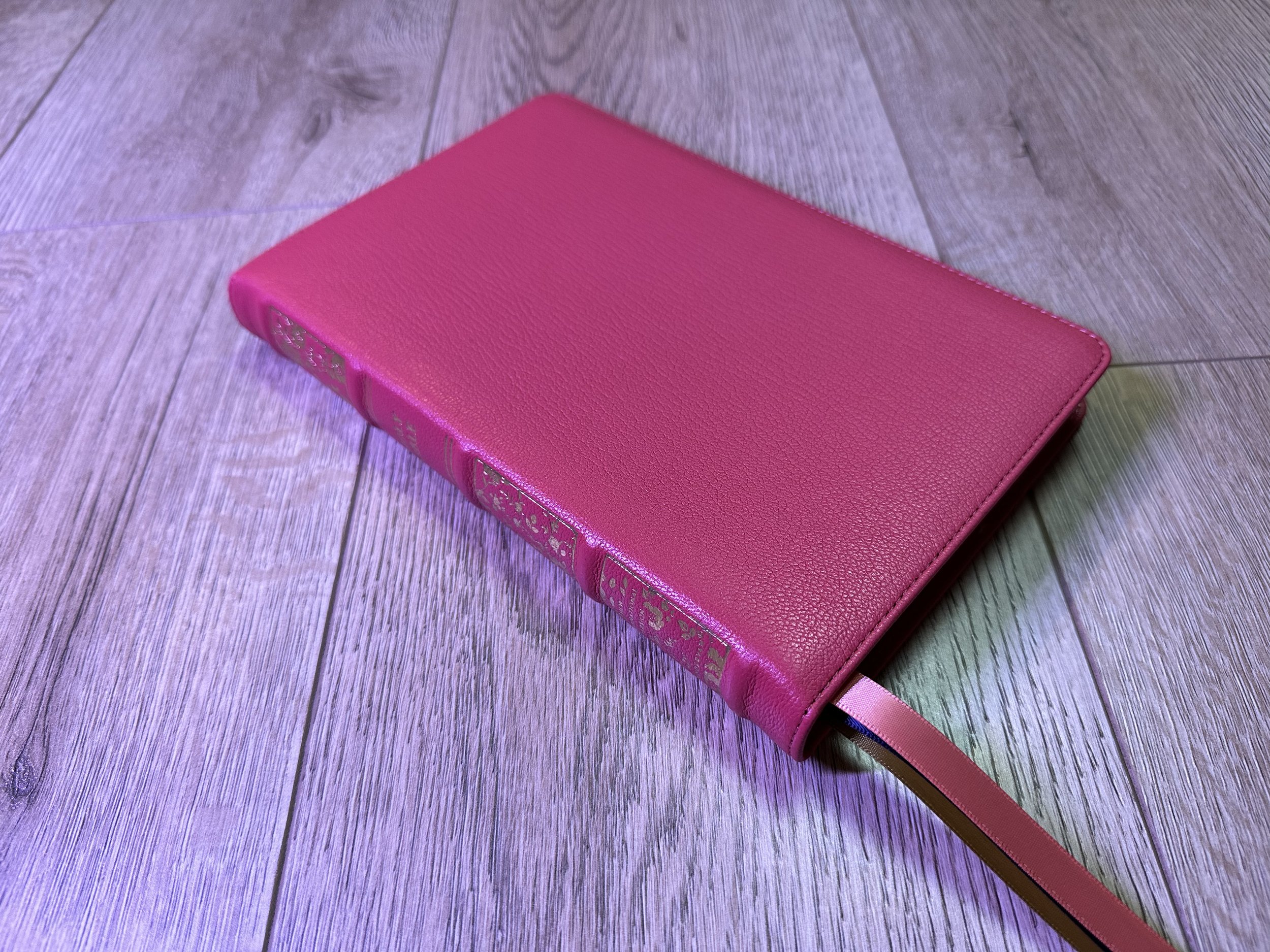 Matching the spine on this Bible is the art gilt. It has what are called gauffered edges. This means there’s a design on the gilt. The gilt is gold with a floral pattern on the page edges. Once again, the pictures really show the beauty of this Bible. The Bible also includes three beautiful ribbons in pink, navy, and gold. They’re double-sided satin, 3/8” wide, and are nice and long.