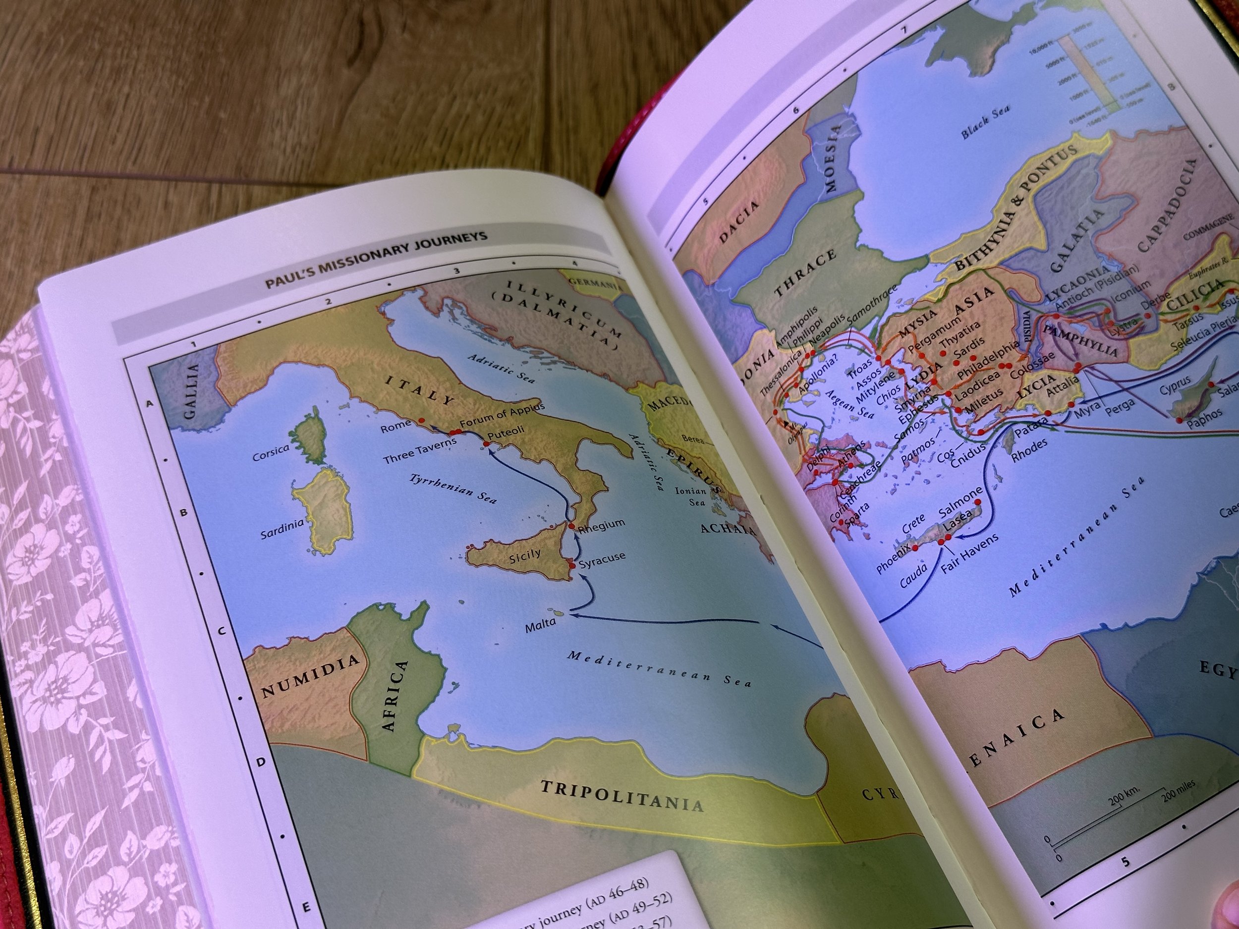 My only complaint with this Bible is Zondervan’s choice of accent color. They use a teal accent for book titles, chapter numbers, page headings, and subheadings. The accent color seems out of place with the rest of the beautiful colors on this Bible. Navy seems like it would have made a better choice. The back of the Bible contains full color maps.