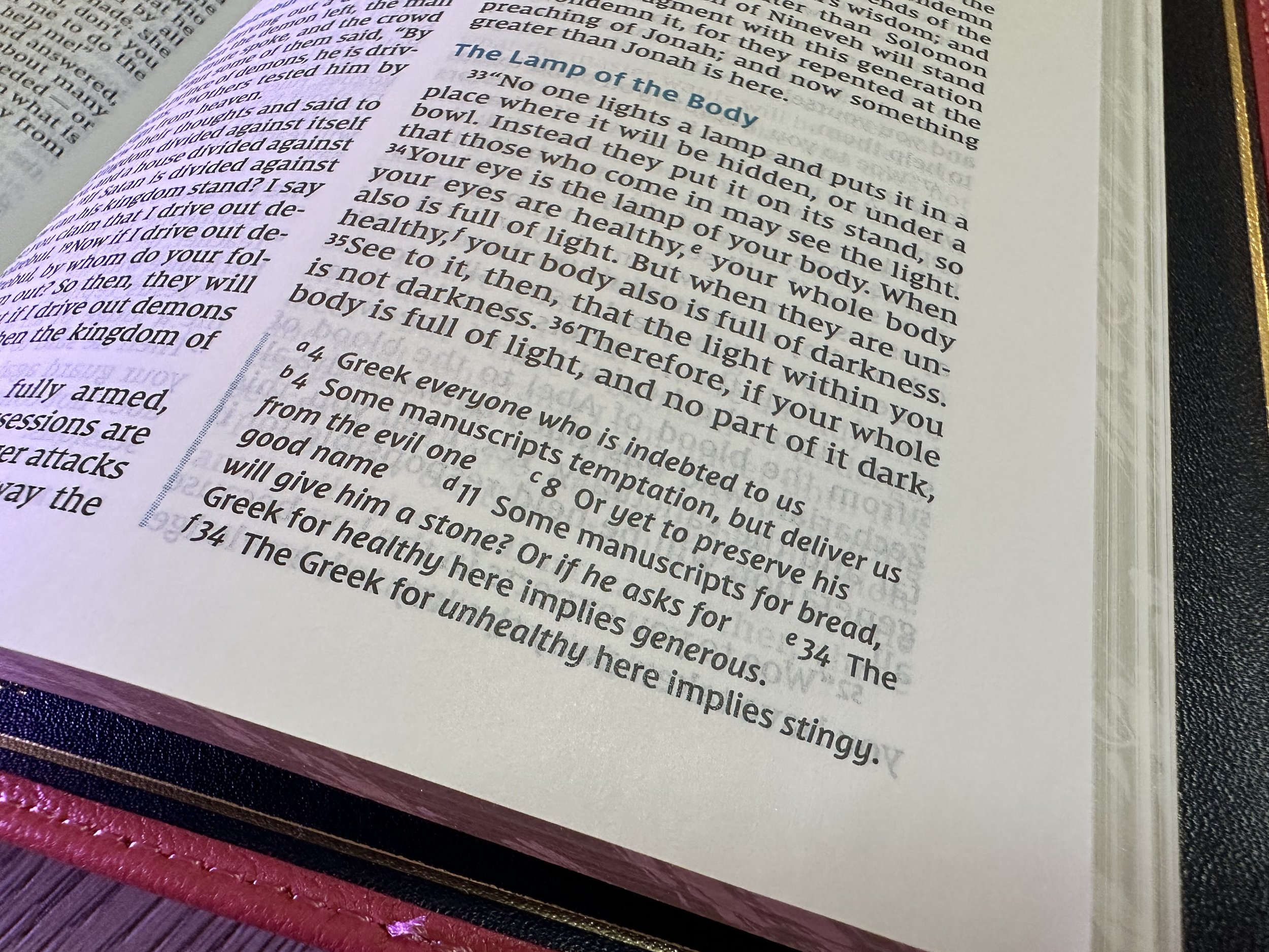 The paper in this Bible is a 36 GSM Premium European Bible Paper. It’s a double-column, paragraph layout. The type is 9 point in Zondervan’s NIV Comfort Print typeface. Words of Christ are in black.