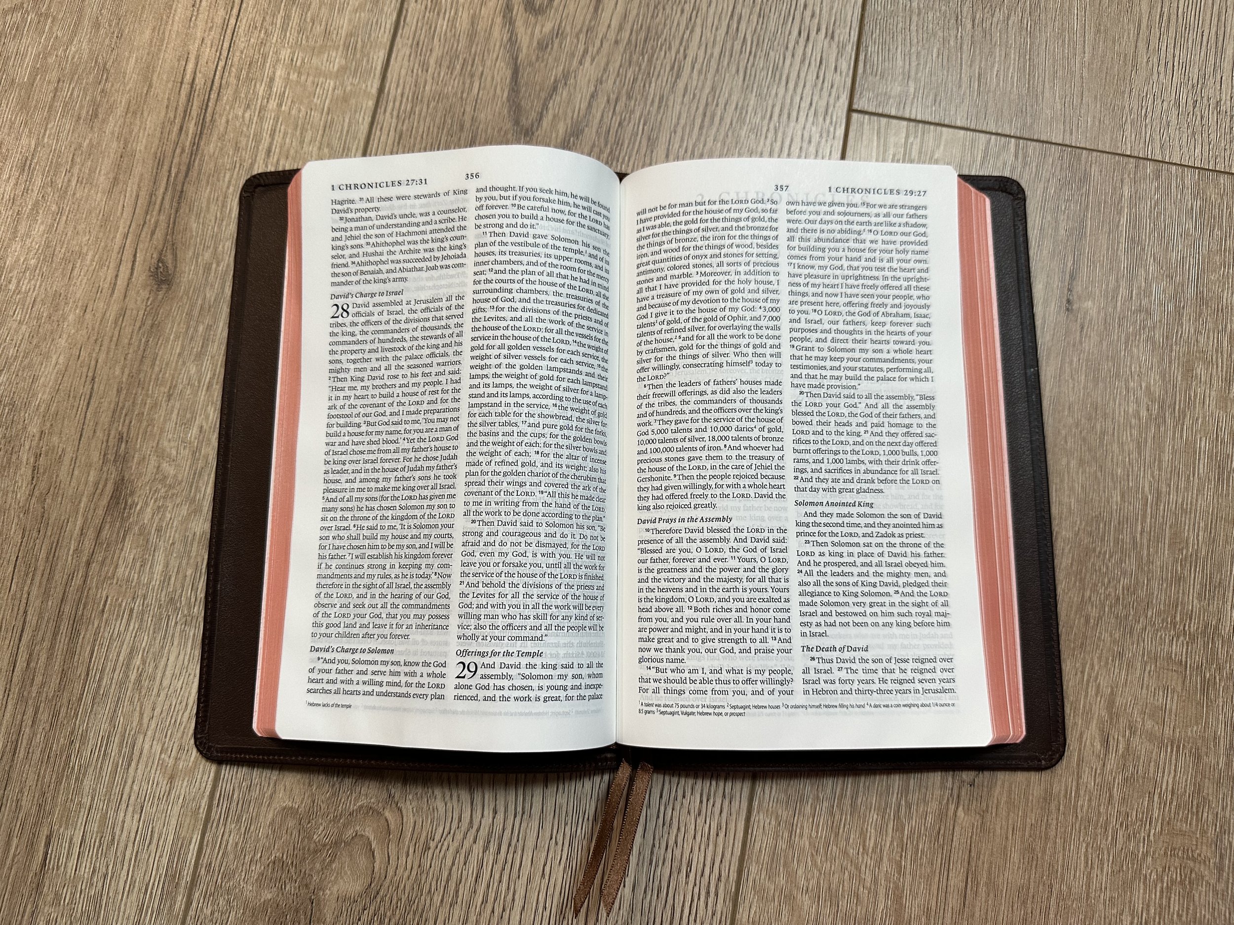 Inside there’s a brown calfskin liner with brown vinyl end sheets. Being an Heirloom, this Bible is Smyth-sewned and edge-lined for durability. These are features you definitely want since you’re going to put this Thinline through its paces!