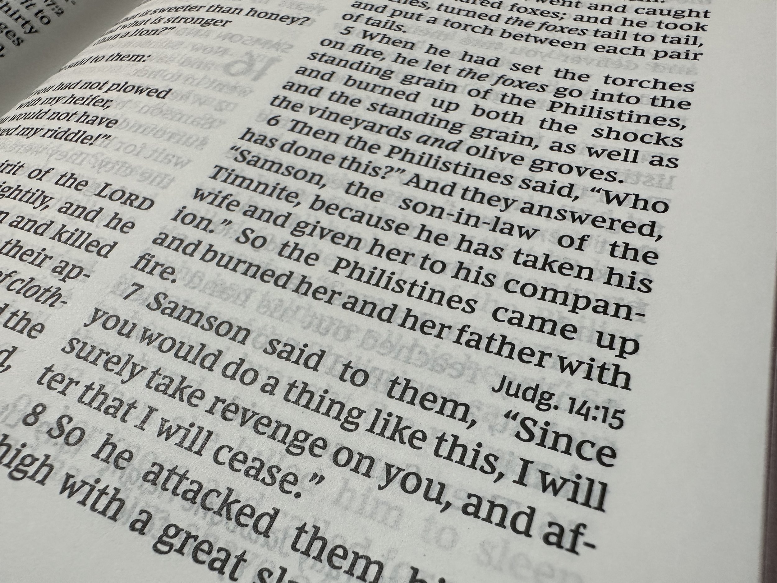 The paper in the Premier Collection is consistently fantastic. It’s a 36 gsm European Bible Paper. It’s white and very opaque. The text is line matched. The type is a 10.5 point in Thomas Nelson’s NKJV Comfort Print typeface. I love a bigger font and this Bible knocks that out of the park. It looks great. Words of Christ are in red.