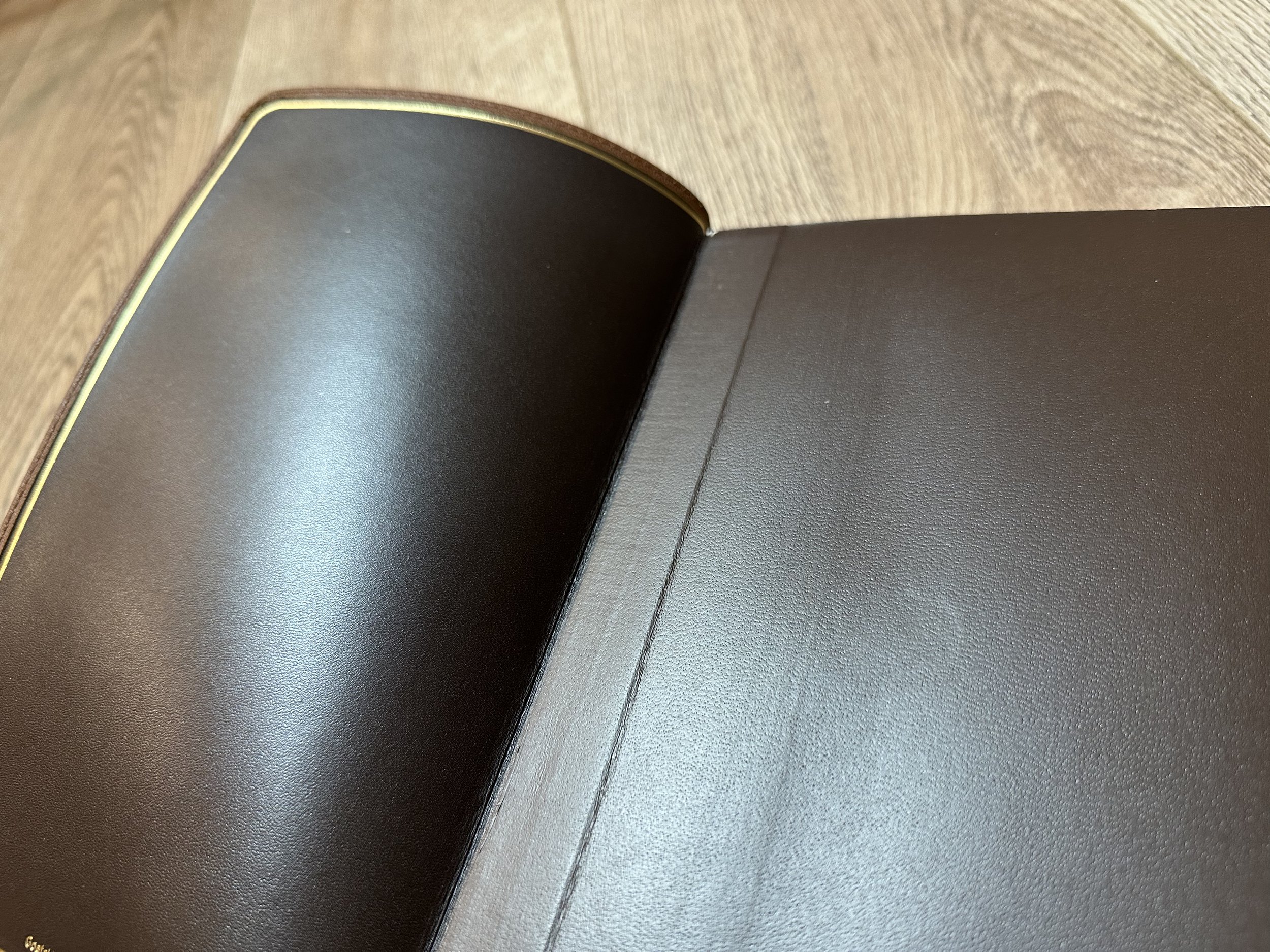 Inside is a dark brown calfskin liner with matching vinyl end sheets. There’s a gold perimeter gilt line. The Bible is Smyth-sewn and edge-lined for durability.