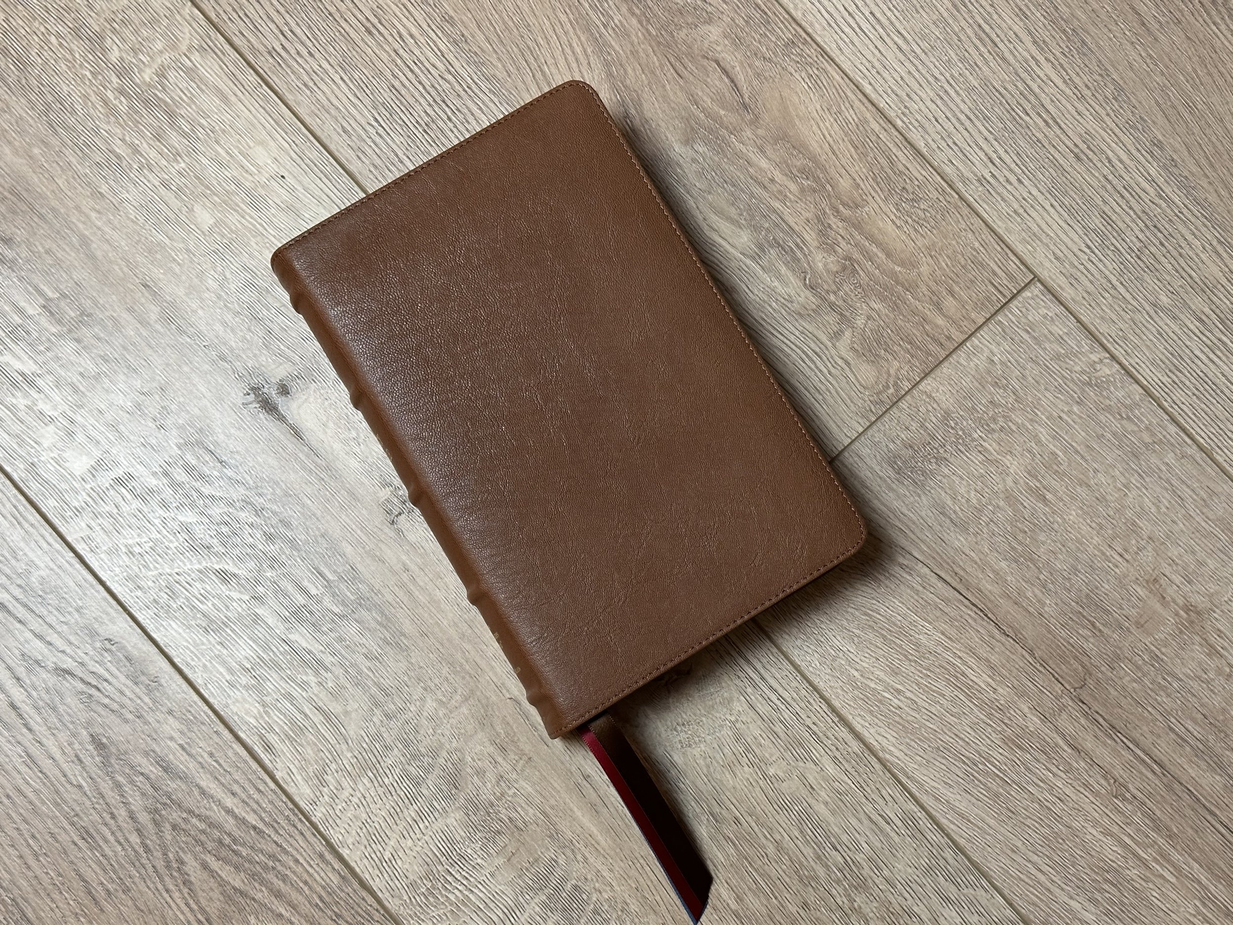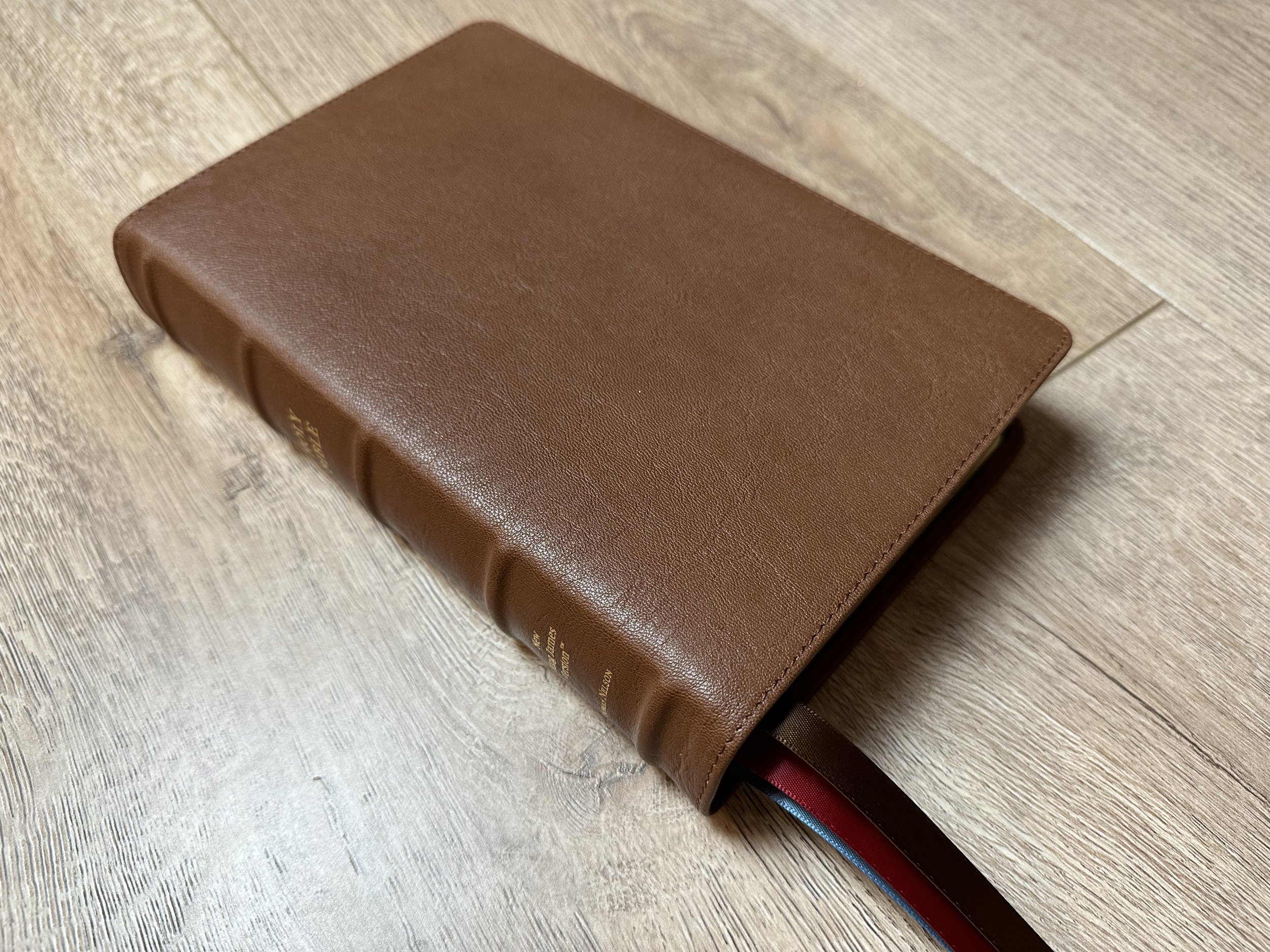 This Bible comes in a nice brown goatskin. It’s almost tan. The leather feels nice, but is a little ore stiff than I’d expect. I really like the size of this Bible. It’s a bit thicker, but the height and width feel just right. There are five raised hubs on the spine and in gold are the words, “HOLY BIBLE”, “New King James Version”, and “THOMAS NELSON”.