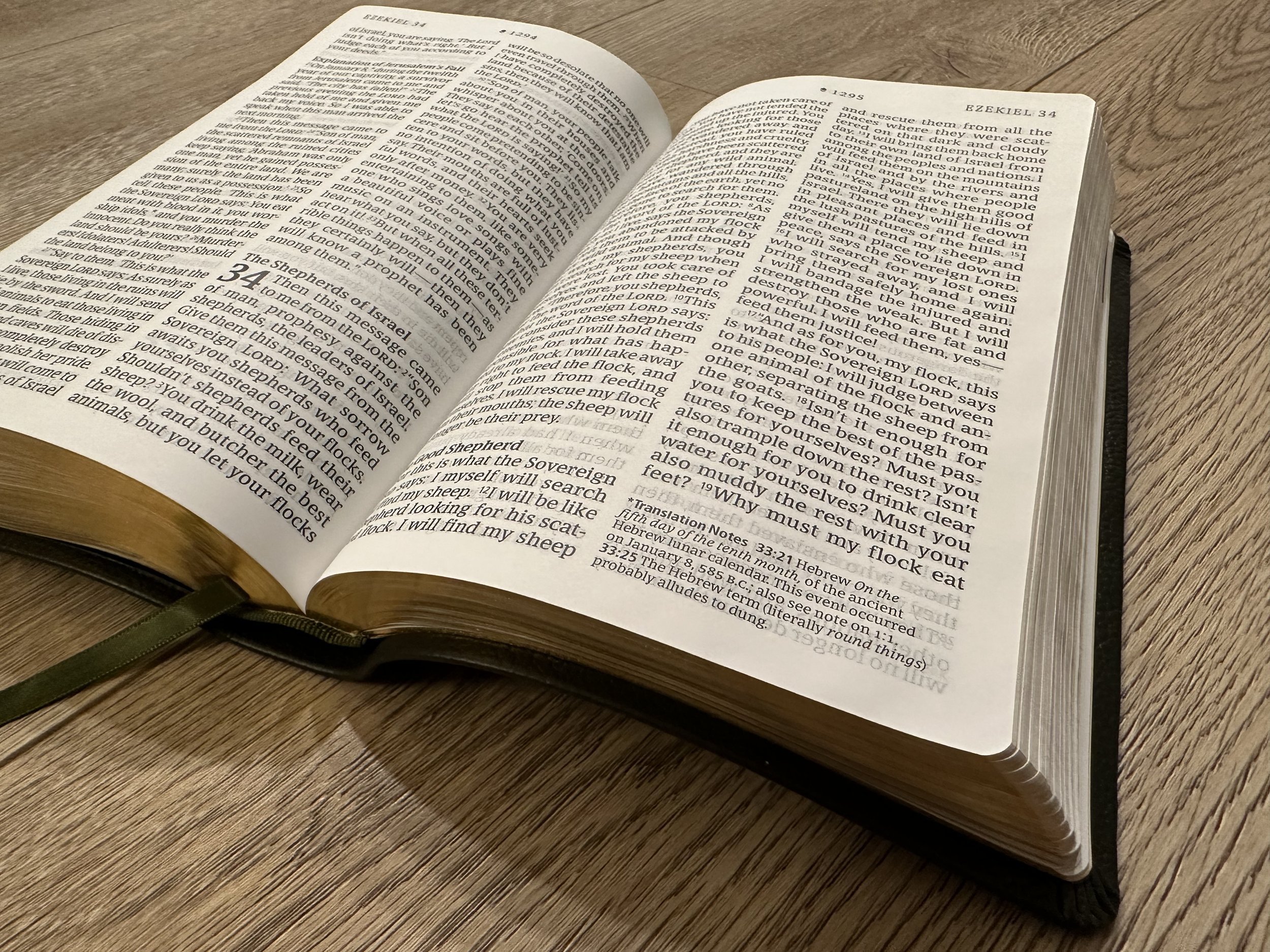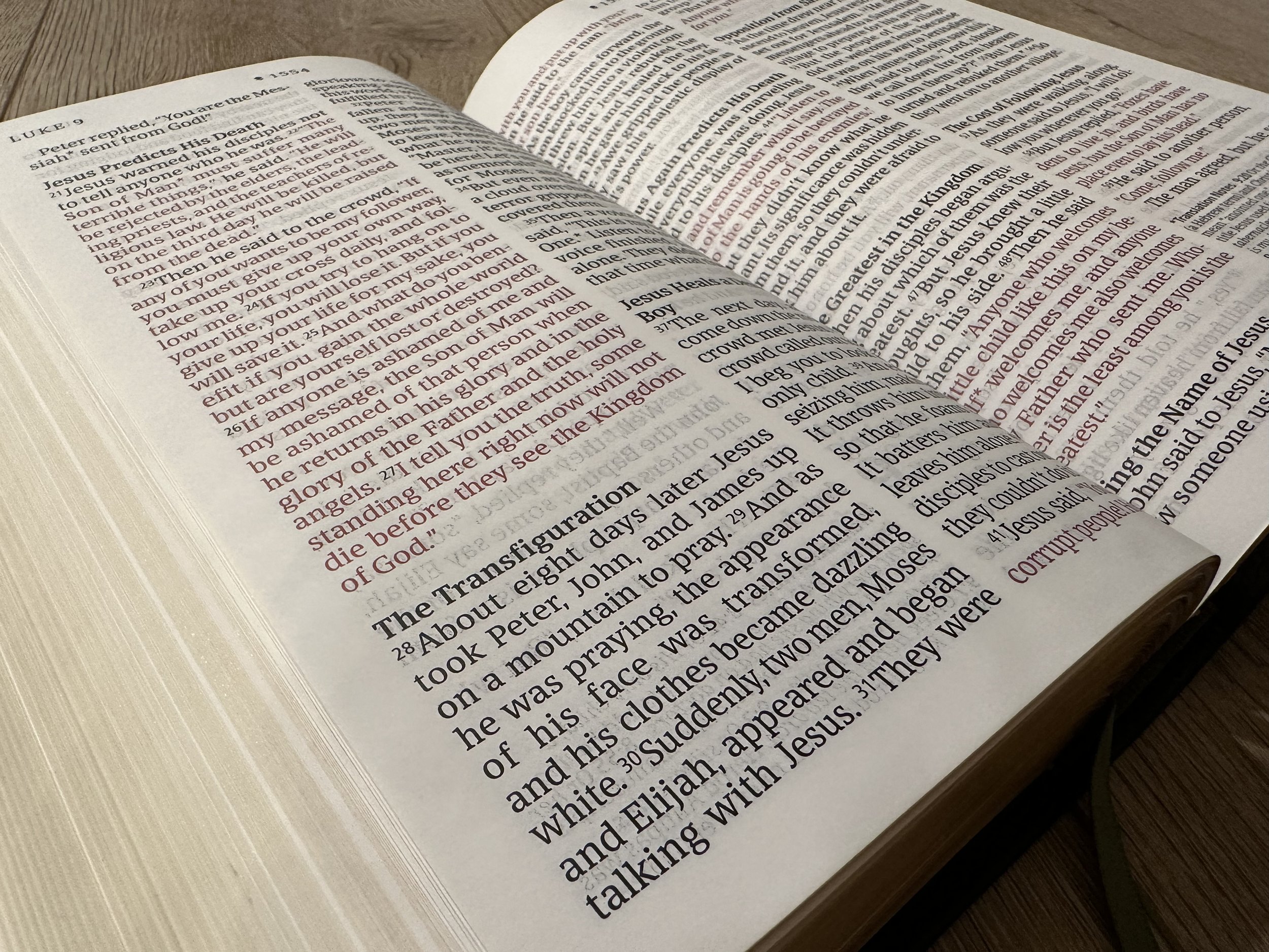 The paper in this Bible doesn’t seem thick, but ghosting is minimal and the text seems to be line matched as best I can tell. The Bible has a two column layout with words of Christ in red. There are thousands of cross-references. References and translation notes are located at the bottom right of the right side page. The font is a 10.25 point, which is very readable.